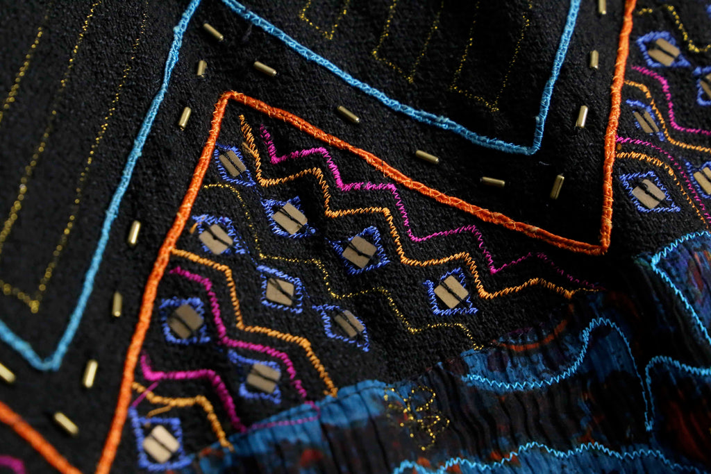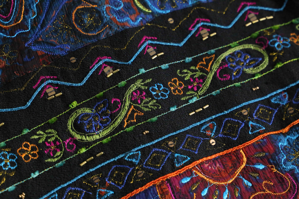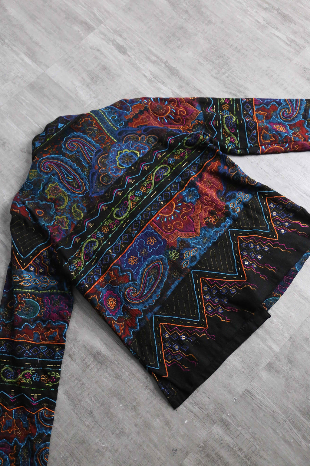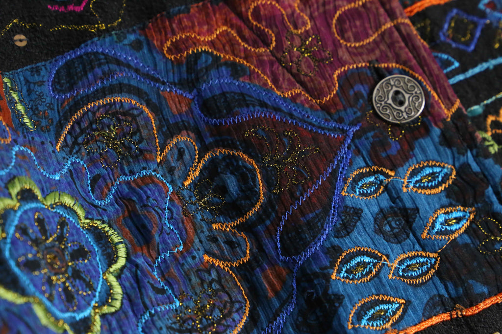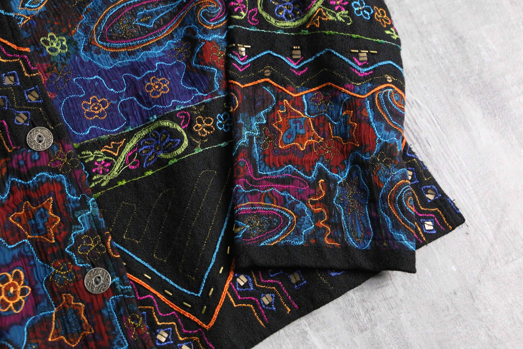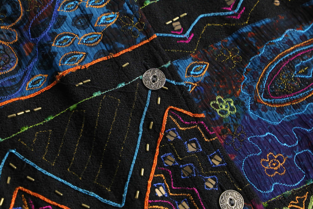 ブラックを基調に、ブルーやレッド、グリーン、オレンジなど毒気のあるビビッドなカラーを効かせ、エスニックやジオメトリック、ペイズリー調のモチーフを複雑に組み合わせた総柄デザインが強い存在感を放ちます。コットンレーヨンの混紡で、コットンのナチュラルな風合いに、レーヨン特有の滑らかさと落ち感が加わり、軽やかで肌なじみの良い着用感が魅力。
