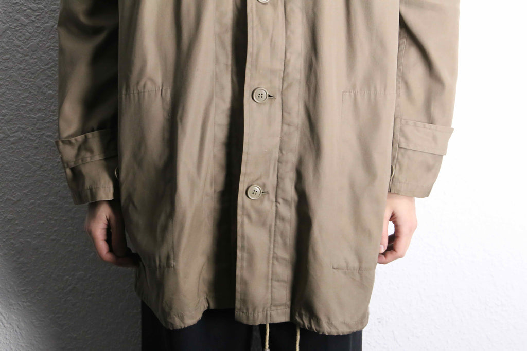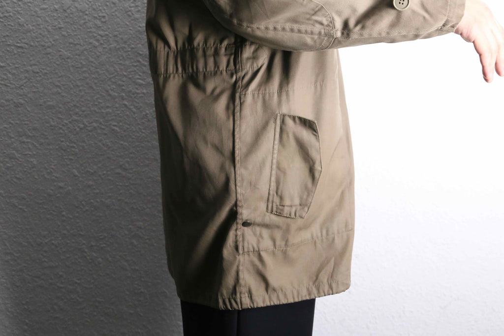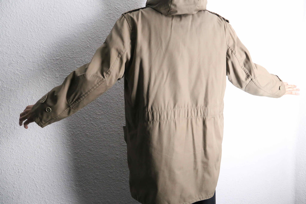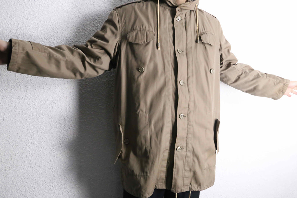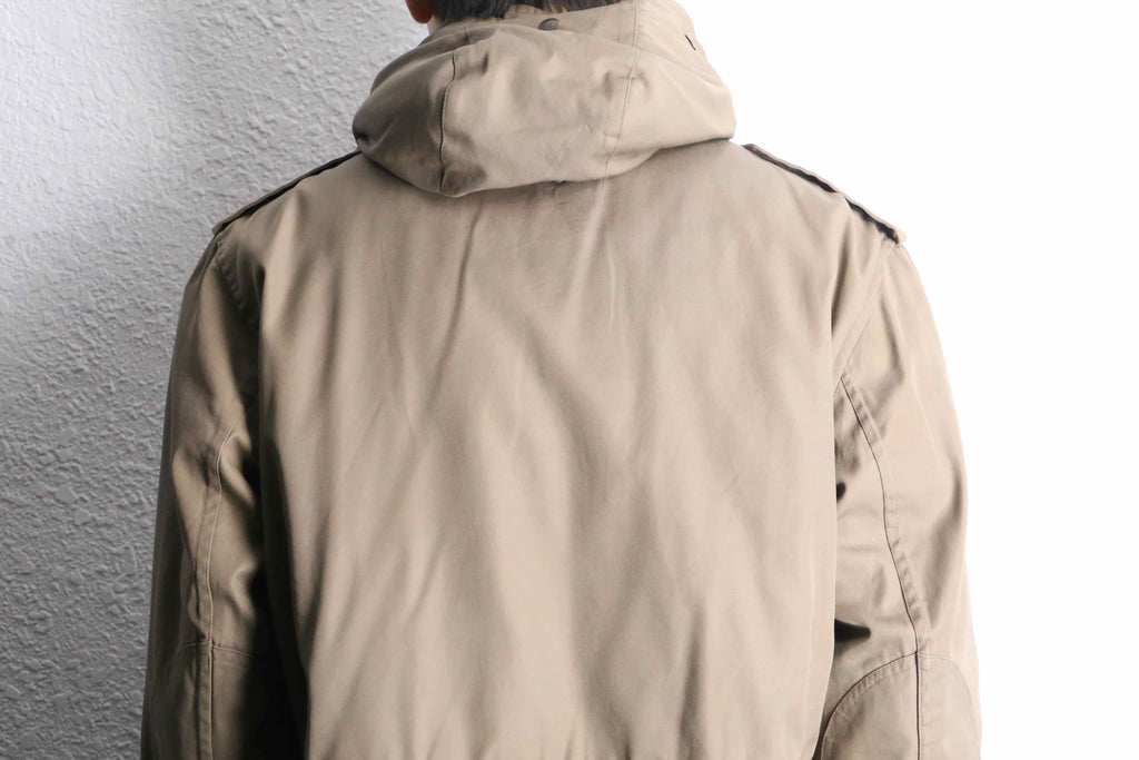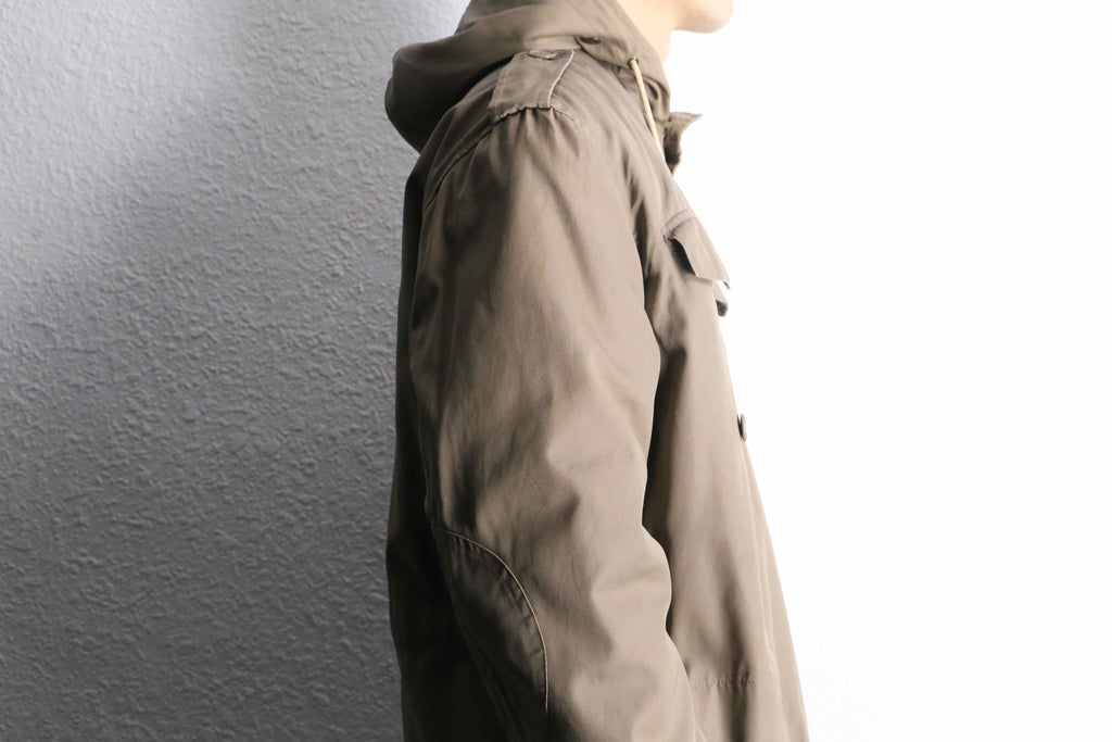 ドイツ軍のミリタリーアイテムと思われる、取り外し可能なアームまで伸びるボアライナーが付属したフィールドジャケット。フルジップフロントとフラップ付き胸ポケットが2つ、エルボーパッチにフードと裾にはドローコードを搭載。ミリタリーアイテムの良さが詰まった1着。