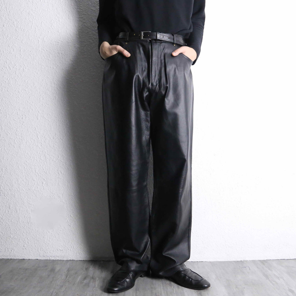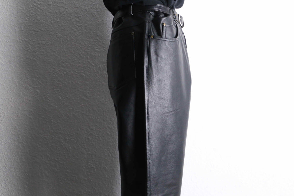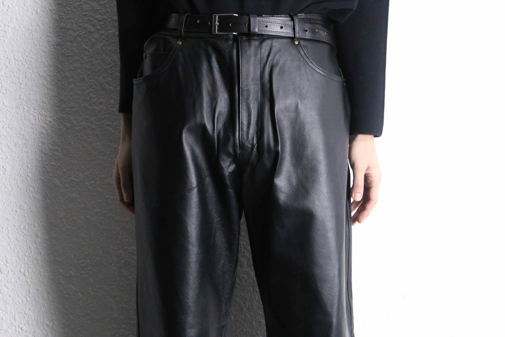 ウエストはベルトで絞ることで腰位置が安定し、そこから腿にかけて余白を残しながら、わずかにラウンドを描くように落ちるシルエット。直線的すぎないラインが、レザー特有のしなやかさと相まって、動きの中に自然な陰影を生みます。
