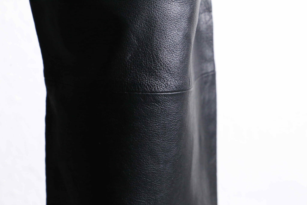しっとりとした艶を帯びた、オールレザーのスラックトラウザーズ。見た目の重厚さとは裏腹に、実際は軽く、柔らかさのあるレザーが使われています。