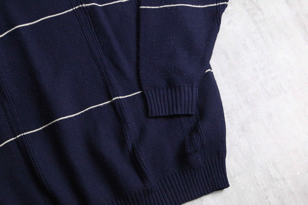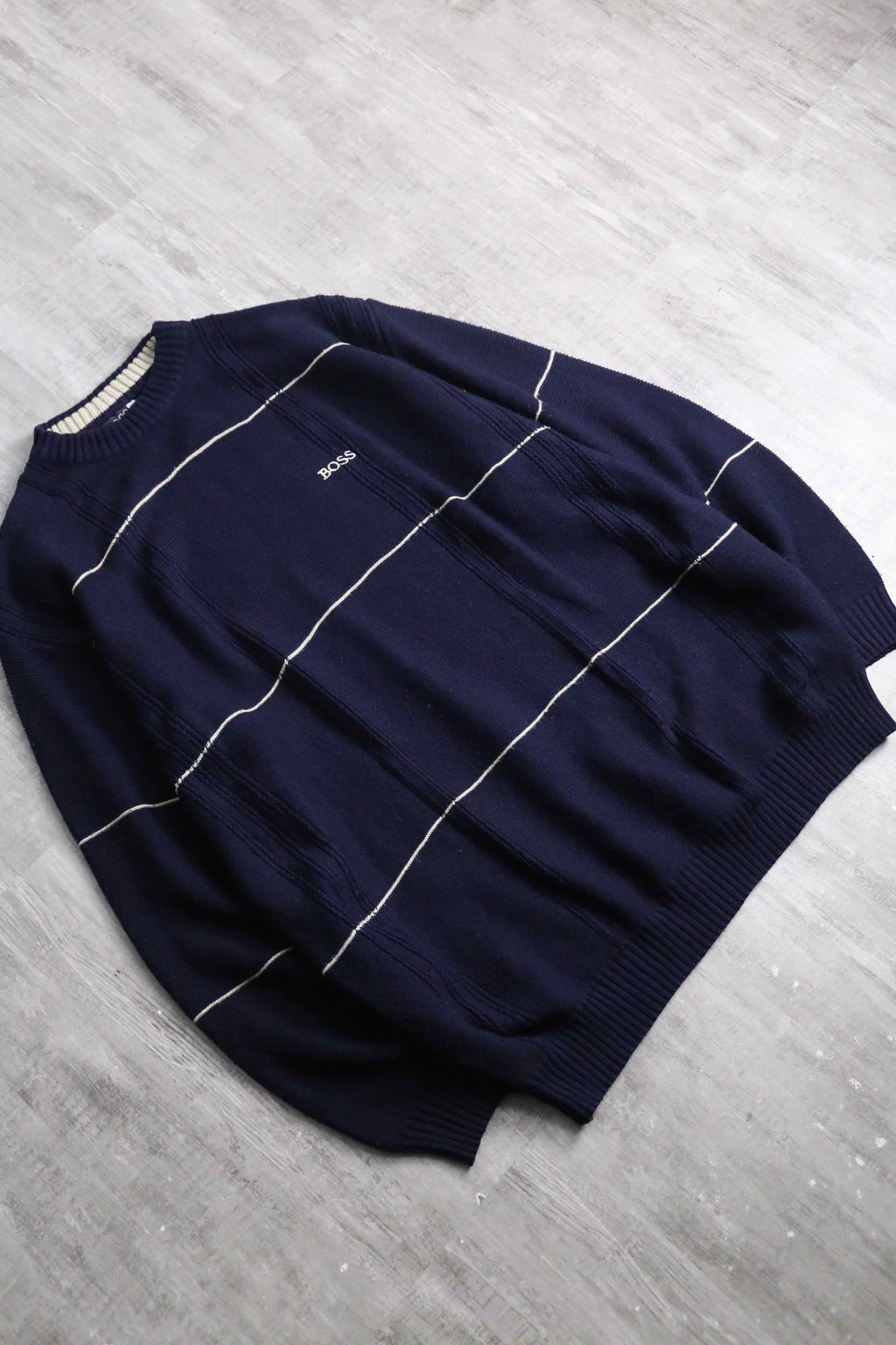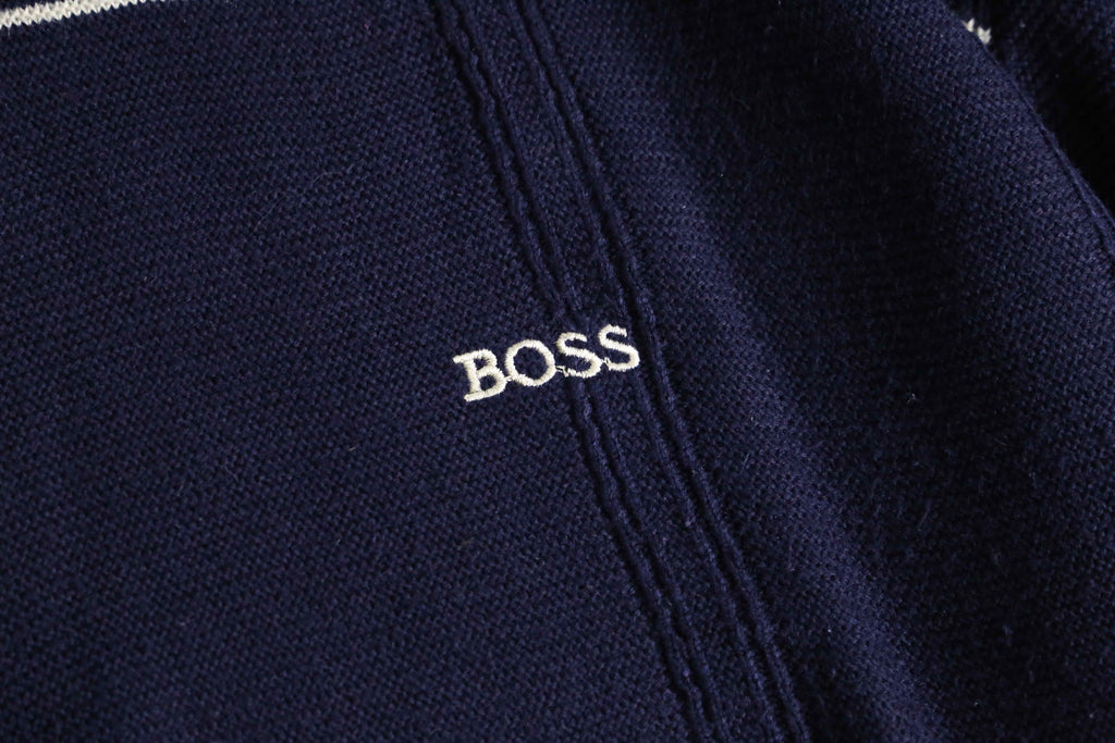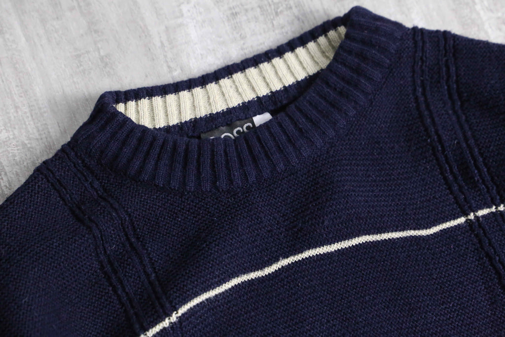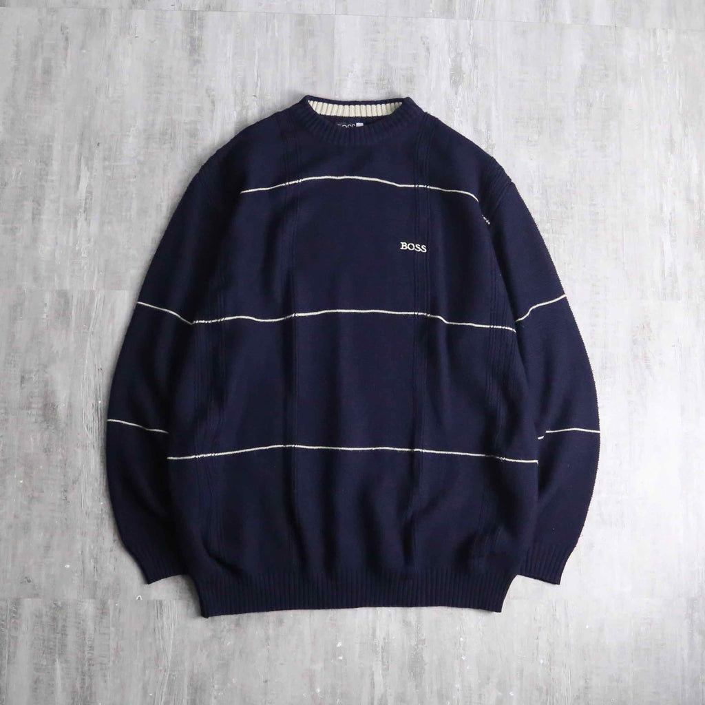 BOSS HUGO BOSSのコットンニット。ネイビーをベースに、間隔を取って走る細いホワイトストライプが、全体に静かなリズムを与えています。