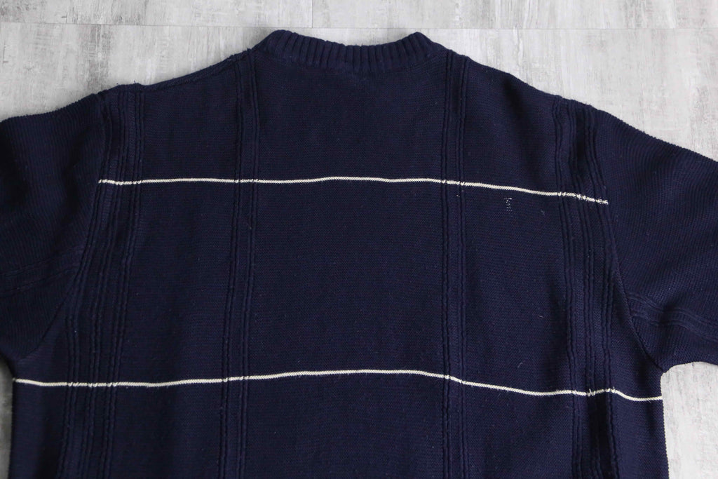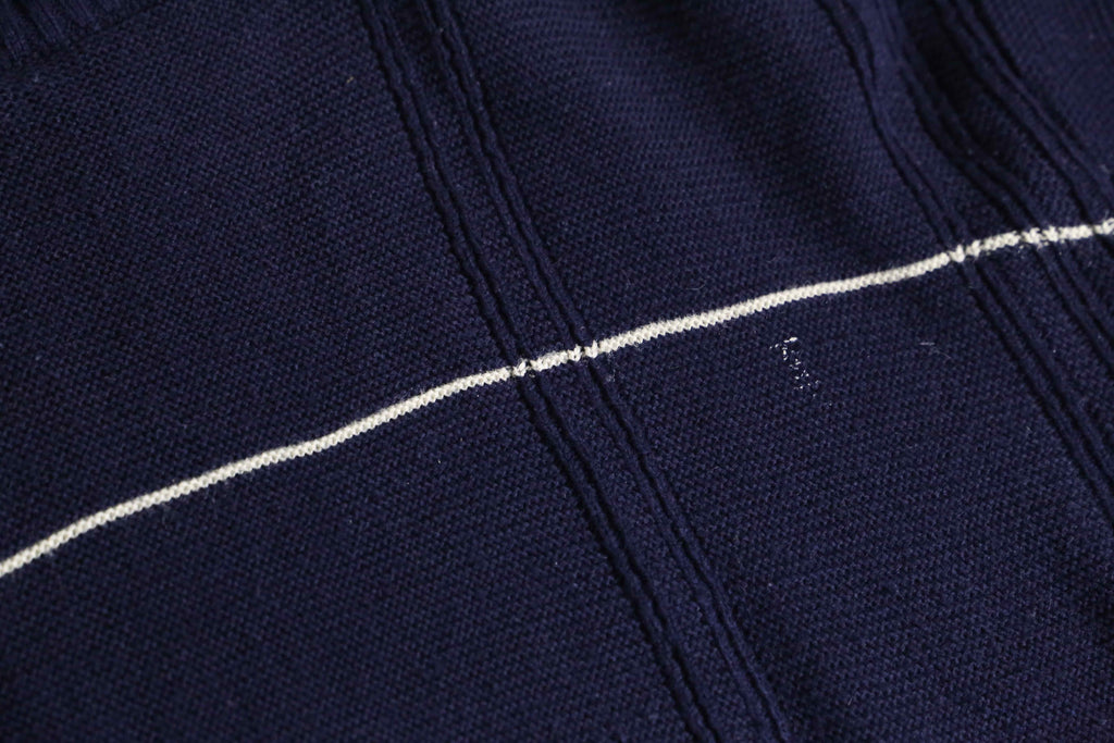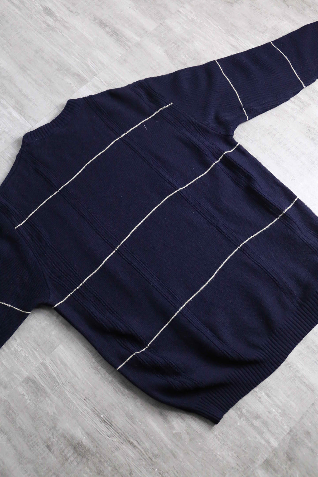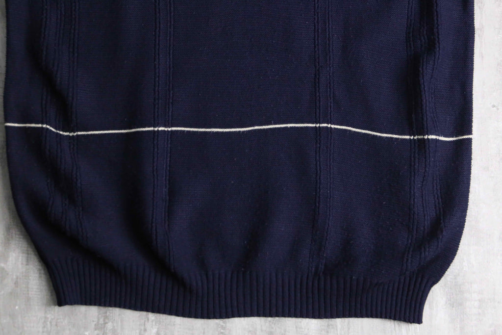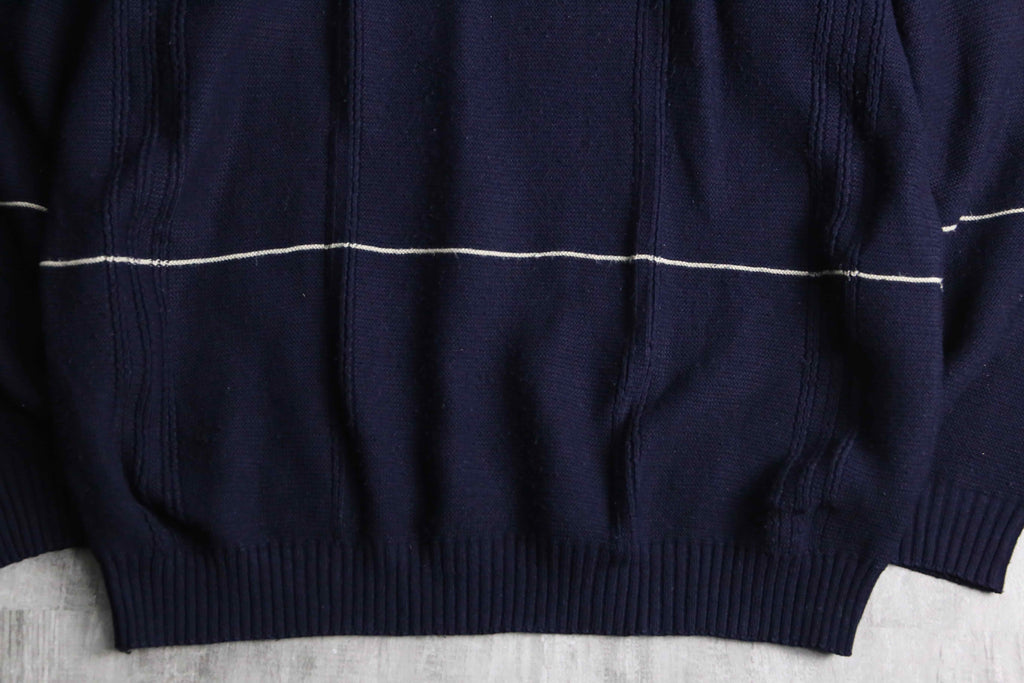 BOSS HUGO BOSSのコットンニット。ネイビーをベースに、間隔を取って走る細いホワイトストライプが、全体に静かなリズムを与えています。