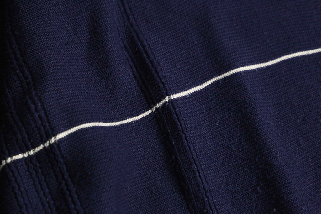 コットン100%の編み地は、厚すぎず薄すぎず。ニット特有の甘さは控えめで、スウェットに近い感覚で気負わず着られる質感です。着丈はやや長く、身幅もしっかり取られており、体を包み込むというより、自然に落ちるシルエット。胸元のロゴは小さく、あくまで控えめ。ストライプと縦方向の編みが表情をつくり、ブランドを前に出しすぎない佇まいに仕上がっています。