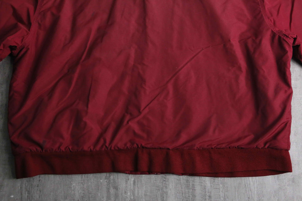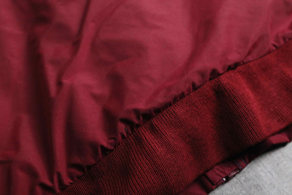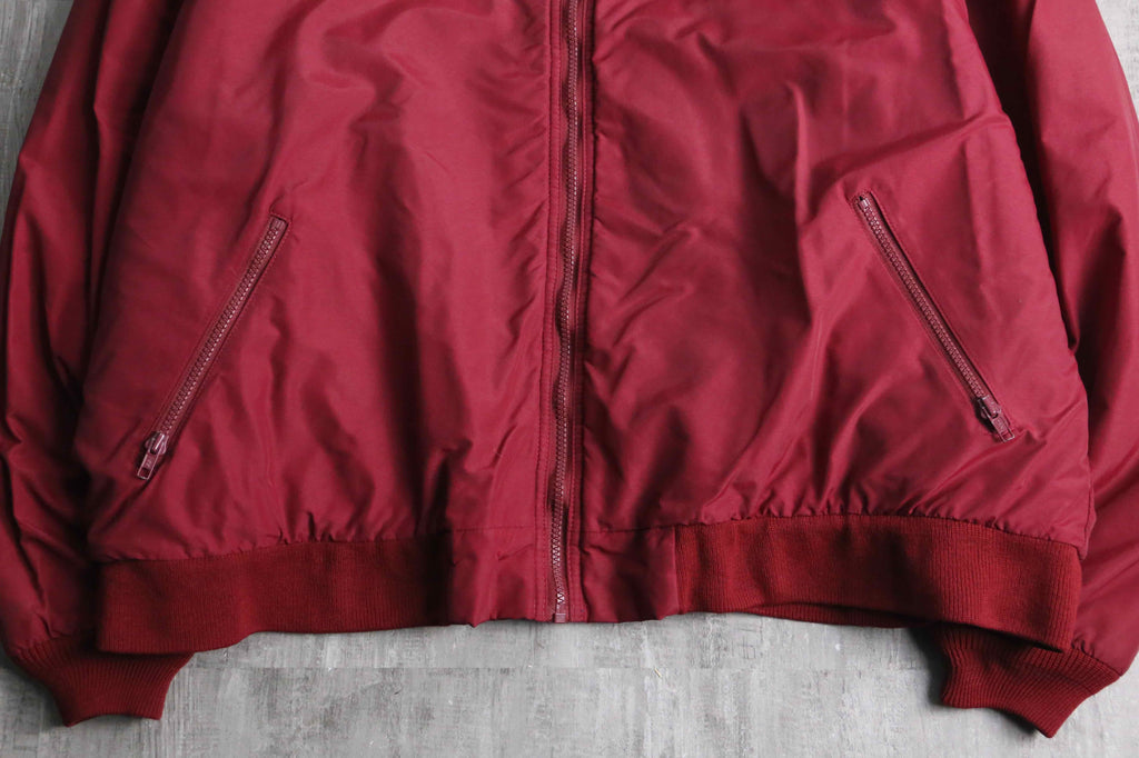 落ち着いた赤を纏ったジップジャケット。彩度は控えめで、光の当たり方によってトーンがわずかに変わる色味です。