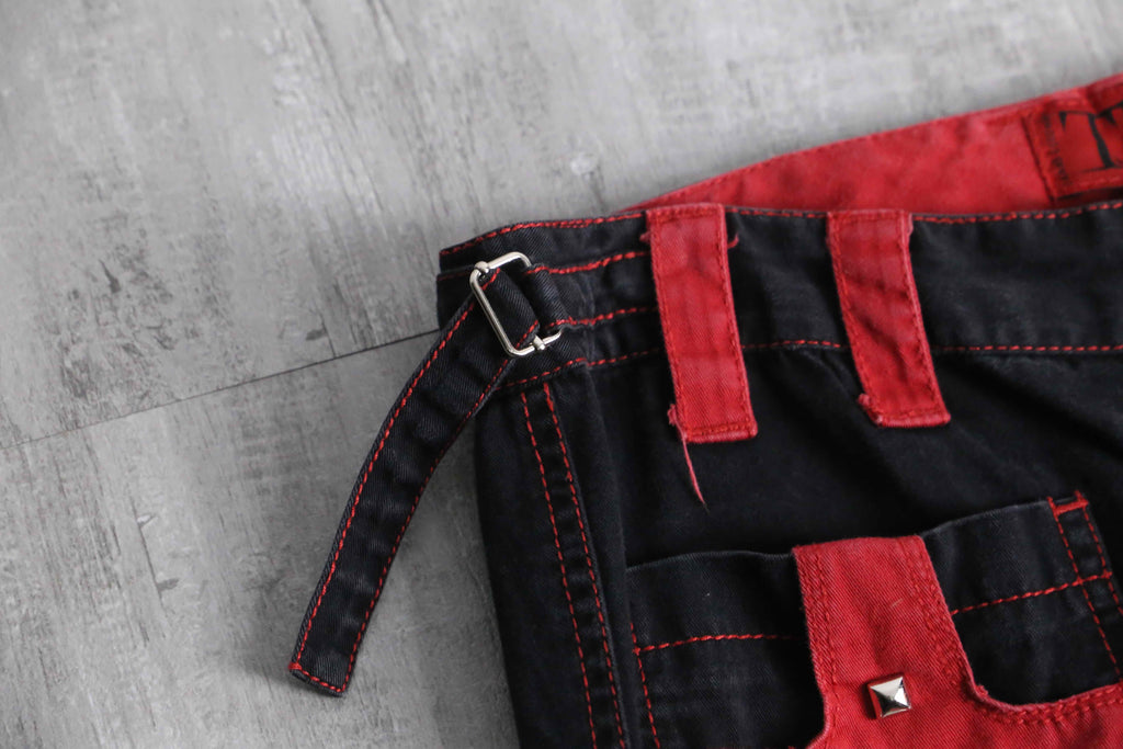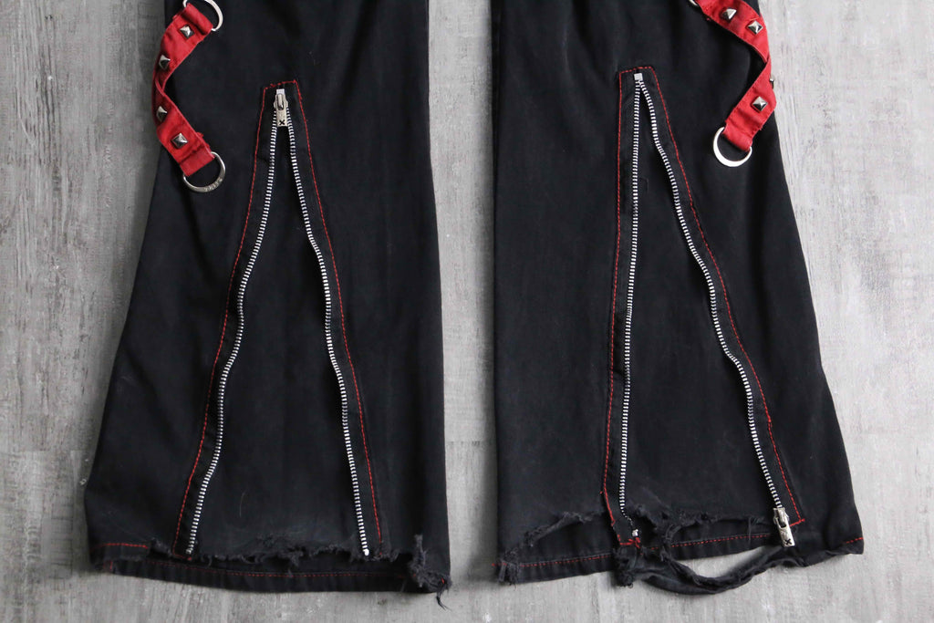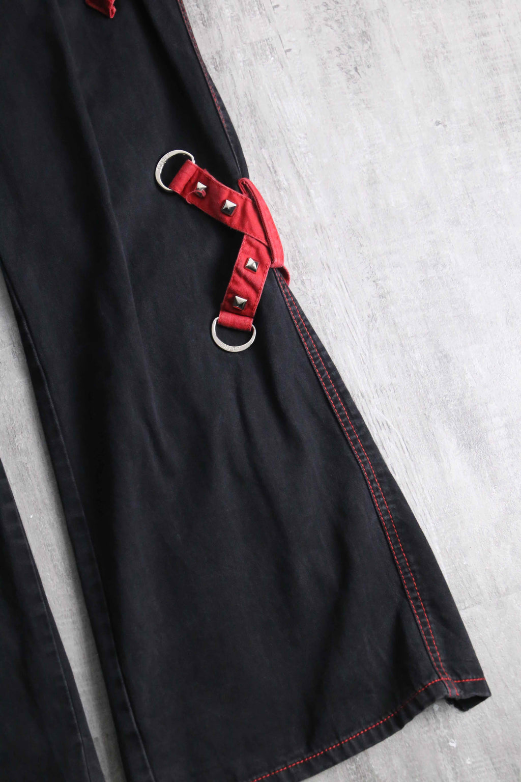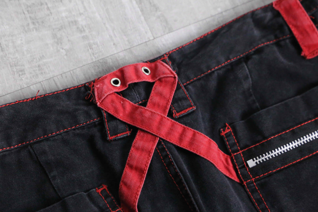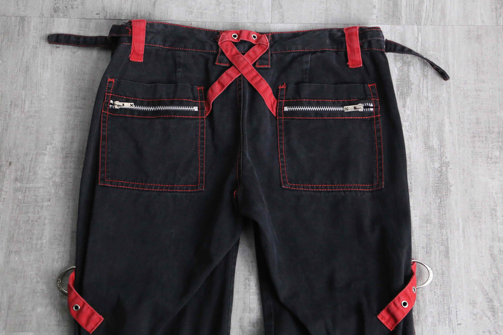 ブラックボディに配された赤のストラップワーク。十字を思わせる配置やスタッズ、Dカンといった要素が重なりながらも、全体のバランスは崩れていません。シルエットは緩やかなフレア。腰まわりは比較的すっきりとしており、裾に向かって自然に広がるラインです。コットン素材ならではの張りがあり、穿き込むことで少しずつ生地が馴染んでいきます。