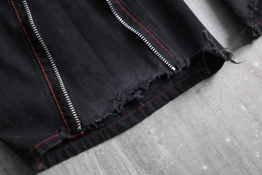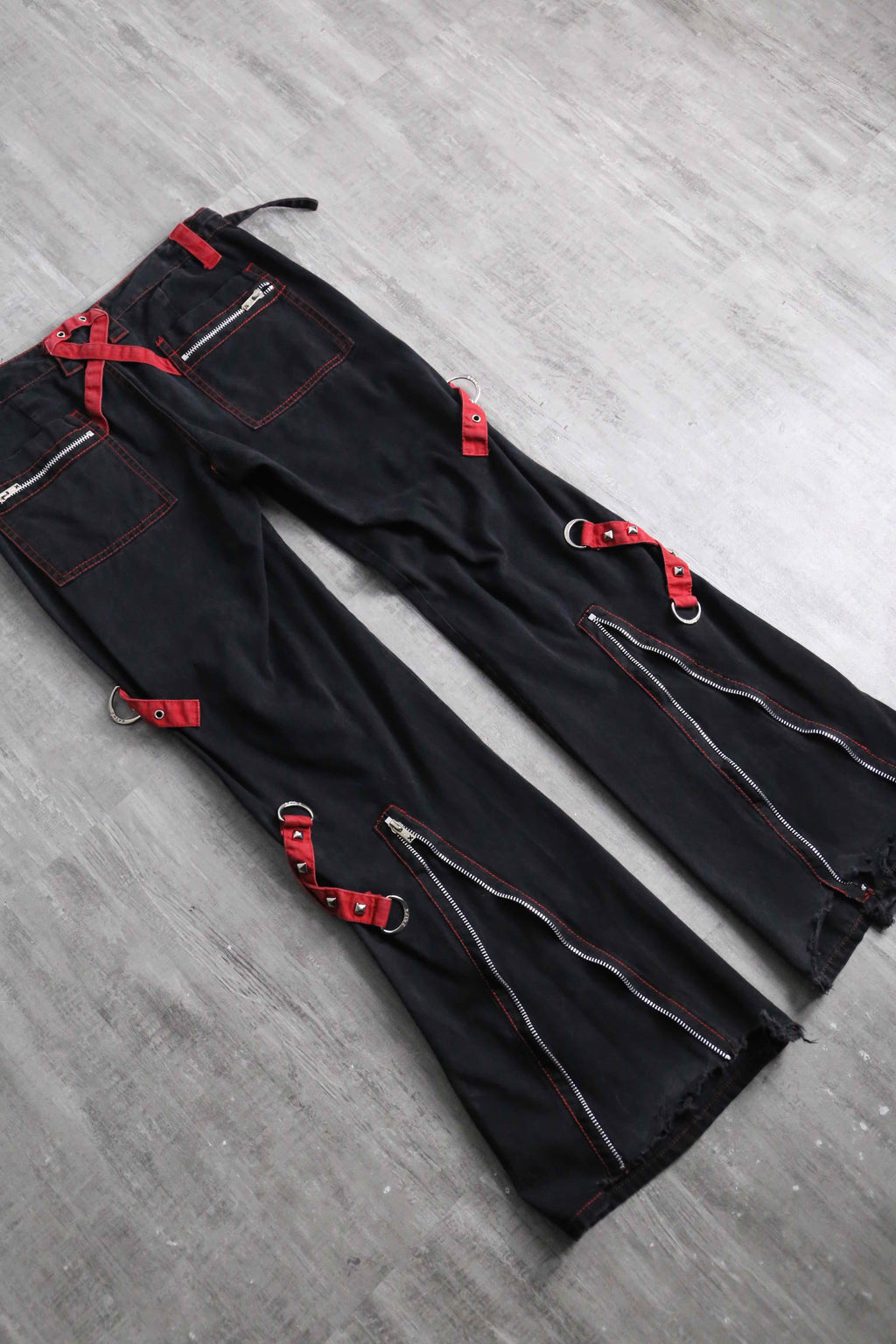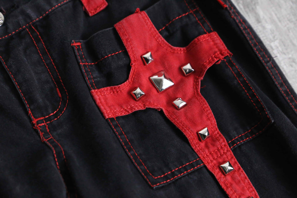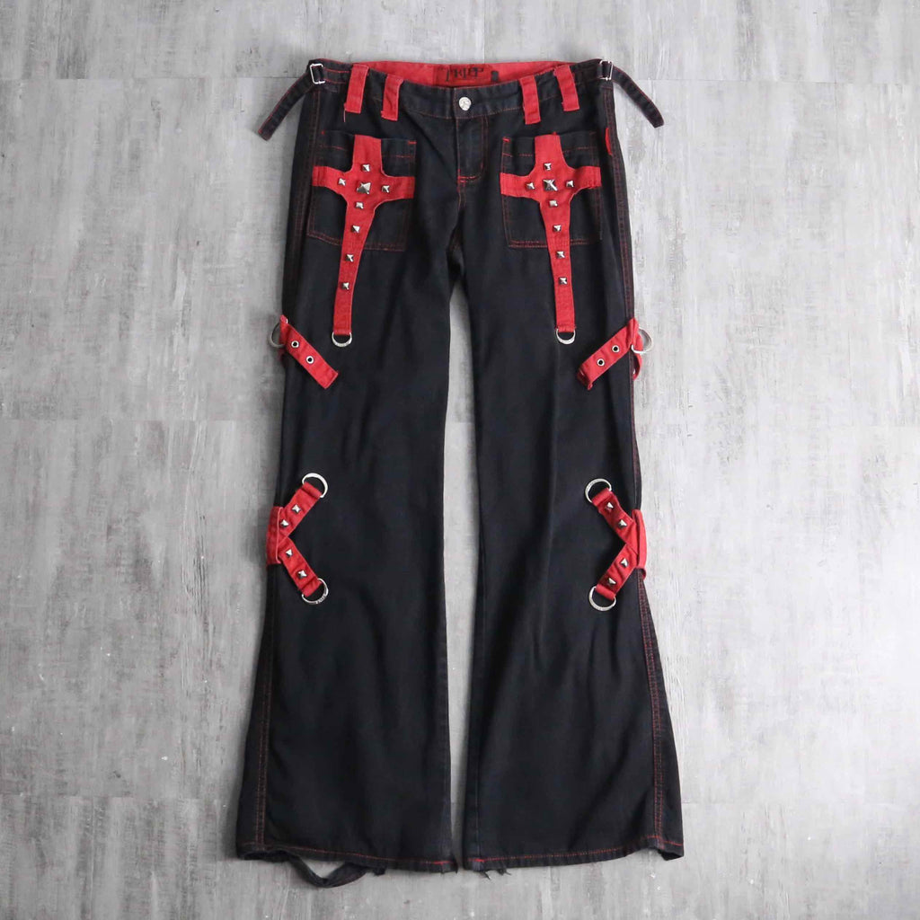 ブラックボディに配された赤のストラップワーク。十字を思わせる配置やスタッズ、Dカンといった要素が重なりながらも、全体のバランスは崩れていません。シルエットは緩やかなフレア。腰まわりは比較的すっきりとしており、裾に向かって自然に広がるラインです。コットン素材ならではの張りがあり、穿き込むことで少しずつ生地が馴染んでいきます。