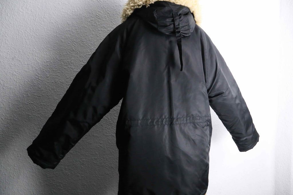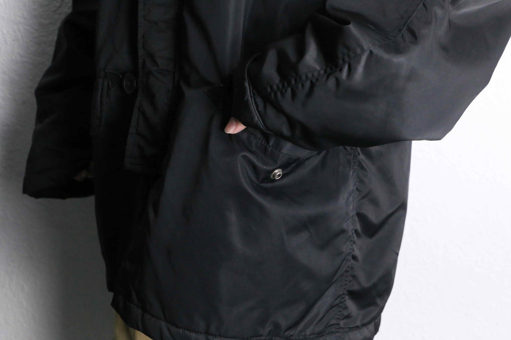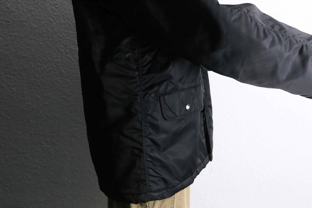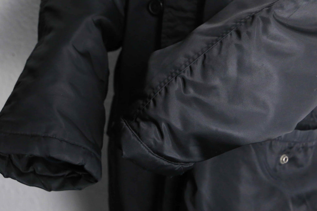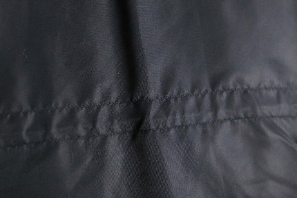 シェルはナイロン素材。光を抑えたマットな黒で、主張は控えめなのに存在感はしっかりある。身体を覆うようなレングスと、余白を持たせたシルエットが特徴。ラグランスリーブならではの落ち方で、体型を選ばず自然に馴染む。無骨さはあるが、軍モノ特有の威圧感はなく、どこか静か。