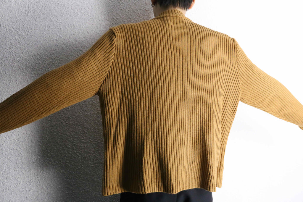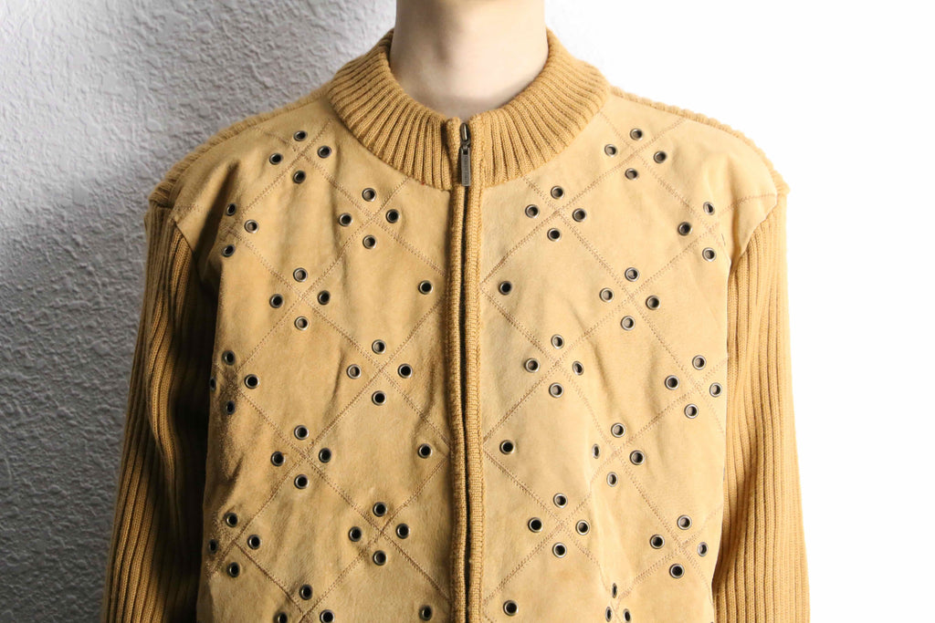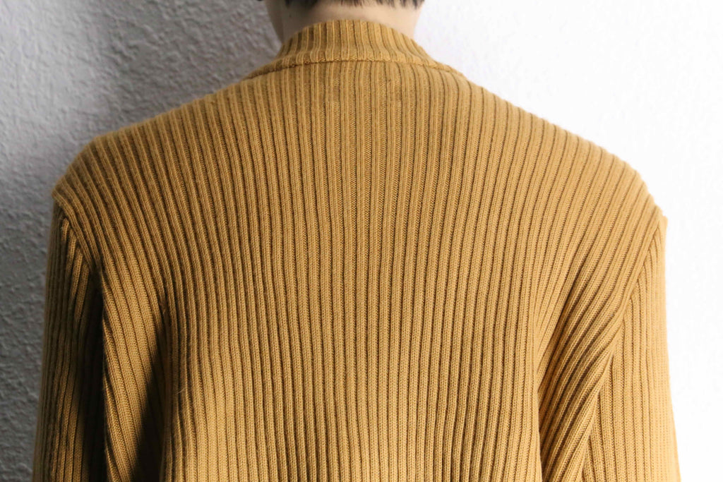 乾いたマスタードカラー。光を鈍く受け止めるマットな質感が、金具の主張を一段落ち着かせている。袖はラミー混のリブ編み。スエードの柔らかさに対して、ややドライな編み地。異素材の切り替えが奥行きをつくる。身幅には適度なゆとり、着丈は収まりよく。デザインは強めだが、シルエットは扱いやすい。
