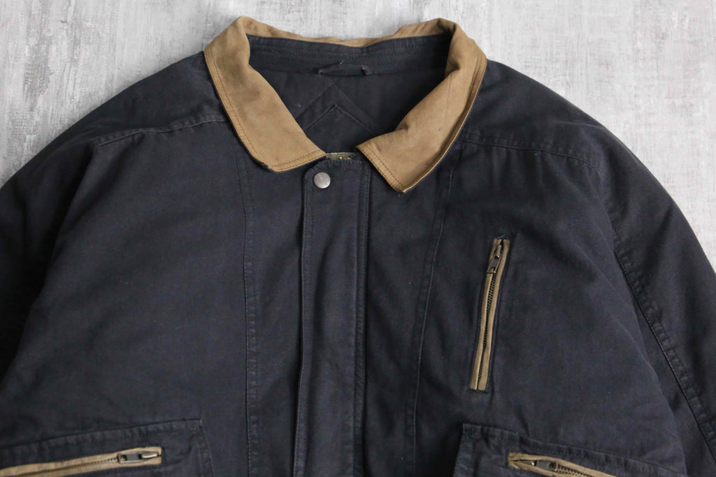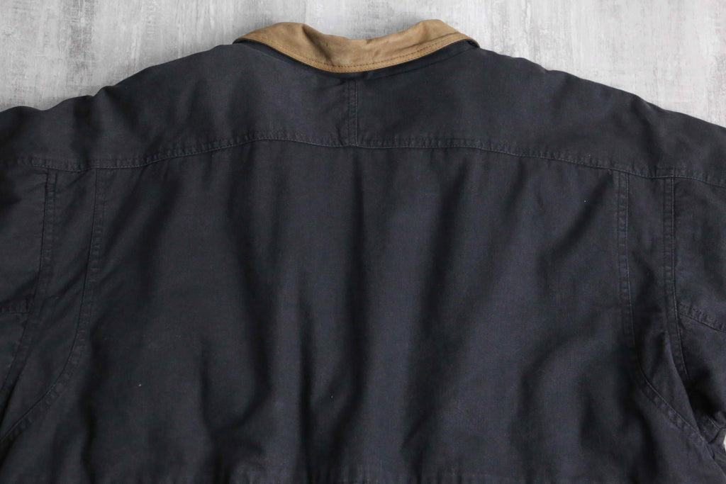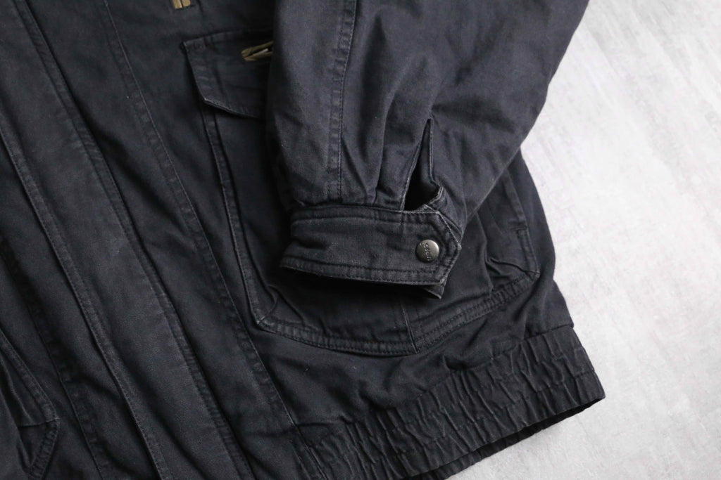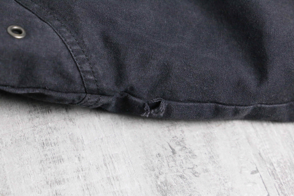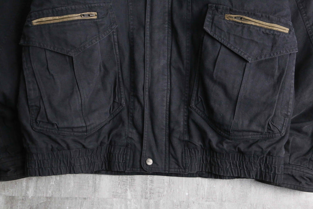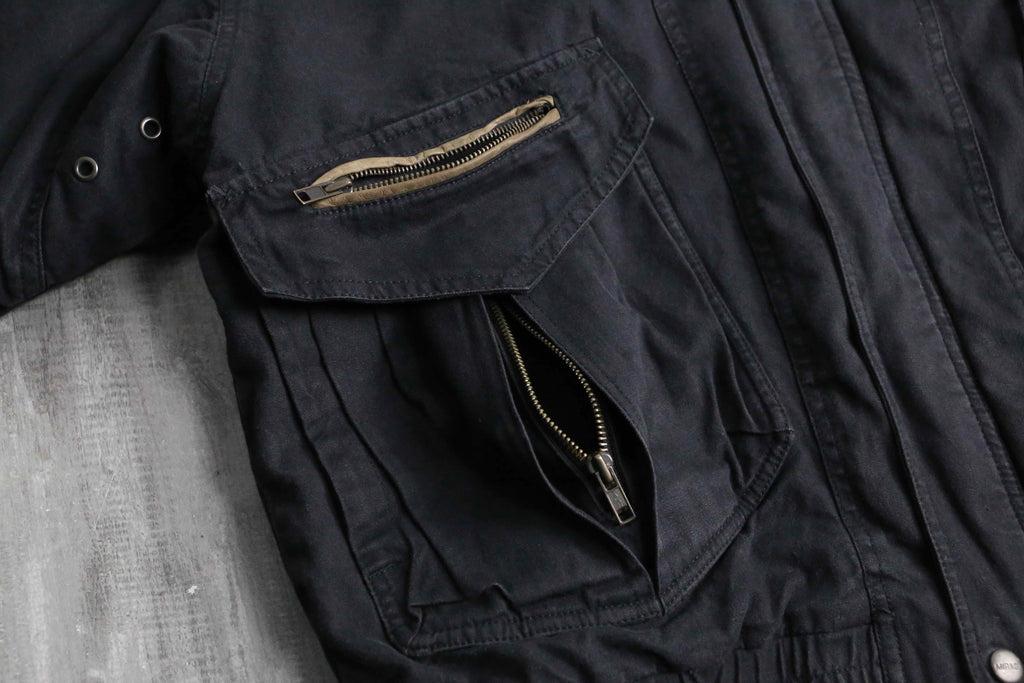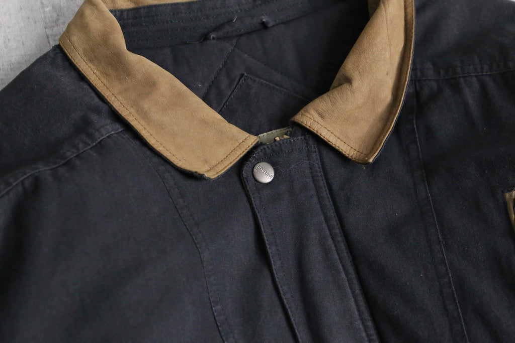 襟や所々にあるジップのパイピングには武骨なレザー切替を採用し、シンプルながらエッジの効いた1着になっています。着丈は短く、身幅は太いシルエットという綺麗なシルエットに、裏地はキルティングと防寒性も備えたジャケット。ダック地ともデニム地とも言い切れない絶妙なテクスチャーは頑強かつストリートな雰囲気を纏っています。