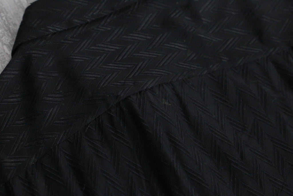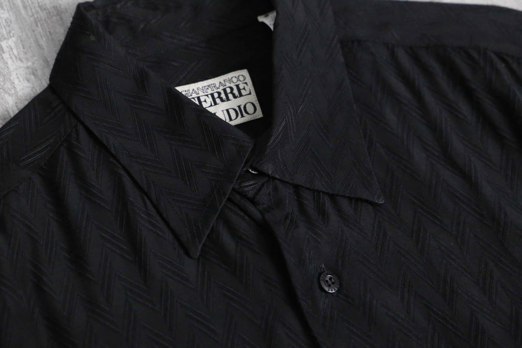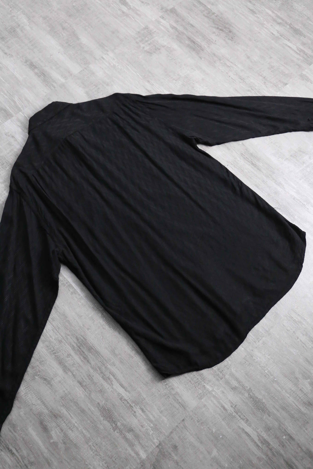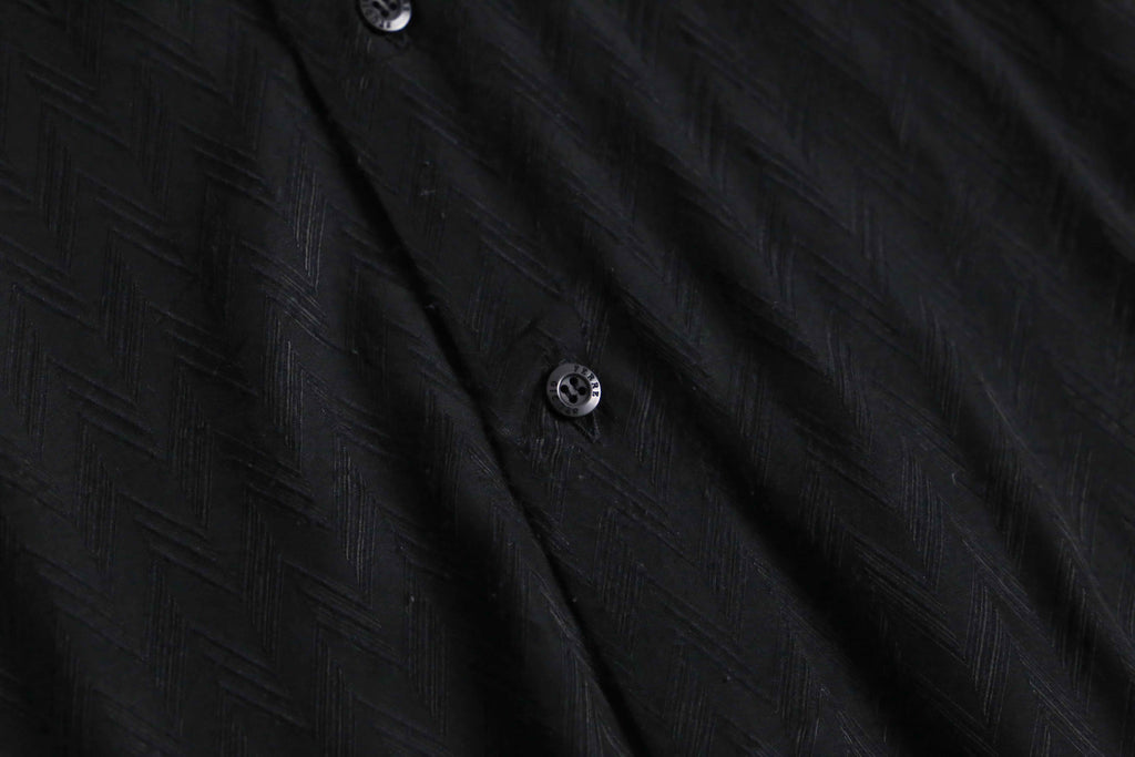 正確にはヘリンボーン織りではありませんが、ジャカード織りなのか織柄がヘリンボーンに近しいことからそう表記しました。織柄は光沢を帯び、黒と調和し至極モードな仕上がり。カジュアルシャツの域を裕に越えた、素晴らしい逸品。