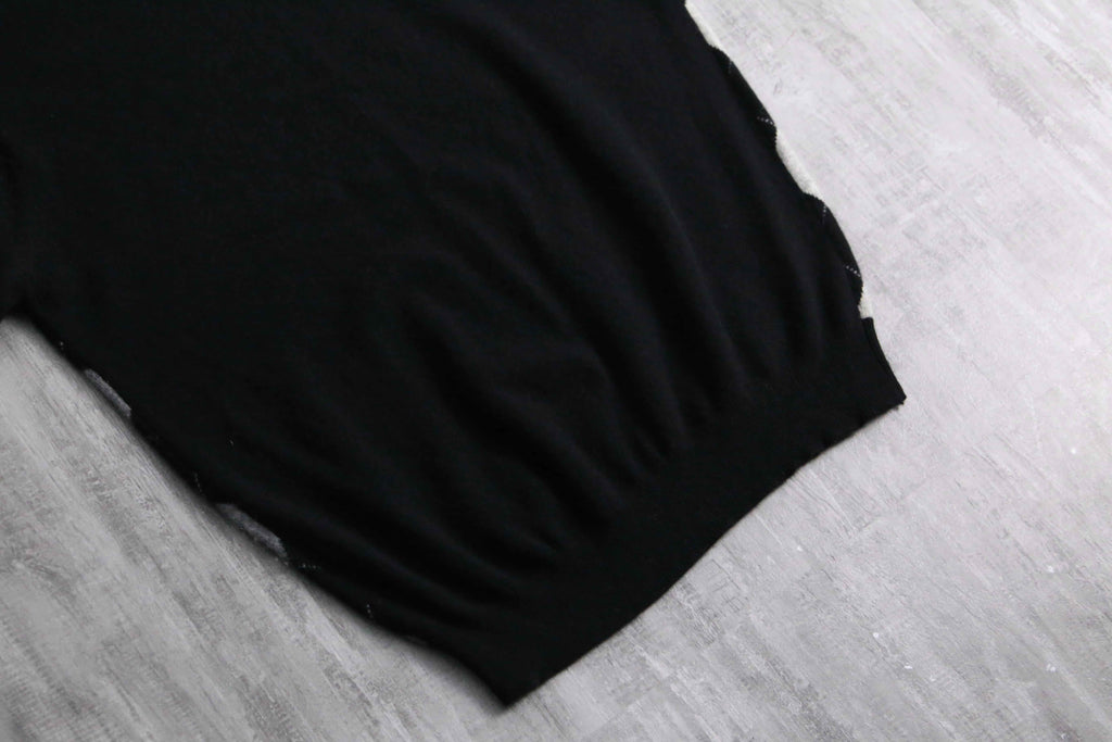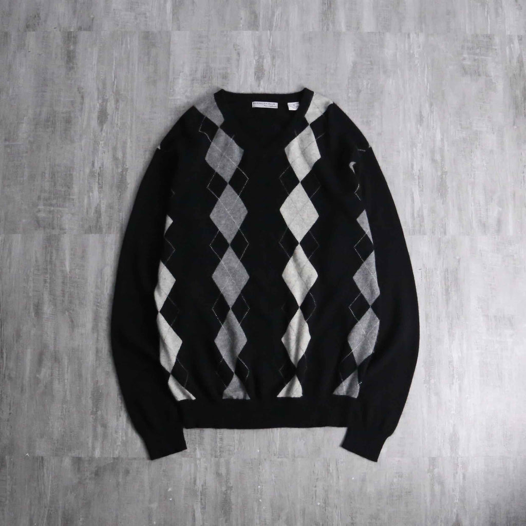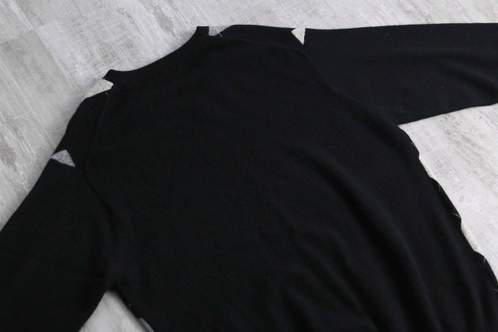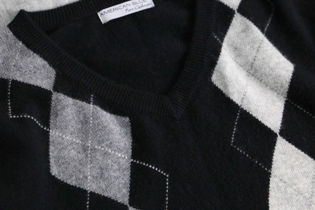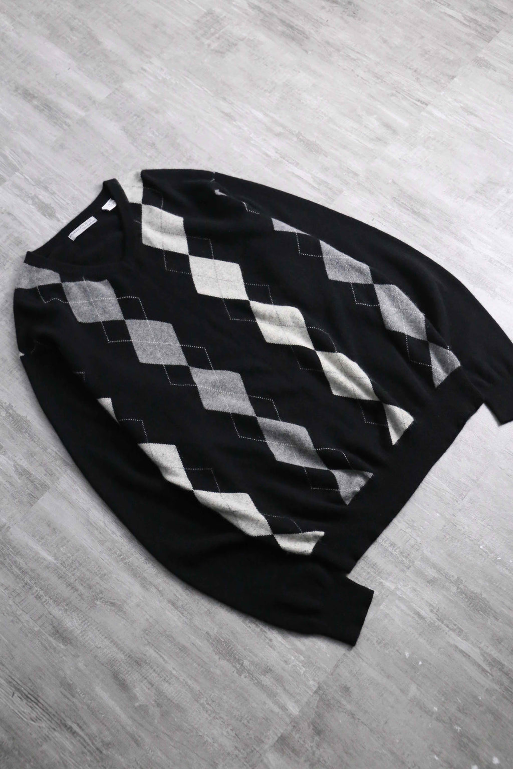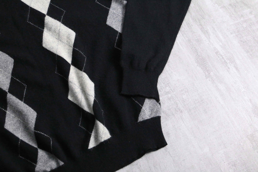 黒グレーの無彩色で仕上げられたアーガイルチェックが素敵なカシミヤニット。説明するまでもなく手触りやその他においても非常に上質です。