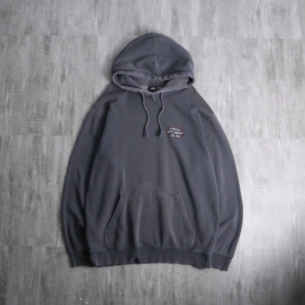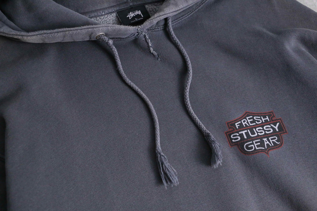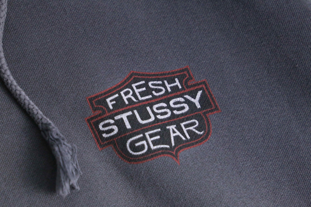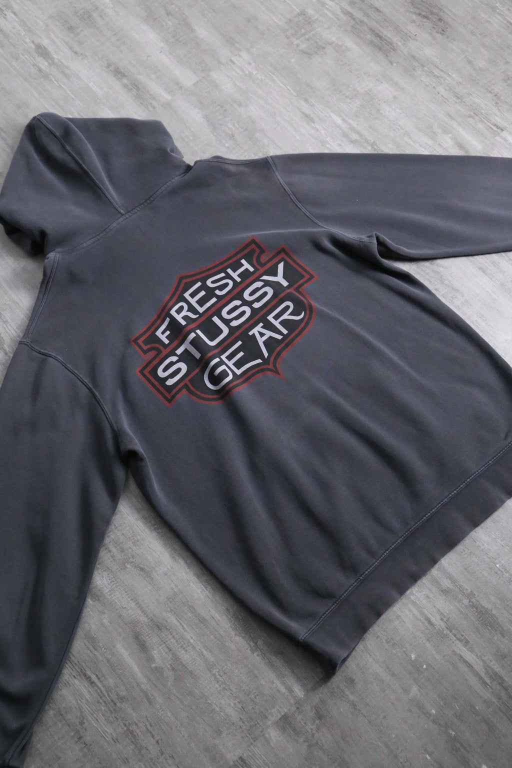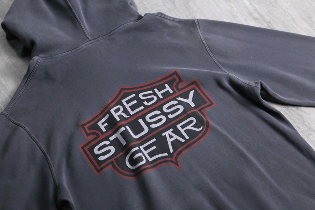 ハーレーのロゴをオマージュしたStussyのルーズサイズなフーディー。パッと見はハーレーのフーディーかなと錯覚するくらいには精巧にオマージュされています。