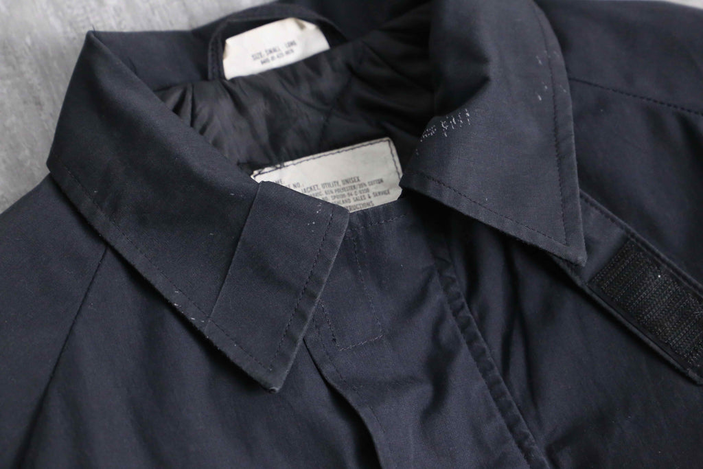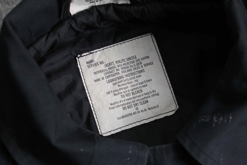 94年製コントラクターASHLAND SALESの米海軍ユーティリティジャケット。第二次世界大戦中やその後の冷戦時代を通してアメリカ海軍は機能的で丈夫なユーティリティウェアを開発し部隊に支給してきました。このジャケットもその一環で、船内作業や整備作業など日常的な業務を想定して設計されており、耐摩耗性や快適性が求められる環境で使用されました。