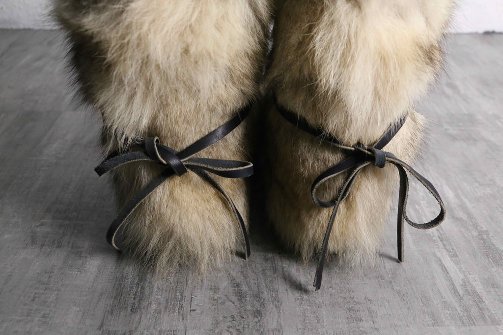 要所は確りとリアルレザー、ファー部のみはフェイクになっています。内側はボアフリースで非常に暖かな仕様。サイズは体感でいうと30cmかそれ以上ありますが、フィッティング向上のための革紐が付きますので、ギュッと縛れば存外履いていただけます。