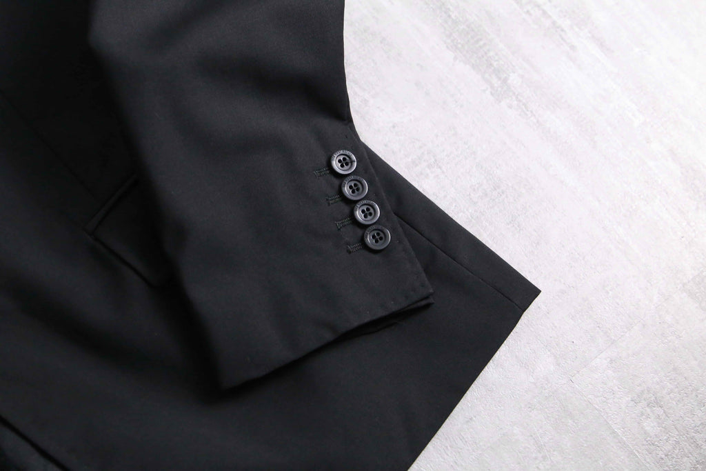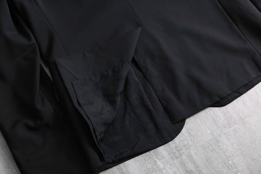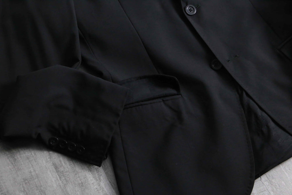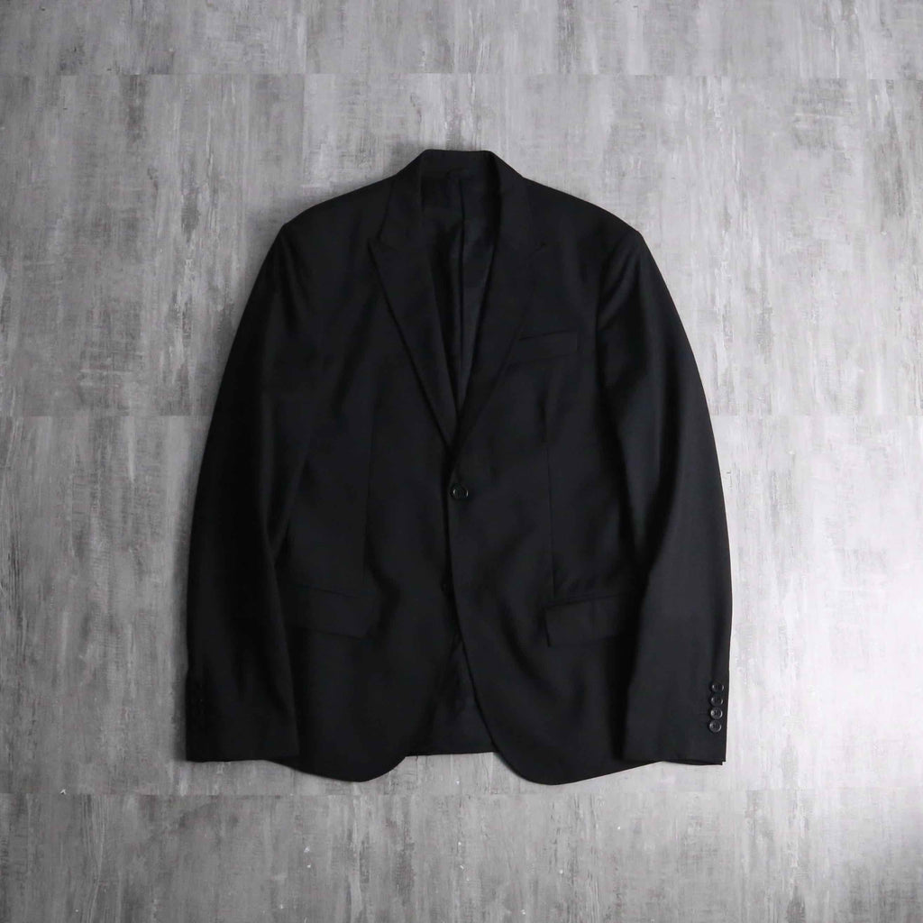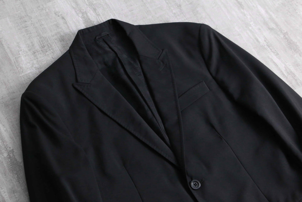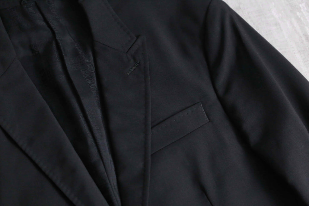 例えばAnnやPRADA等の雰囲気に近しい、ライトな質感のウール主体のモヘア混紡生地。ピークドラペルは細く作られ、またウエストは若干のシェイプが効いている為、着用感は非常にスタイリッシュ。袖は長めの作りになっているので、同ブランドらしいモードな質感も顕著に現れています。裏地はブランドネーム総ジャカードの台場仕立て、袖開き見せ、センターベントの条件。確りイタリアメイドですから、仕立ての良さも随一です。