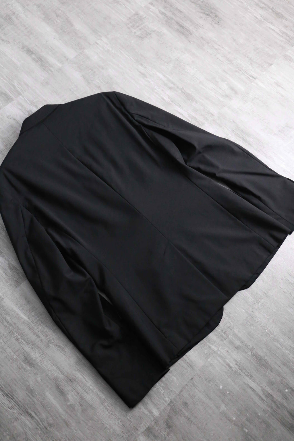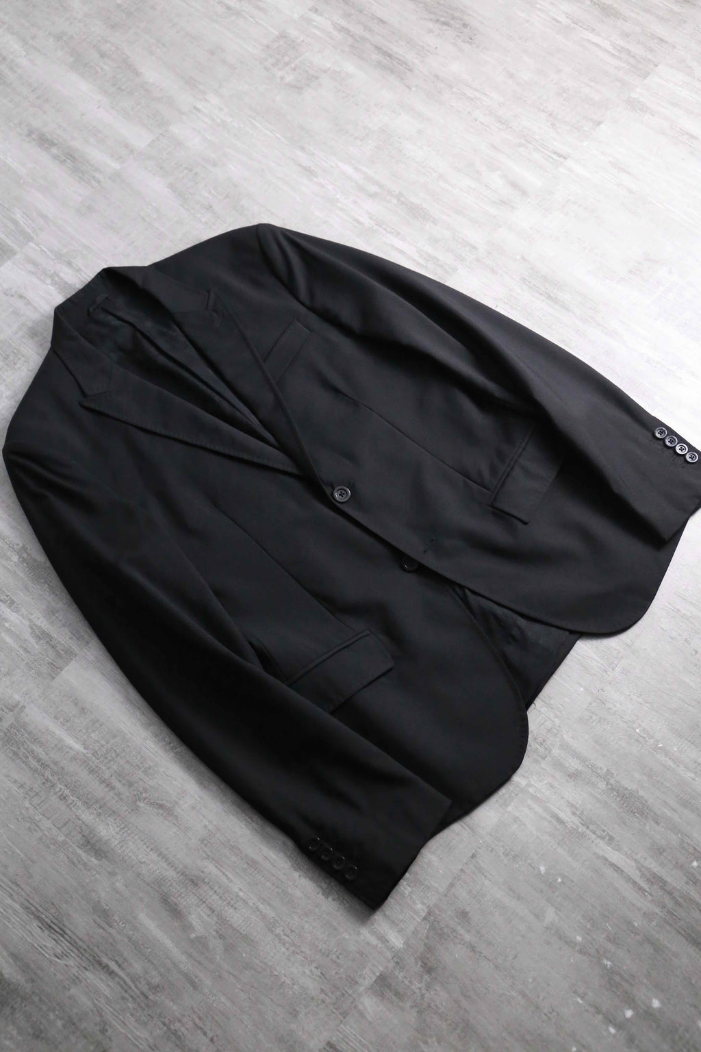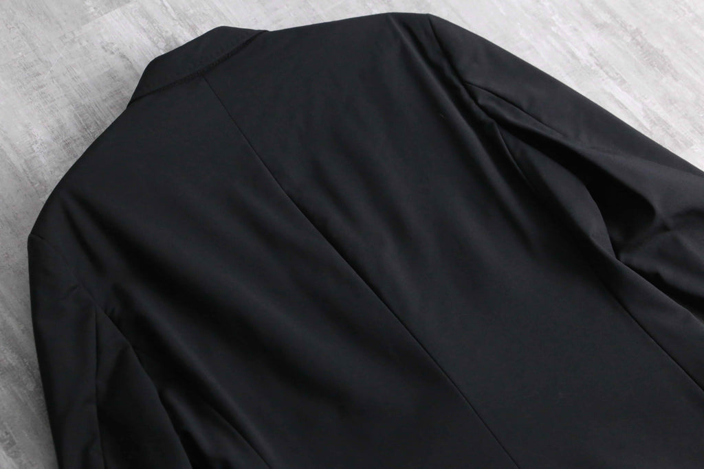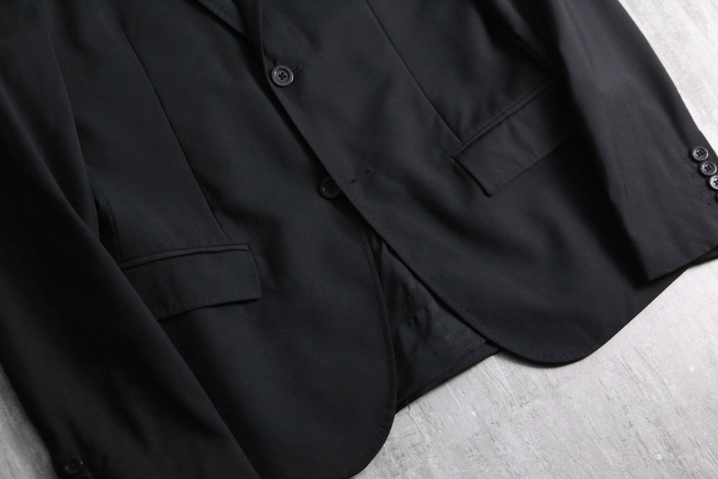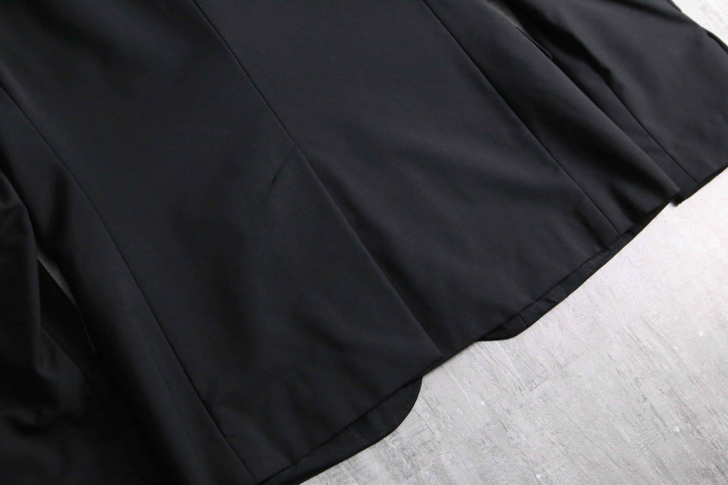 例えばAnnやPRADA等の雰囲気に近しい、ライトな質感のウール主体のモヘア混紡生地。ピークドラペルは細く作られ、またウエストは若干のシェイプが効いている為、着用感は非常にスタイリッシュ。袖は長めの作りになっているので、同ブランドらしいモードな質感も顕著に現れています。裏地はブランドネーム総ジャカードの台場仕立て、袖開き見せ、センターベントの条件。確りイタリアメイドですから、仕立ての良さも随一です。