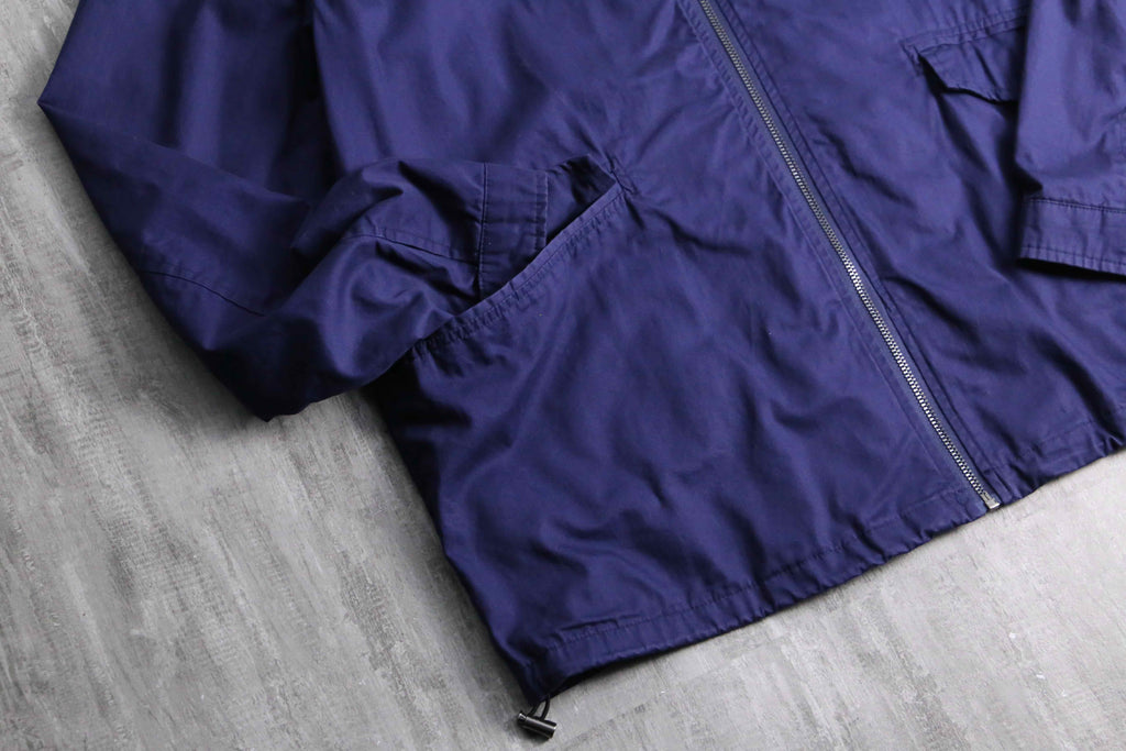 起毛感のあるスムース生地のコットン100%。スタンドカラーのフルジップタイプでフラップポケットが2つつくのみのシンプル設計。両裾にはドローコードが付き、絞ることも可能です。これくらいのオンスのライトアウター、とっても重宝します。