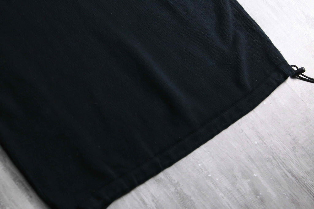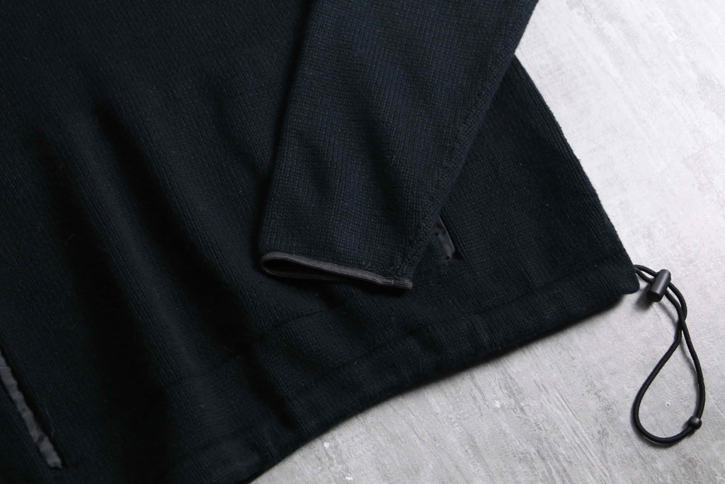 コットンニット特有のもったりとした重みと肌あたりの良さ、モックネック気味のハーフジップによりミッドレイヤーへの使いやすさ、そしてポケットとドローコード付きによるラストアウターとしての運用の高さも魅力的。サイズは少し大きめですが、絞ったり或いは上背のある方であれば難なく着られるかと思います。
