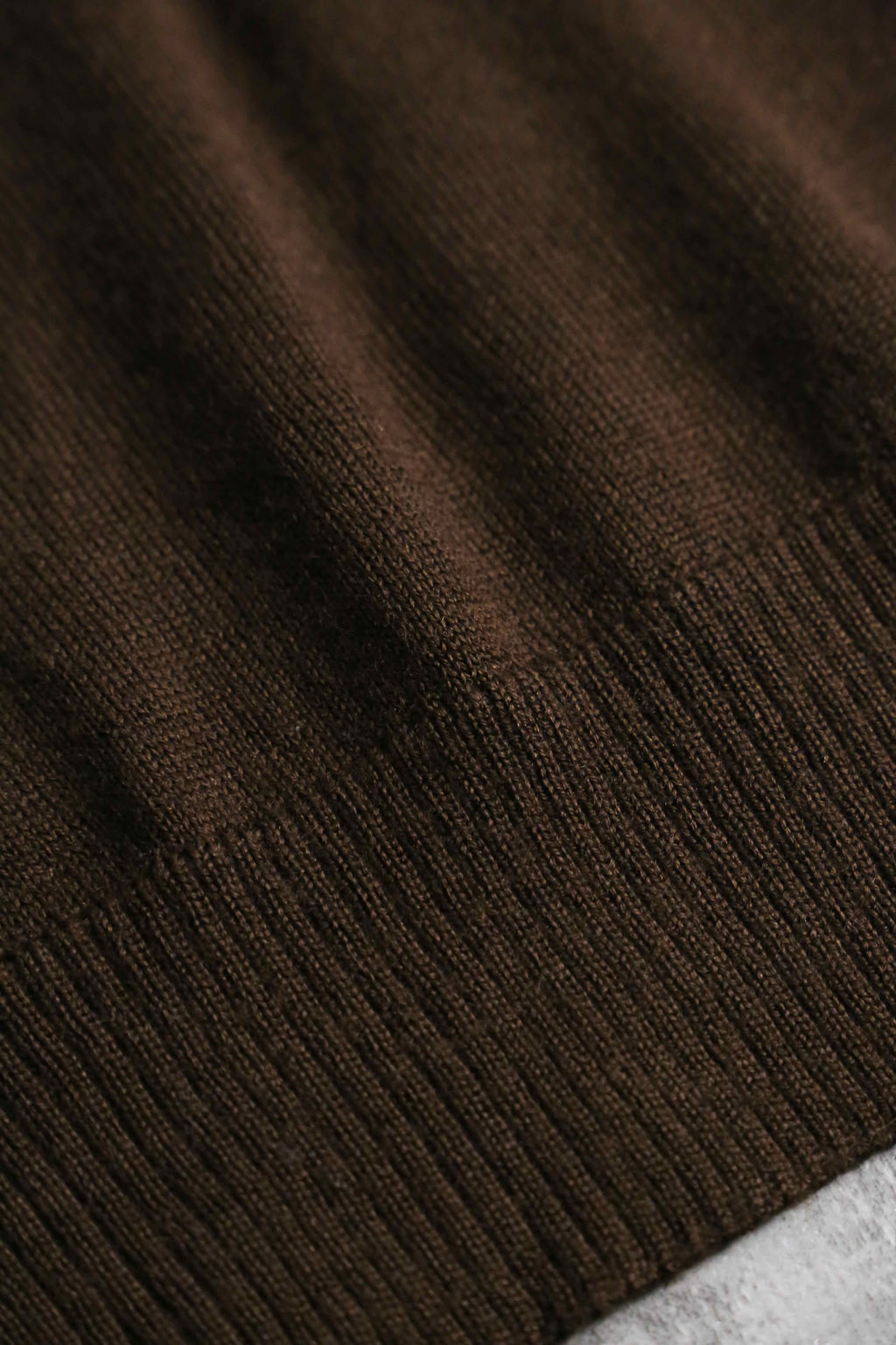 ボルドー×ブラウンの秋らしい配色のヘリンボーン柄。品良く開いた浅めのVネックは、デコルテを綺麗に演出してくれます。また、生地はメリノウールとアクリルの二者混紡生地。カシミヤのように柔らかく非常に繊細な生地感です。
