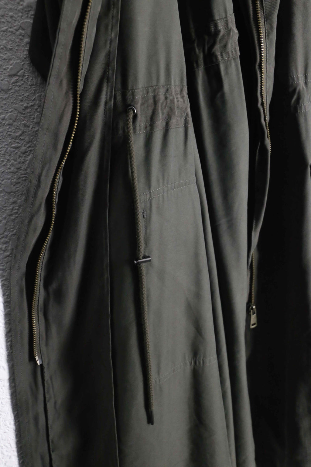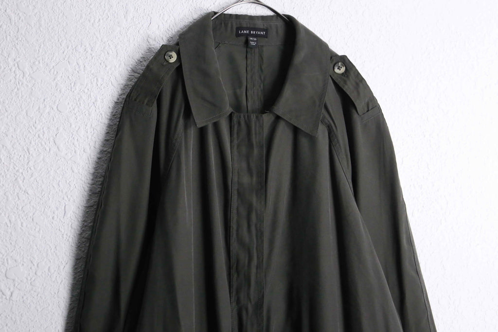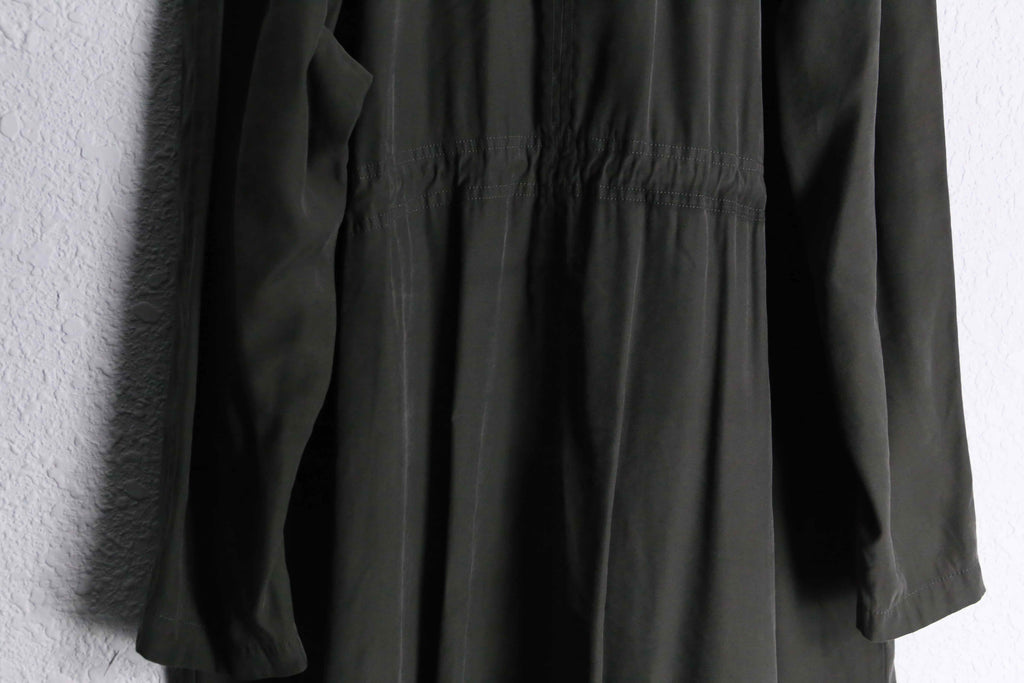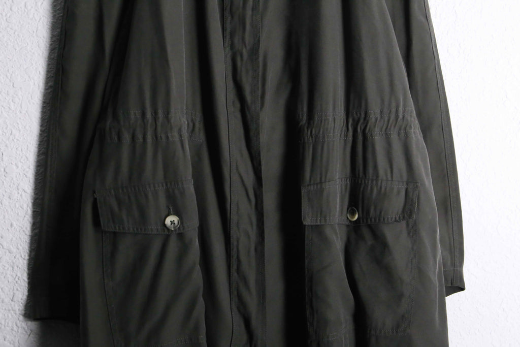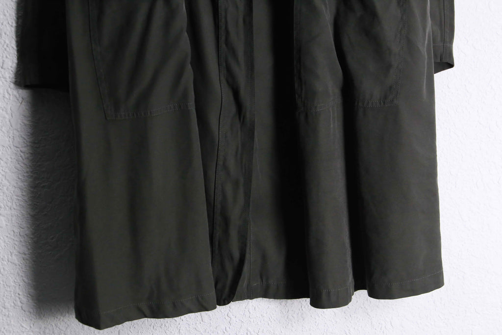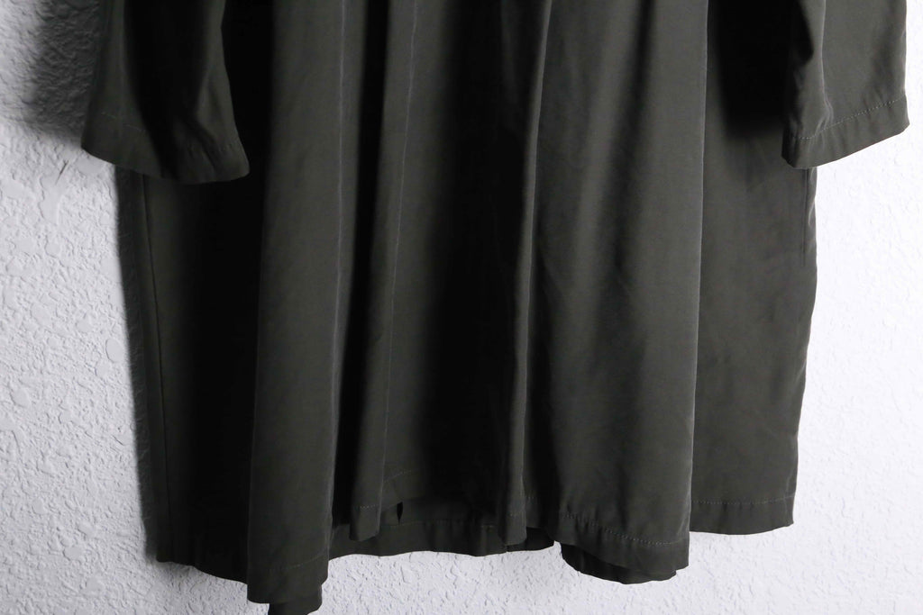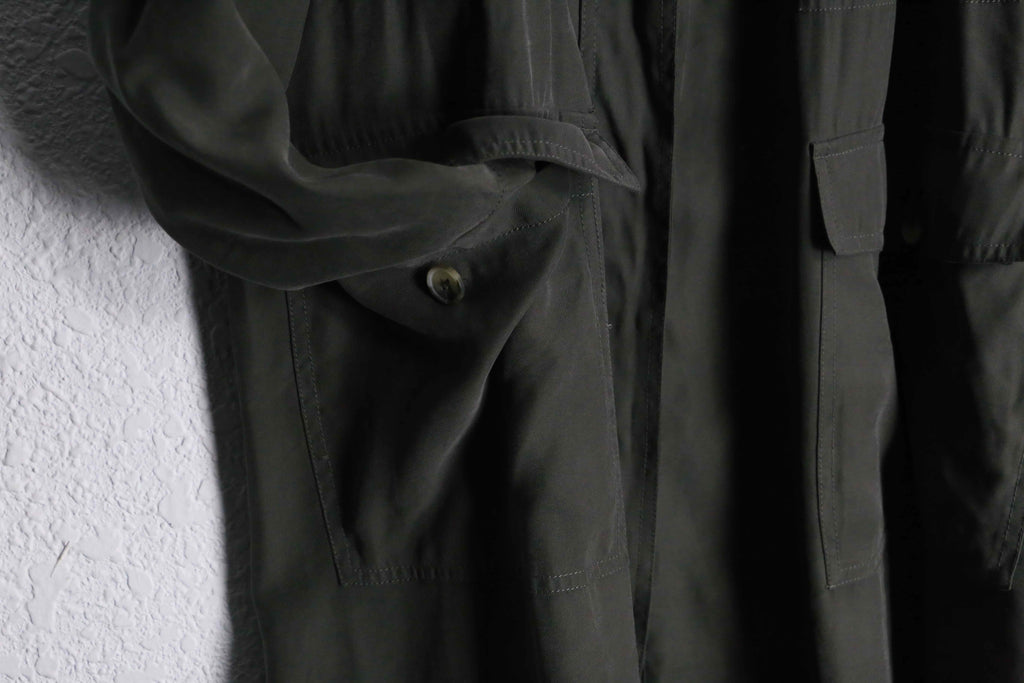 ラグラン肩やエポレットなどコートのディティールを踏襲しつうも、腰内部にはドローコードを携えある種モッズコートのような雰囲気も携える1着。レーヨン特有のドレープ感と柔らかい着心地で軽くサッと羽織れますので、コートが苦手な方もこれなら比較的羽織りやすいかと思います。