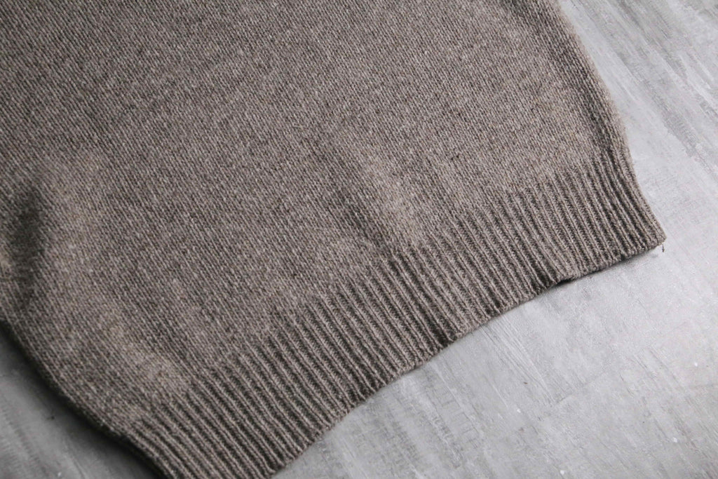 こちらはbabaaらしい無染色ウールによる天竺編みのタートルネック。ふっくらとしたボリューム感と、柔らかさを保ちながらも空気を含むような軽さが特徴。リブを強調したネック、袖、裾のバランスも秀逸で、極めてミニマルながら、素材の豊かさと人の手の温度を感じさせる1着。