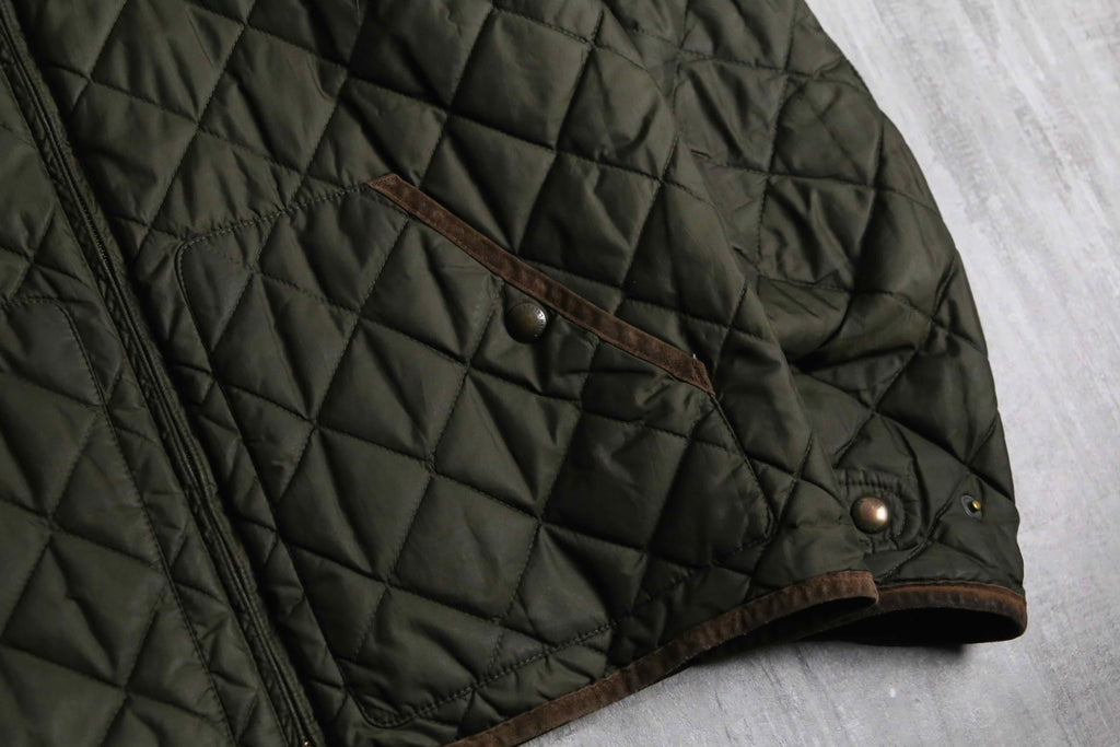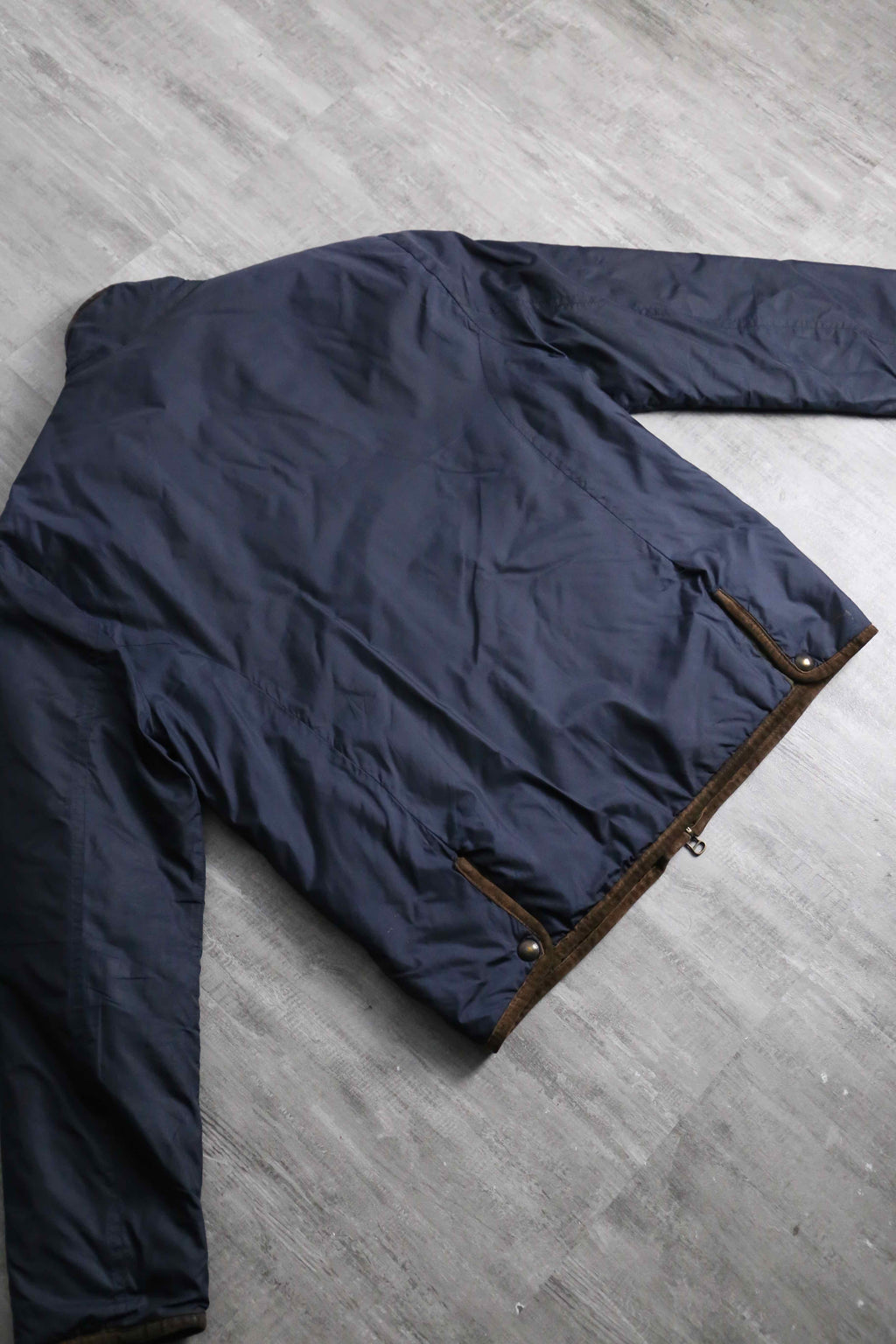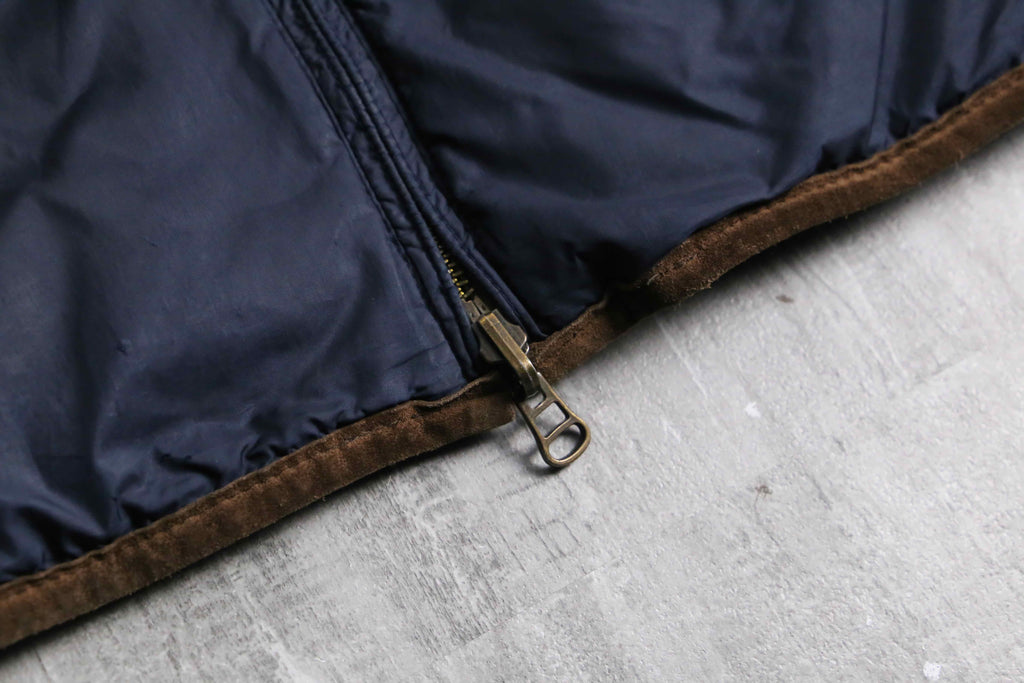 襟、袖、裾はリアルスエードのパイピング。A面はネイビーで、フラップポケットとスナップボタン開閉のサイドベンツが付くのみのシンプルな設計。一方B面は打って変わってダイヤキルトのハンティングカバーオールの様なルックス。ガンフラップにエルボーパッチ、袖アジャスター付き、ポケットの仕様も変え、胸にはポロの刺繍デザイン。一般的なリバーシブルの服は裏表でここまで表情を変えることも少なく、比喩ではなく裏表で全く異なる服へと変貌します。