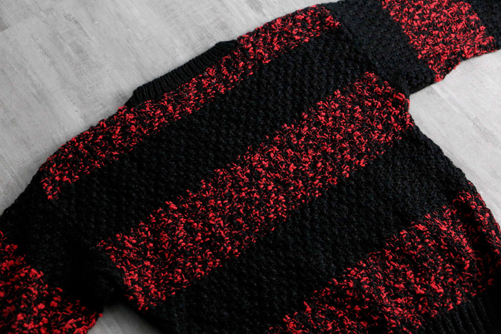 一見すると変哲のないレギュラーのニットですが、ピッチ幅の太いボーダーや、黒×黒赤メランジの好配色、シルエットバランスに於いて凄く魅力的に映ったのでご紹介。