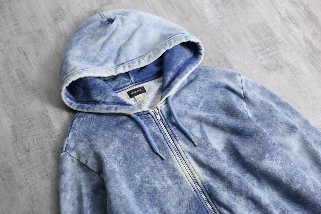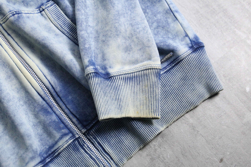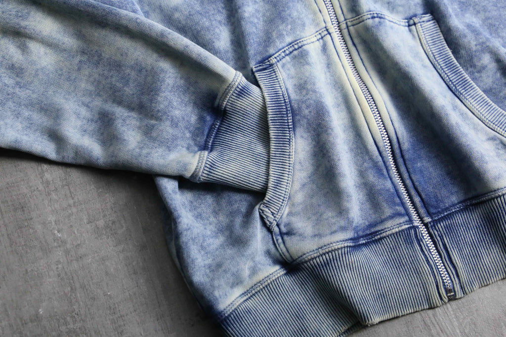 ケミカルウォッシュ調にブリーチ加工が施されたイカしたジップアップフーディー。ライトオンスコットンな為、インナーへの採用も大いに期待できます。