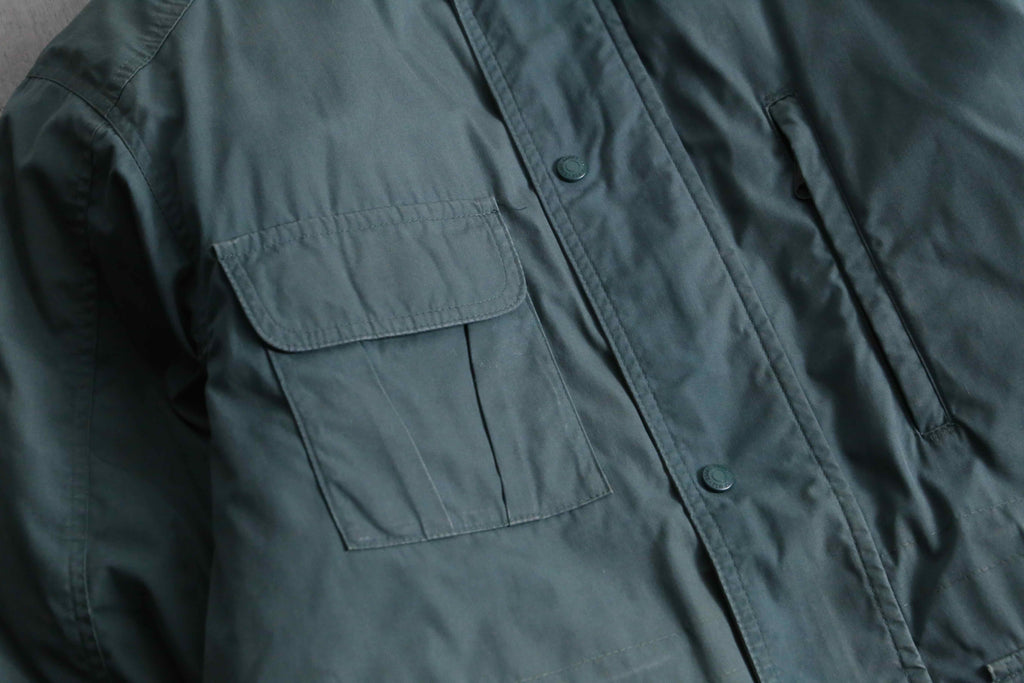 胸のユーティリティポケットと大容量フラップポケットは、完全にアウトドア前提の作り。フロントは 比翼+スナップ+ジップ の三重構造で、風雪の侵入を抑えるための本格ディテール。ダウンも当時の グースダウン高混率特有の膨らみ方 をしており、現行の軽量モデルにはない空気を抱き込む重厚な保温力を体感できます。