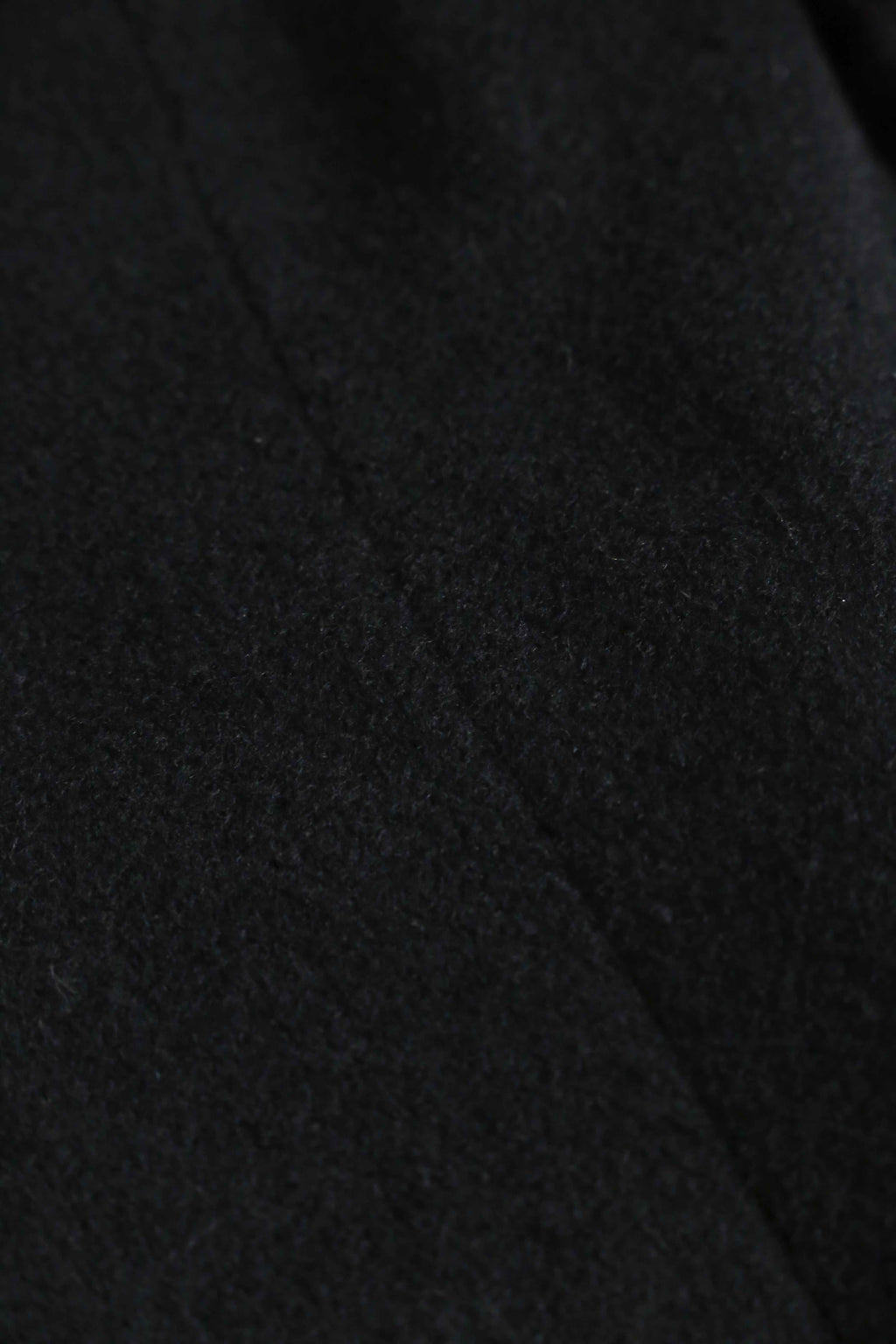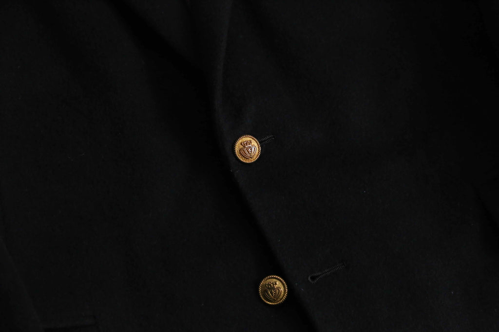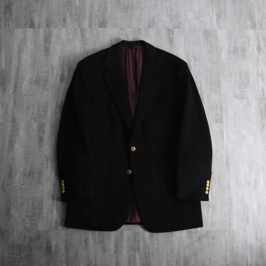 2金釦シングル、袖4釦本切羽、総裏地、センターベントの条件。カシミヤのようなとろみと柔らかさを感じる起毛したウールネルのファブリック。吸い込まれるような黒と裏地のコントラストが非常に美しく、通常のテーラードジャケットとは一線を画す品格と雰囲気があります。