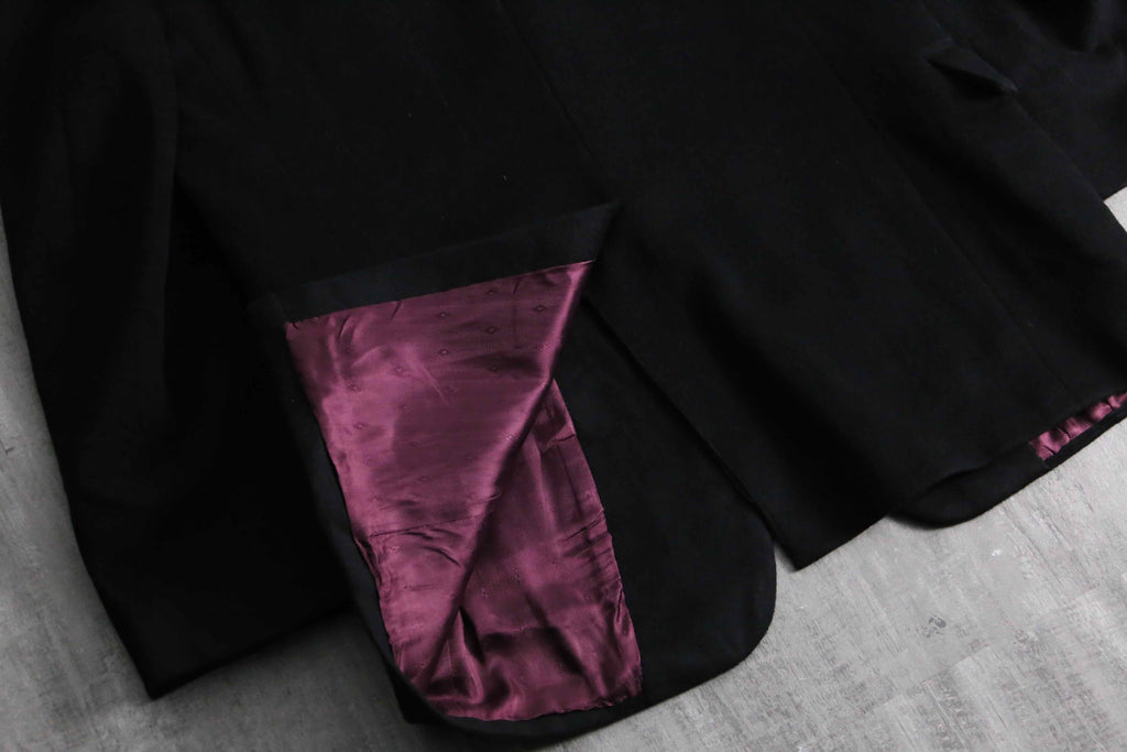 黒金刺繍タグ、加えてスレッド&ニードルのタグデザインから、70年代と仮定。高貴なボルドー色のヘリンボーンライニングには、ダイヤ型織柄が組み込まれ、随所に手の込んだ仕様が見られる美しいテーラードジャケット。