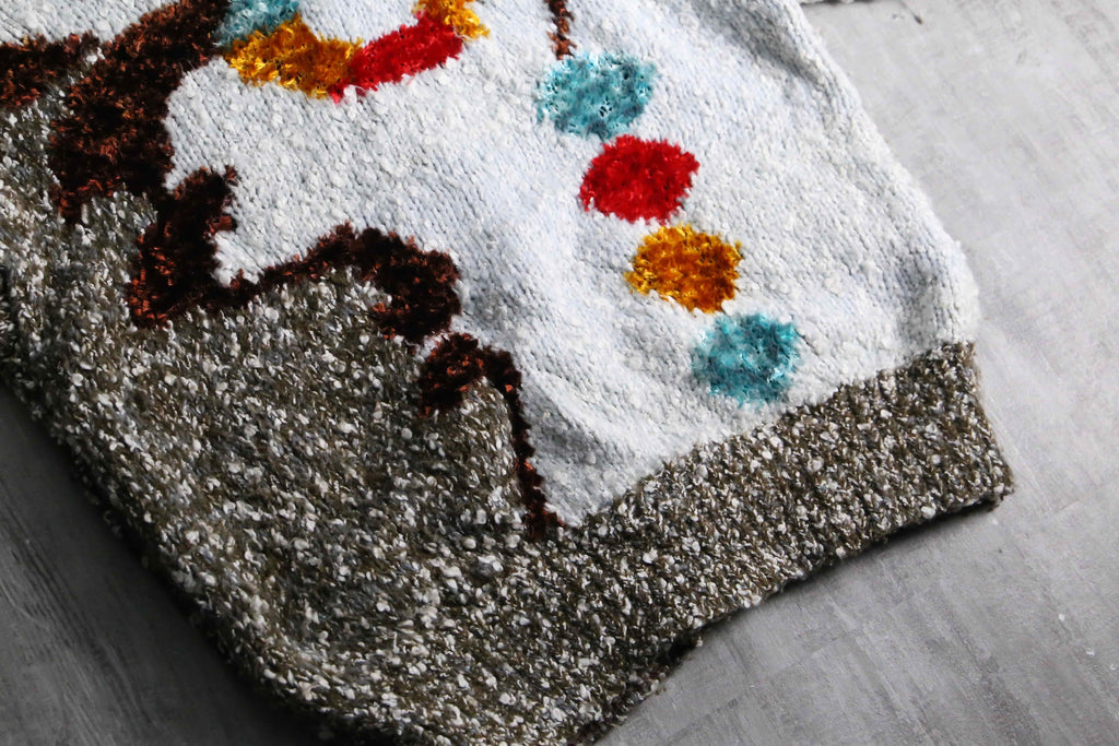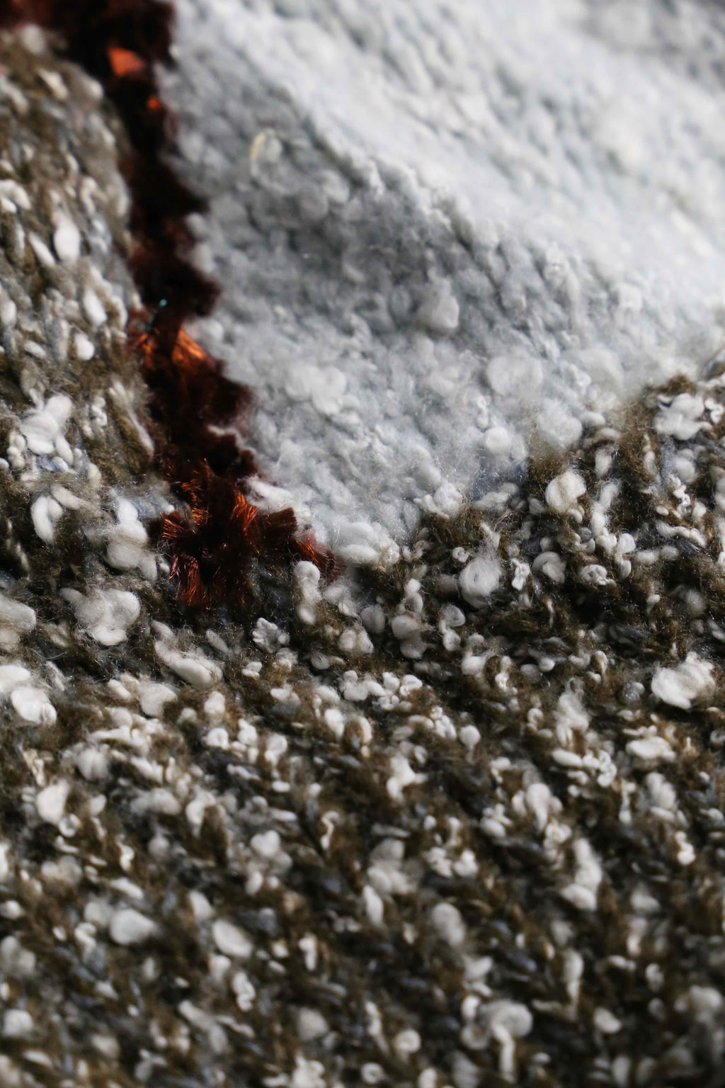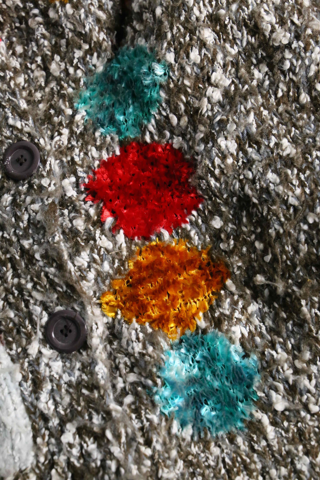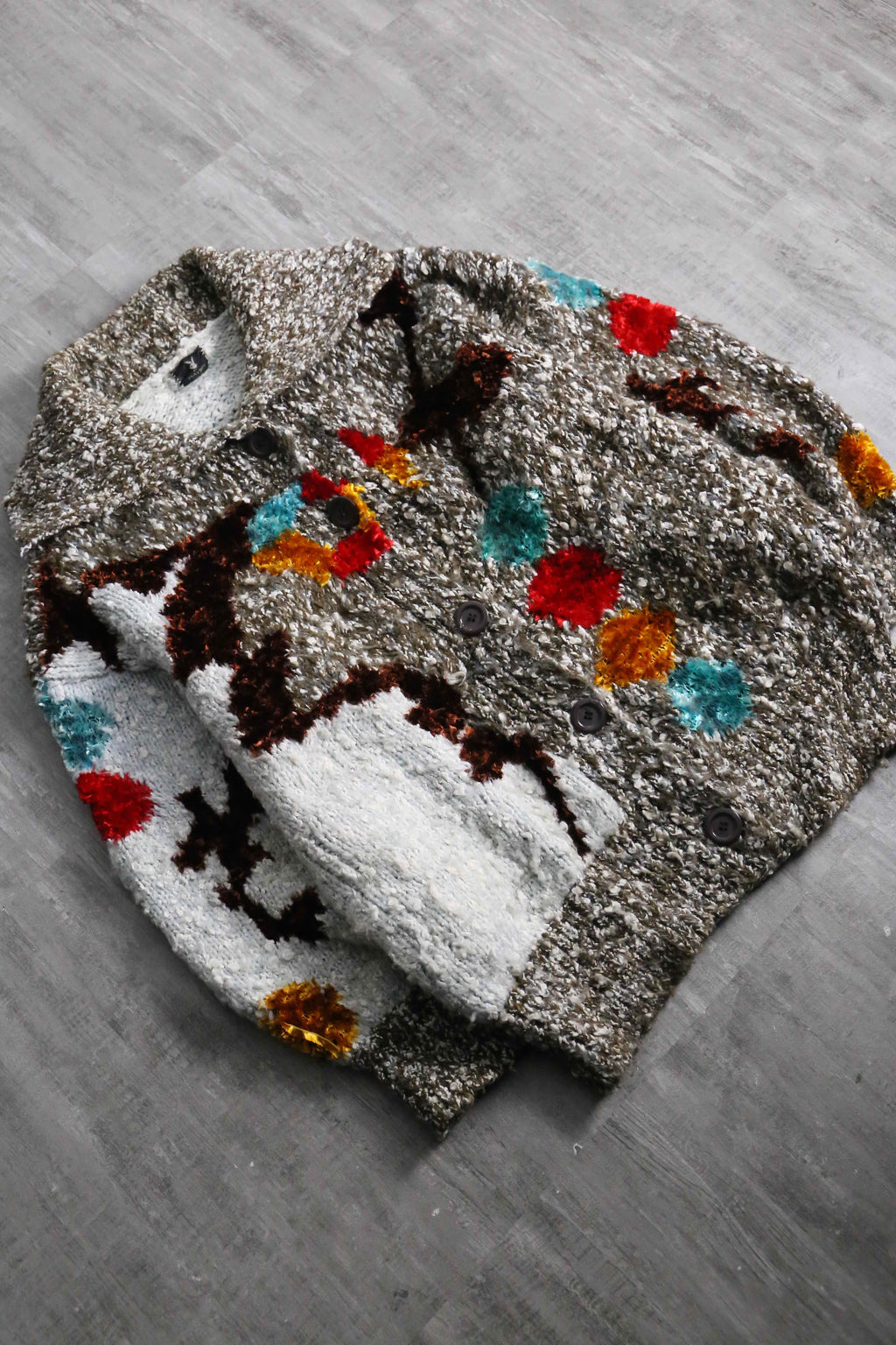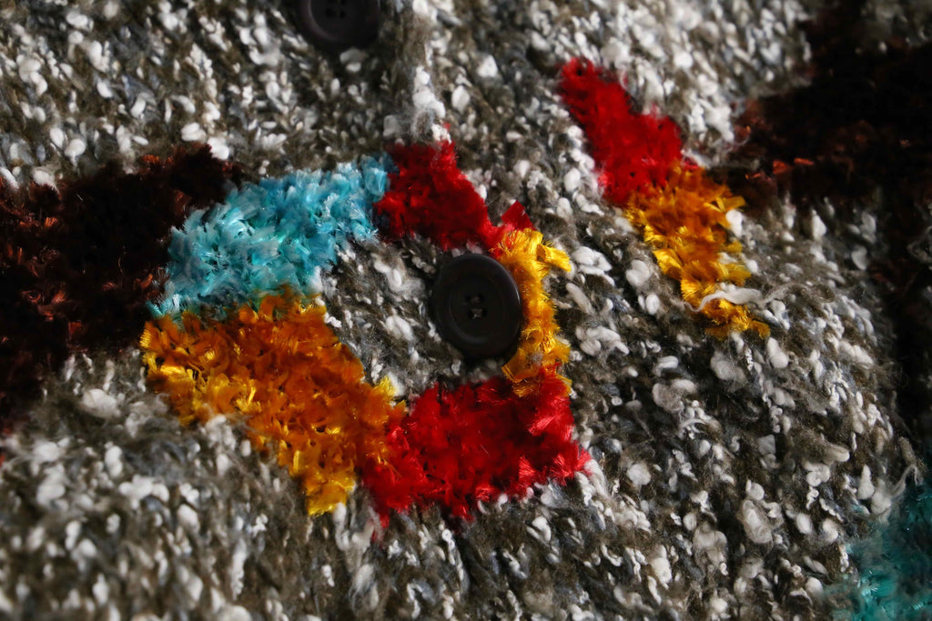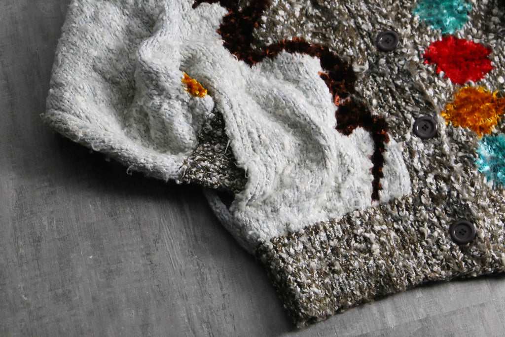 シェニール糸を織り込み、他はメランジとループヤーンのマルチな編み柄。襟はざっくりと開き、かつポケット付き。ニットウェアは通常プルオーバータイプかつインナーウェアに採用されることが多い中、こちらアウターとしての運用が可能。裏起毛のフーディーなんかを仕込めば冬も対応できます。