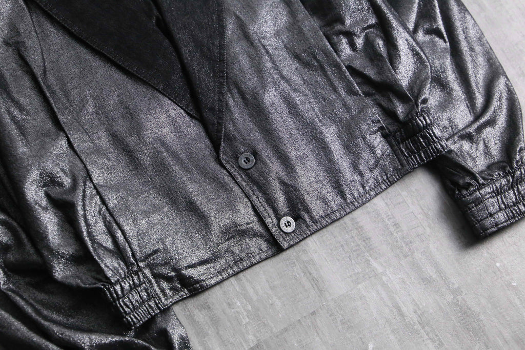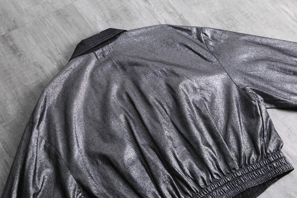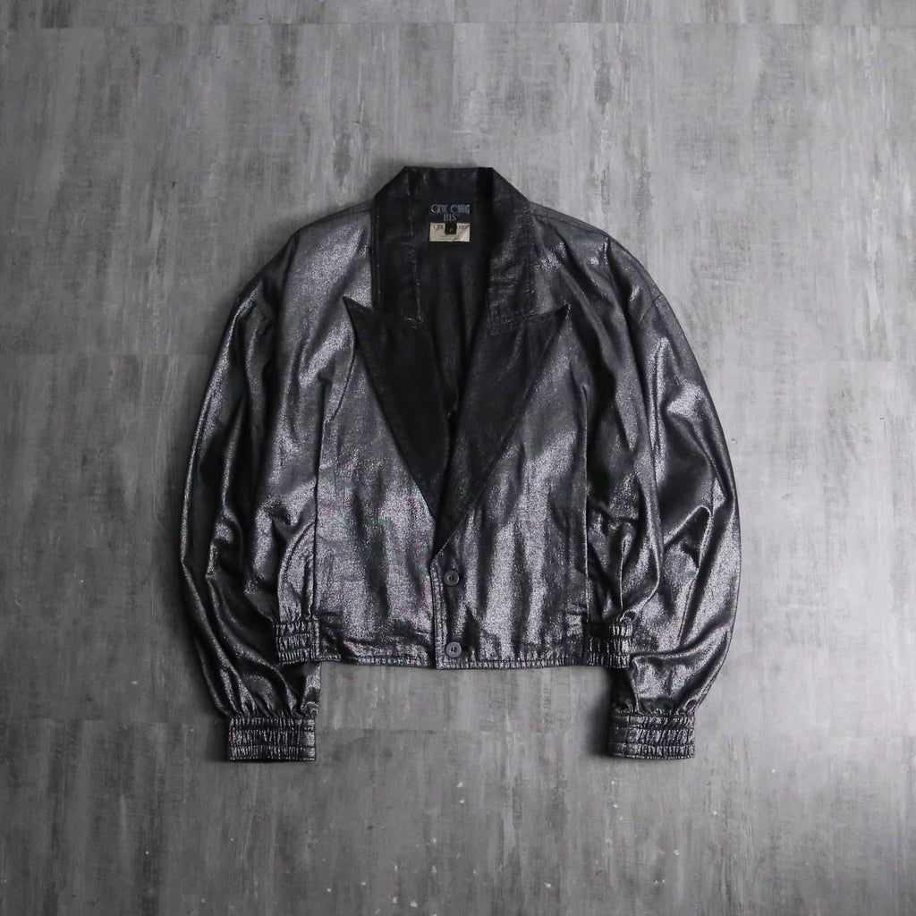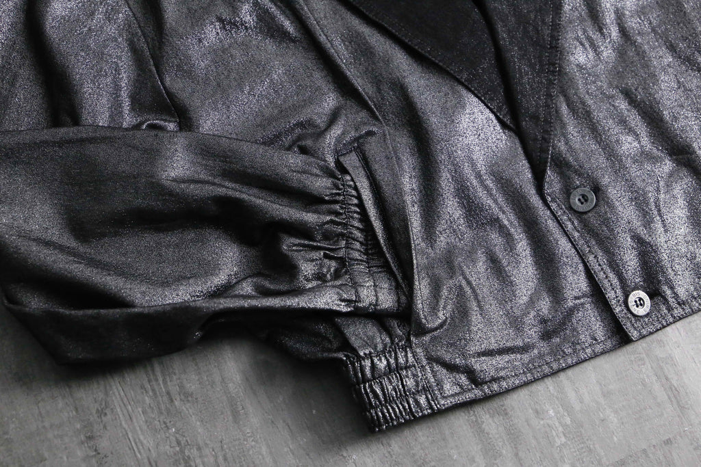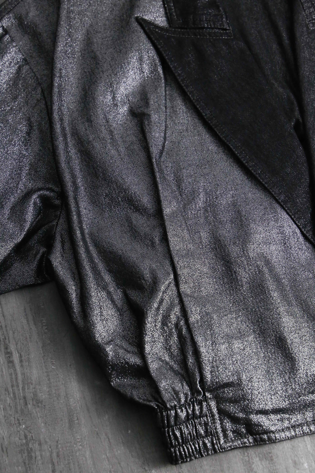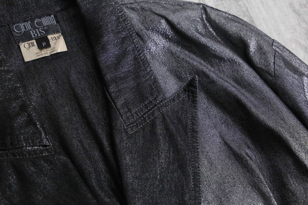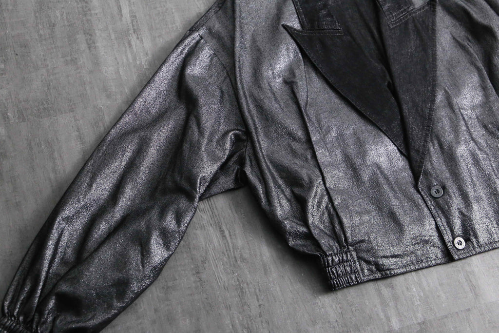 ラメ糸を織り込んだ薄手の生地で仕立てられた、推定80年代USメイドのスペンサージャケット。ショートレングスの異端なフォルムに、ラペルのみを黒で切り替え、身頃はシルバー一色。光を受けてきらめく質感と、色のコントラストが強い存在感を放ちます。