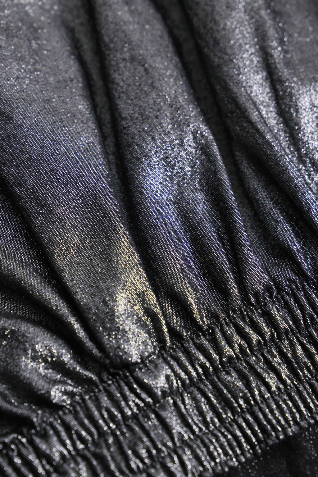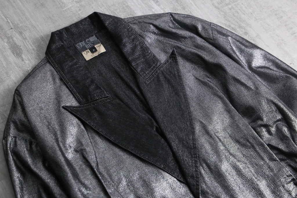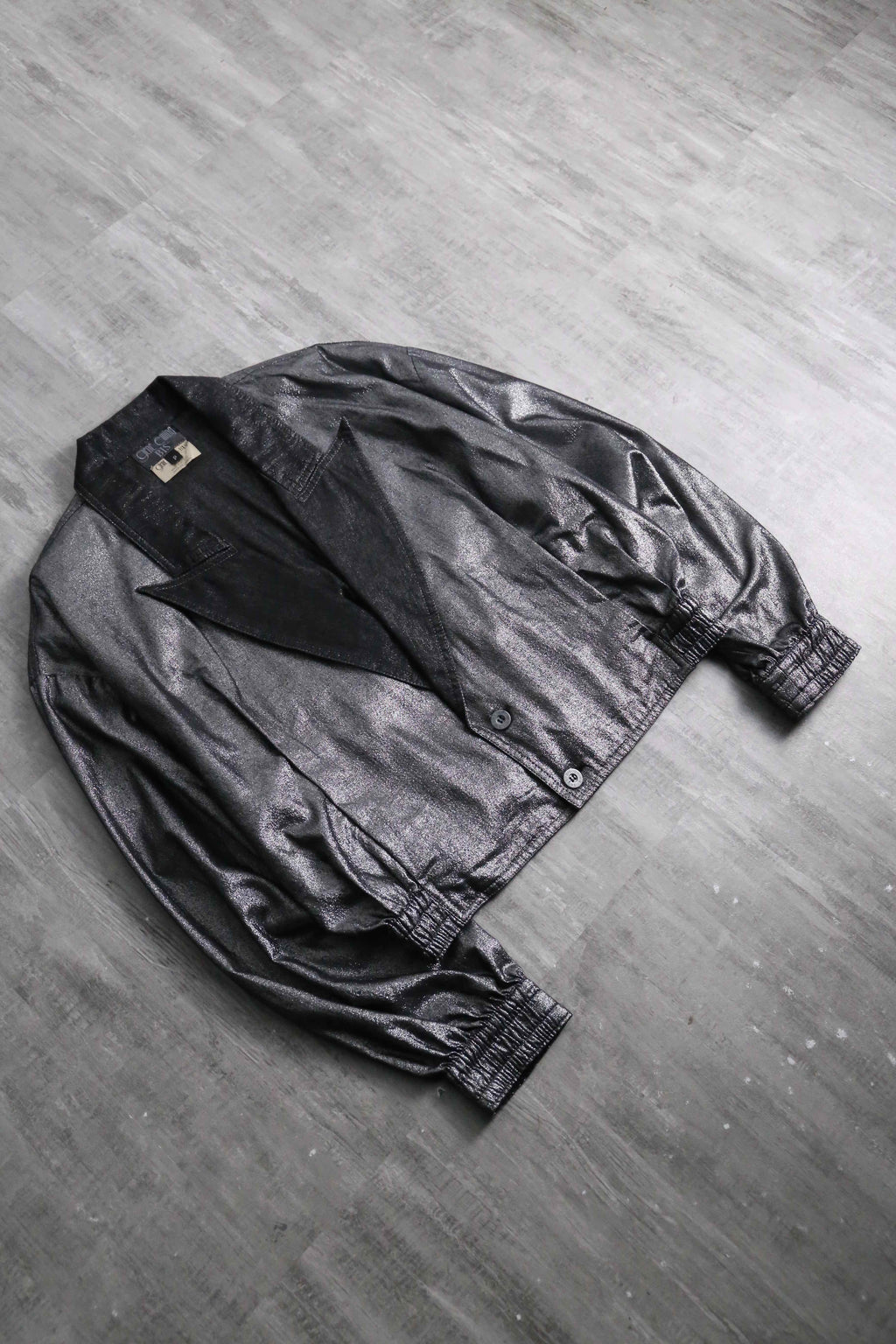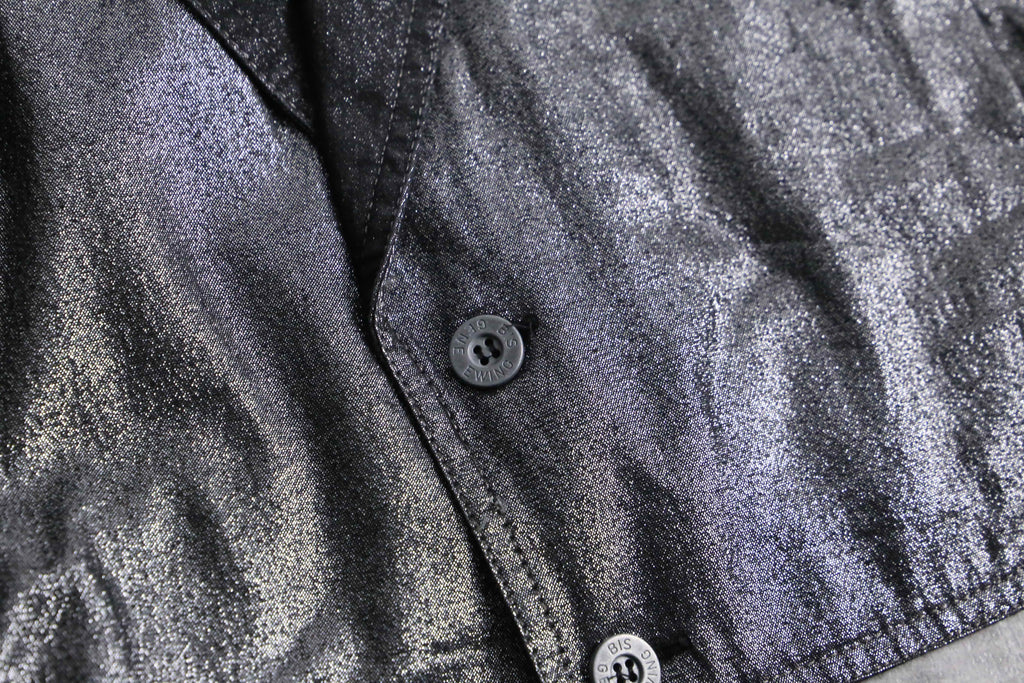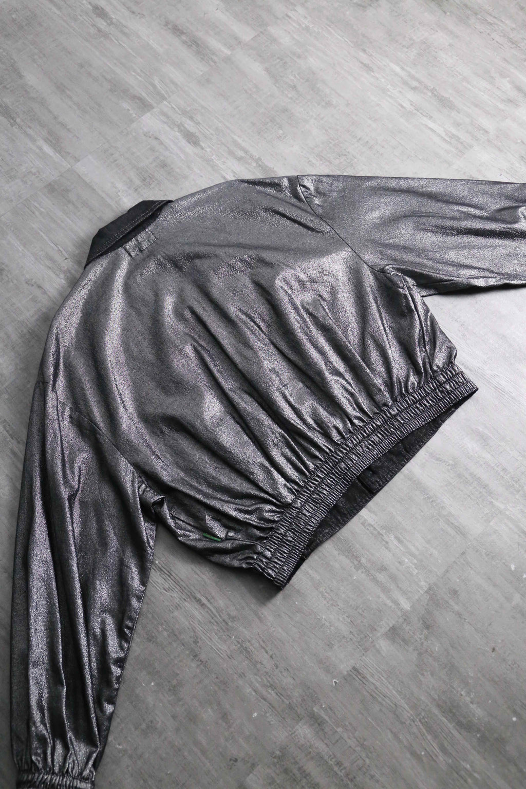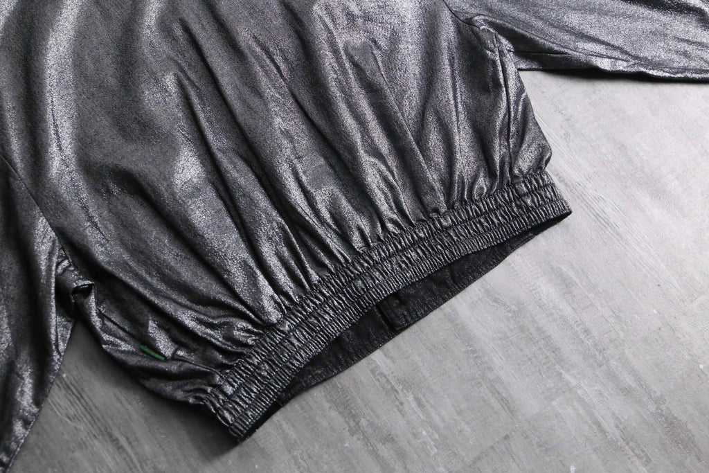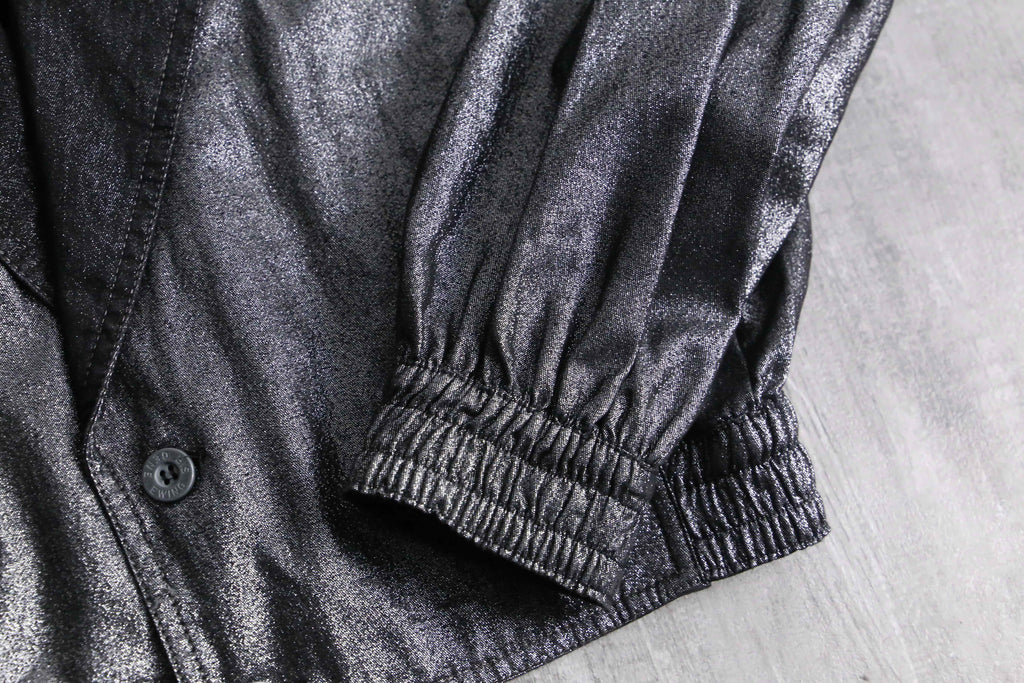 ラメ糸を織り込んだ薄手の生地で仕立てられた、推定80年代USメイドのスペンサージャケット。ショートレングスの異端なフォルムに、ラペルのみを黒で切り替え、身頃はシルバー一色。光を受けてきらめく質感と、色のコントラストが強い存在感を放ちます。