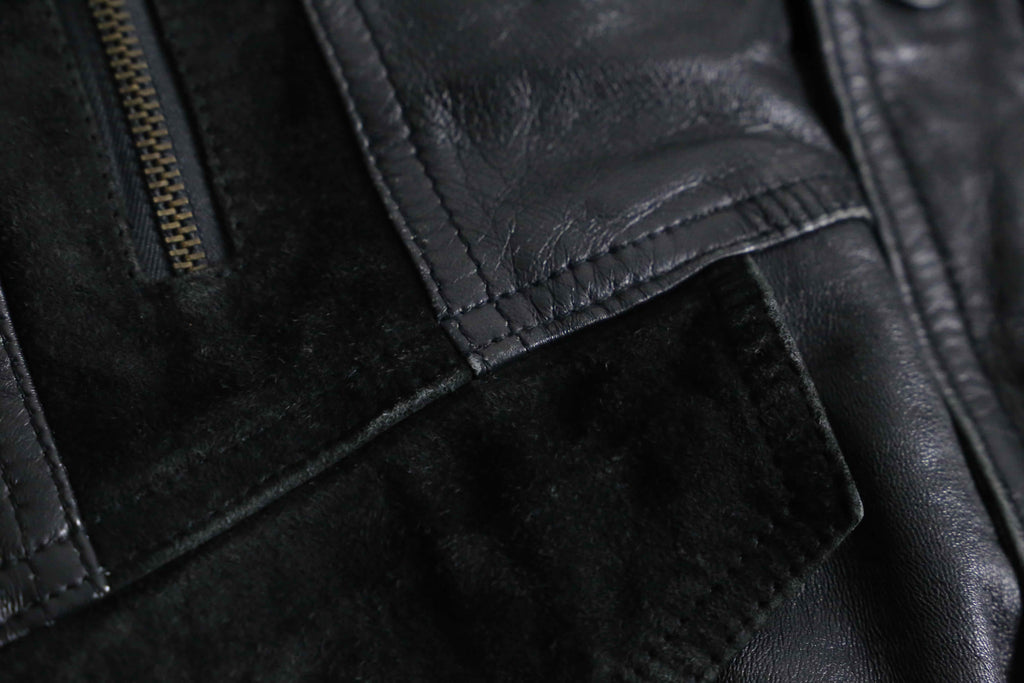 シボ感が細かく柔らかいスムースレザーと、ふんわり起毛したスエードの2種レザーのコンビネーション。中綿も入り、見た目以上に暖かいのもポイント。裏地は総柄が入り、脱ぐ瞬間にも気を遣った意匠が施されています。