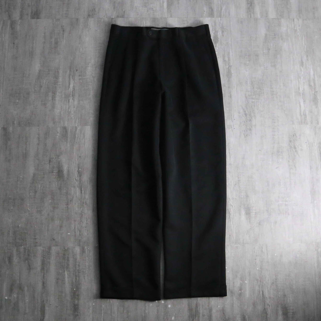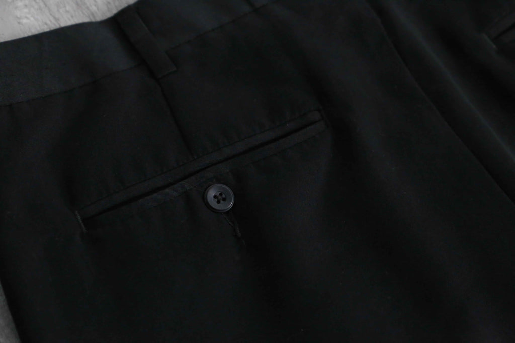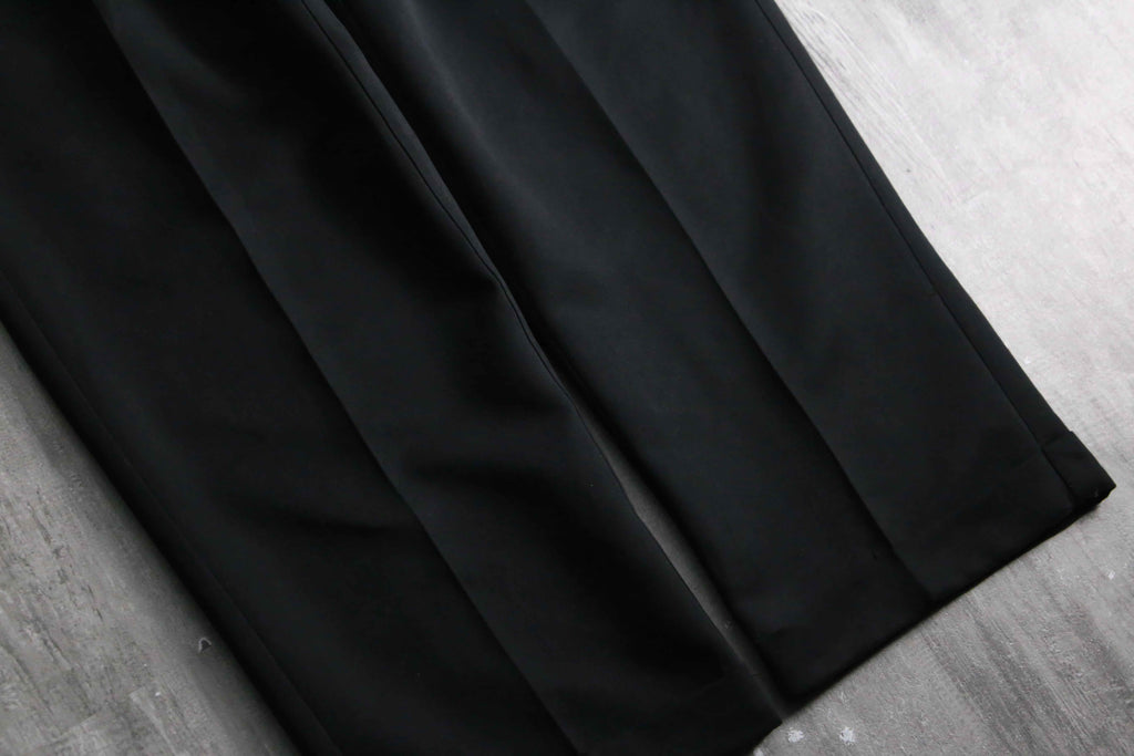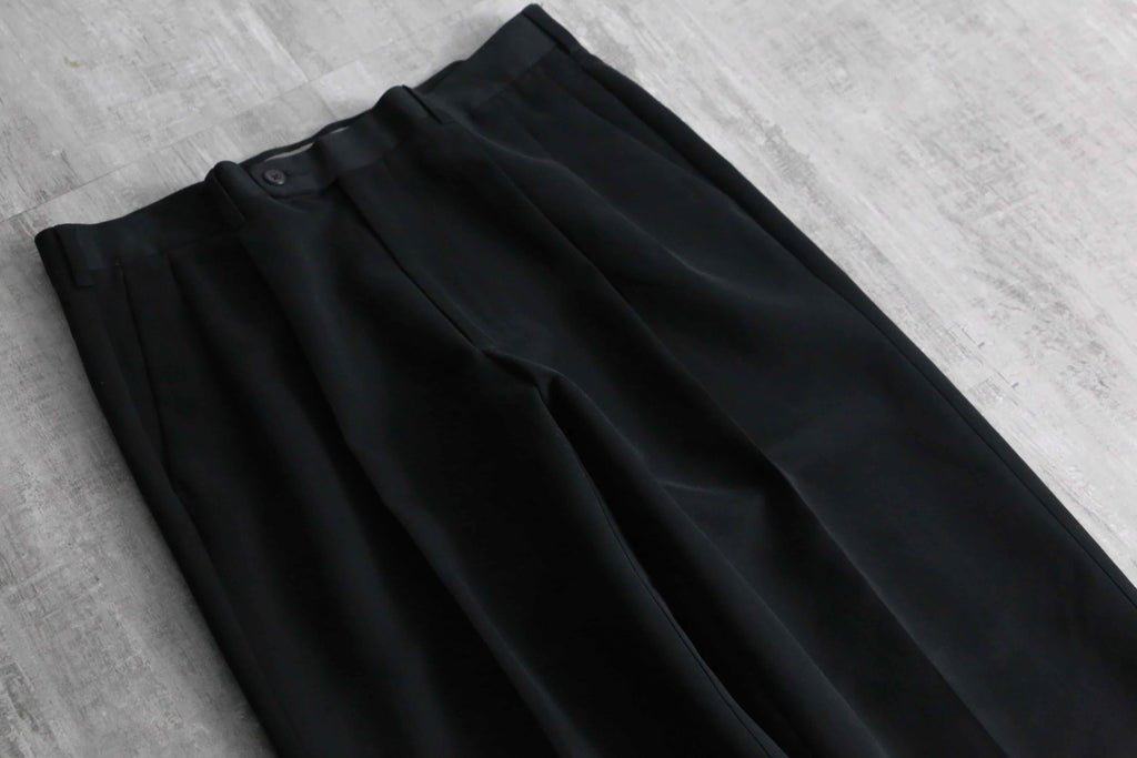 一般的な化繊のスラックスとは一線を画す、デザイナーズブランドらしい高級感と奥行きのある黒の色出しが魅力です。フロントはクラシックな2タック仕様。
