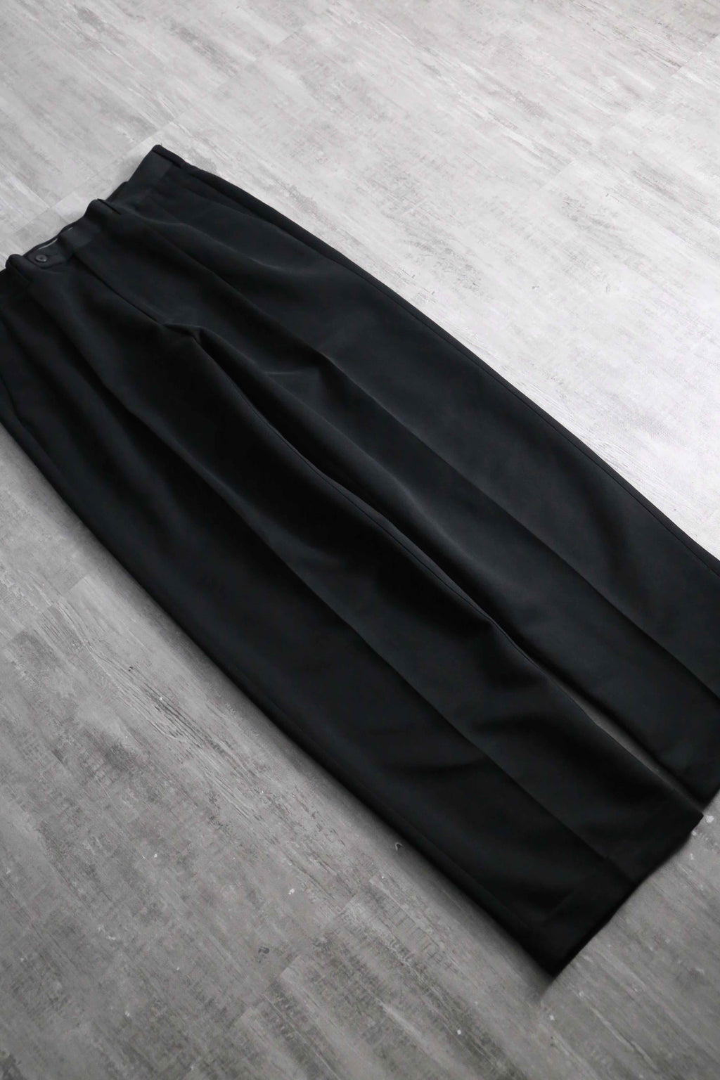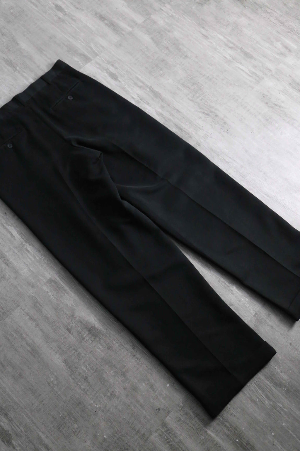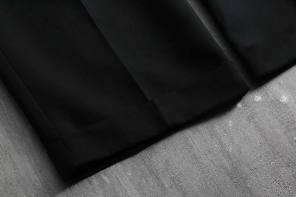 一般的な化繊のスラックスとは一線を画す、デザイナーズブランドらしい高級感と奥行きのある黒の色出しが魅力です。フロントはクラシックな2タック仕様。