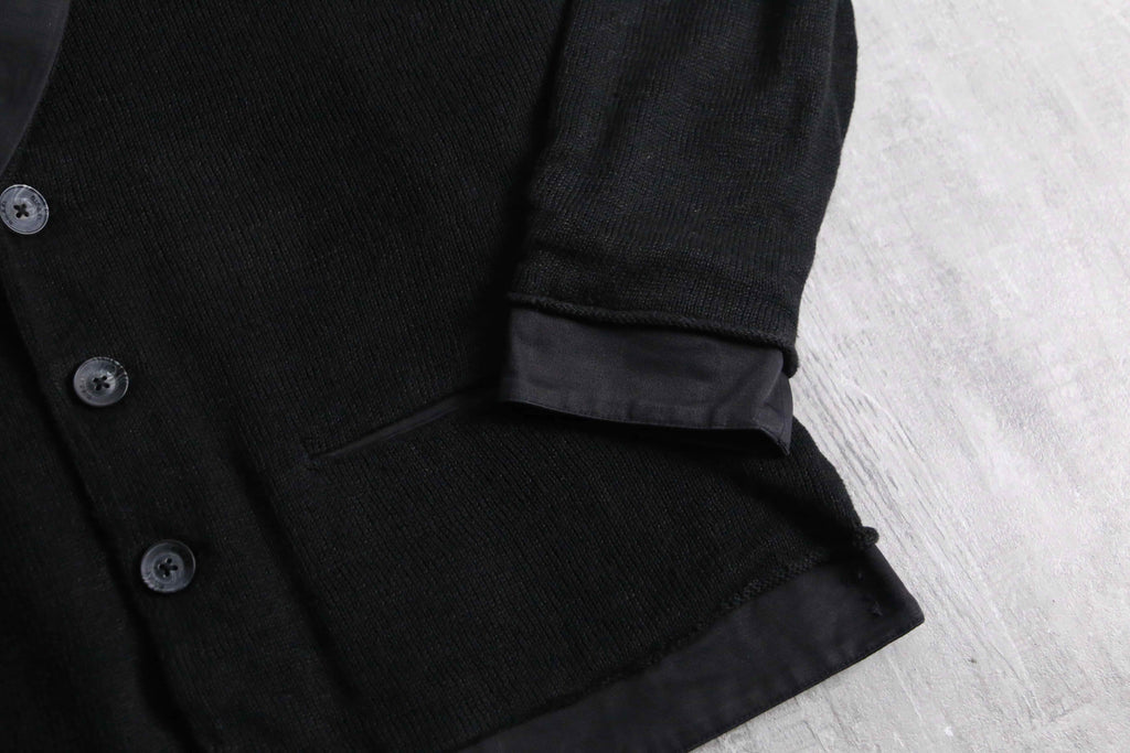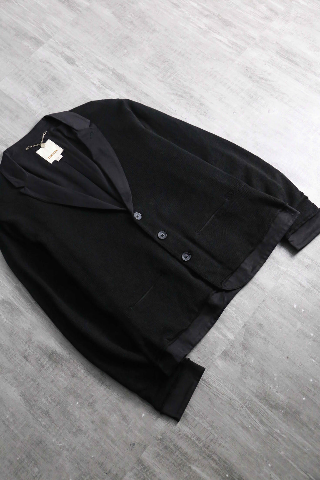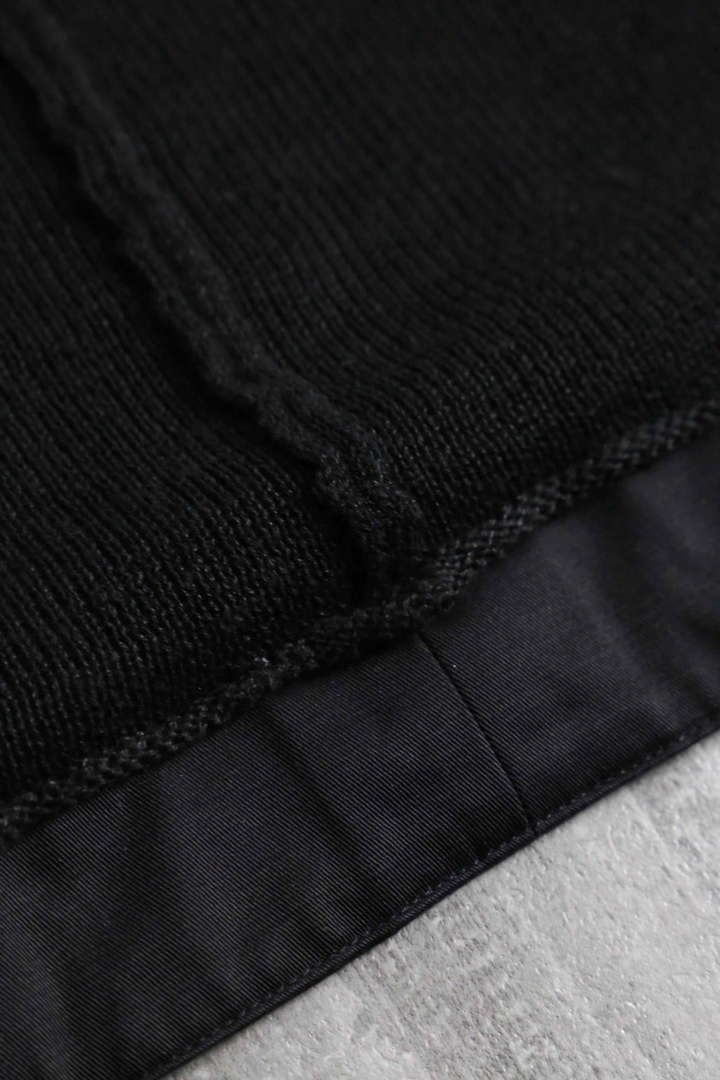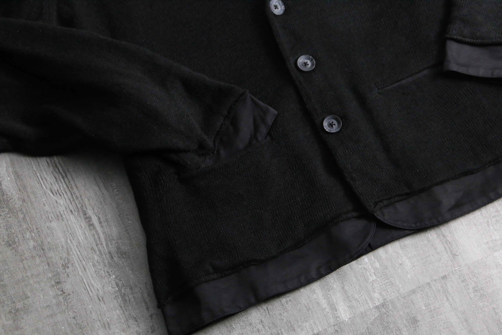 身頃に採用されたのは、肌にしなやかに馴染む上質なニット。その柔らかな質感に対し、ライニング、ラペル、ヘム、袖にかけて配された推定コットンナイロンのマットな布帛生地が、全体のシルエットに鋭い輪郭とモードな緊張感を与えています。一見するとミニマルな黒のジャケットですが、異素材が織りなす微細なコントラストが、光の加減で豊かな表情を見せてくれる逸品。