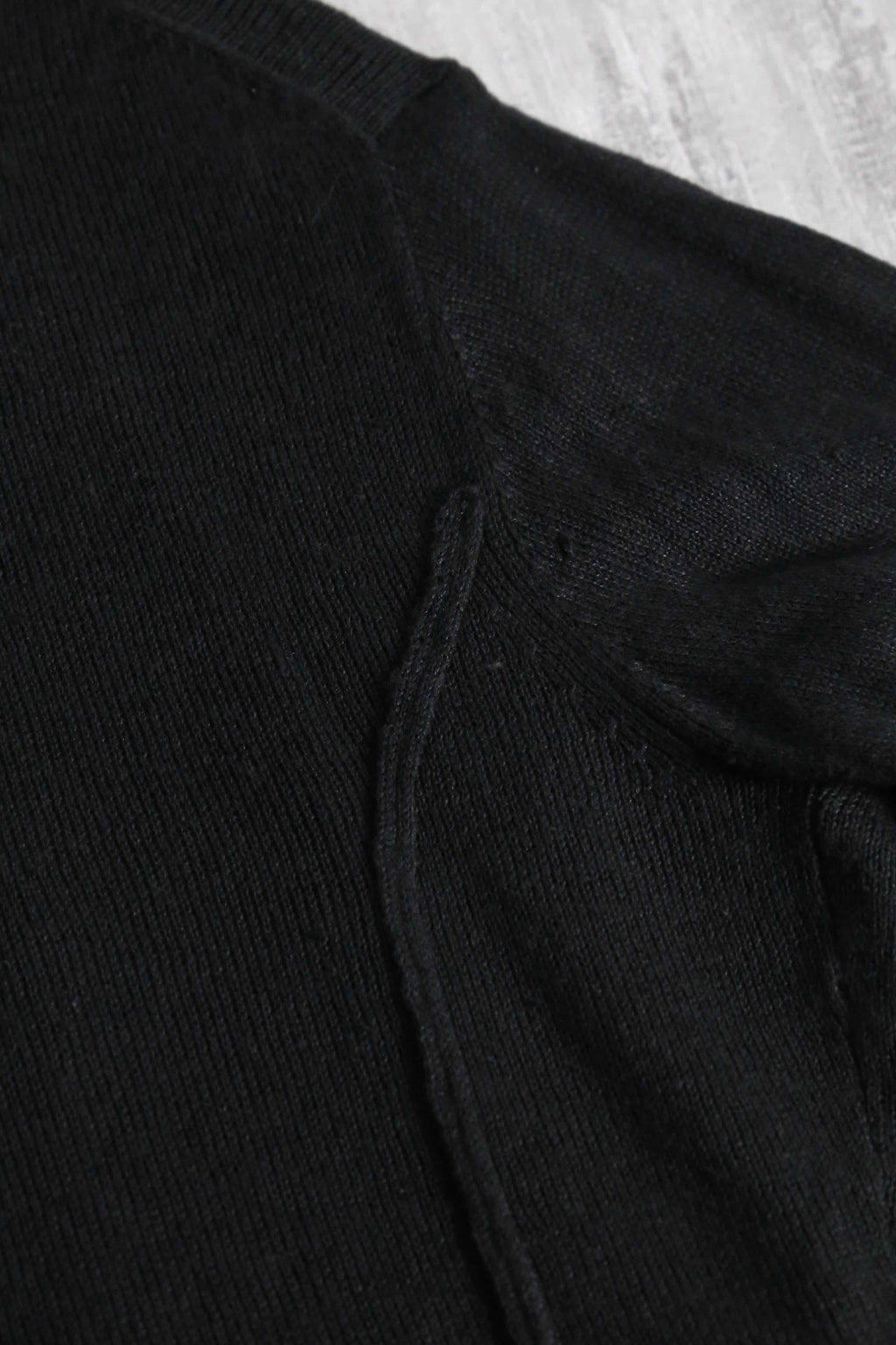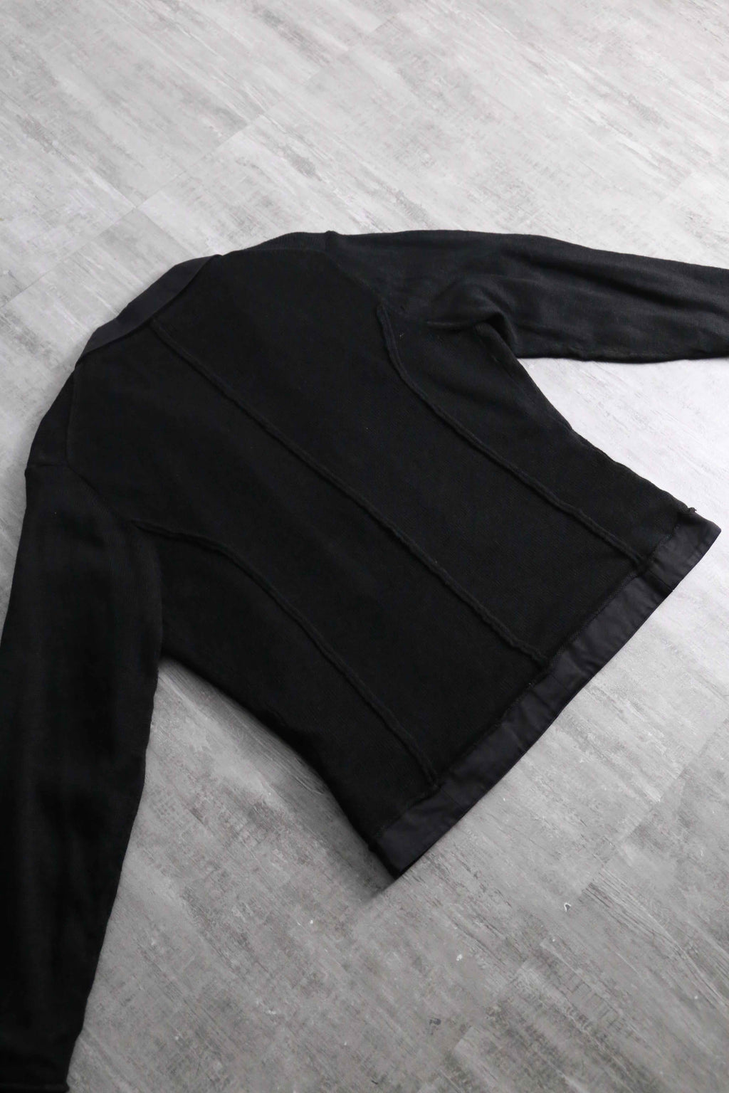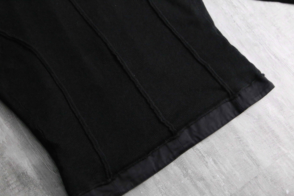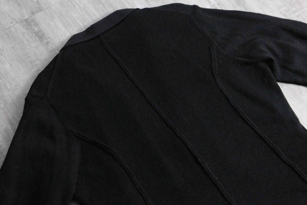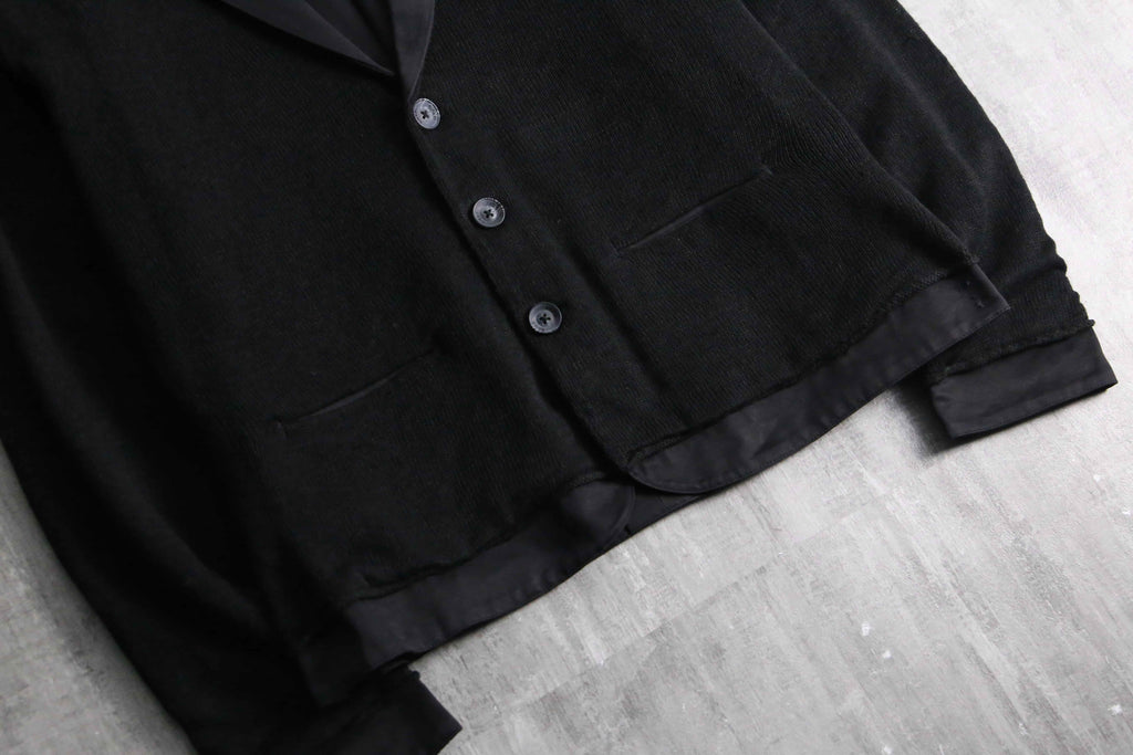 身頃に採用されたのは、肌にしなやかに馴染む上質なニット。その柔らかな質感に対し、ライニング、ラペル、ヘム、袖にかけて配された推定コットンナイロンのマットな布帛生地が、全体のシルエットに鋭い輪郭とモードな緊張感を与えています。一見するとミニマルな黒のジャケットですが、異素材が織りなす微細なコントラストが、光の加減で豊かな表情を見せてくれる逸品。