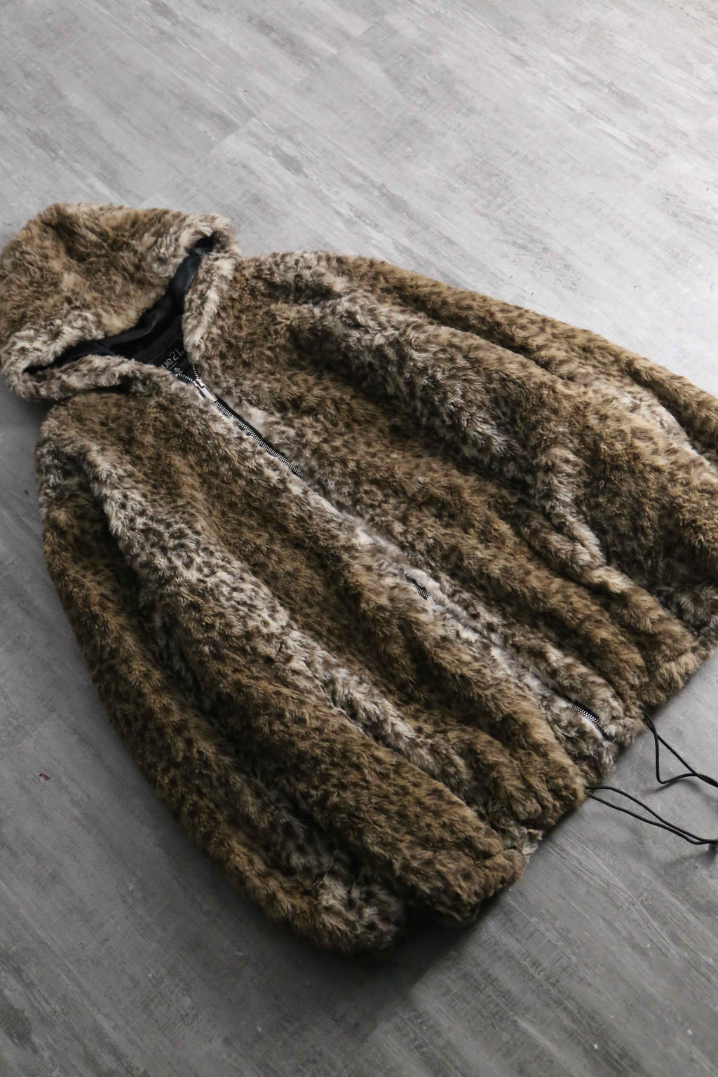 faux leopard fur zip up hooded jacket