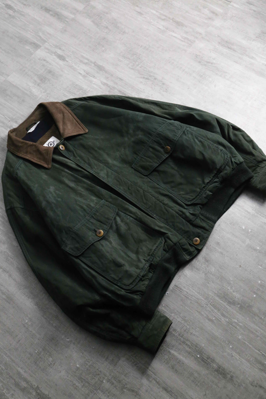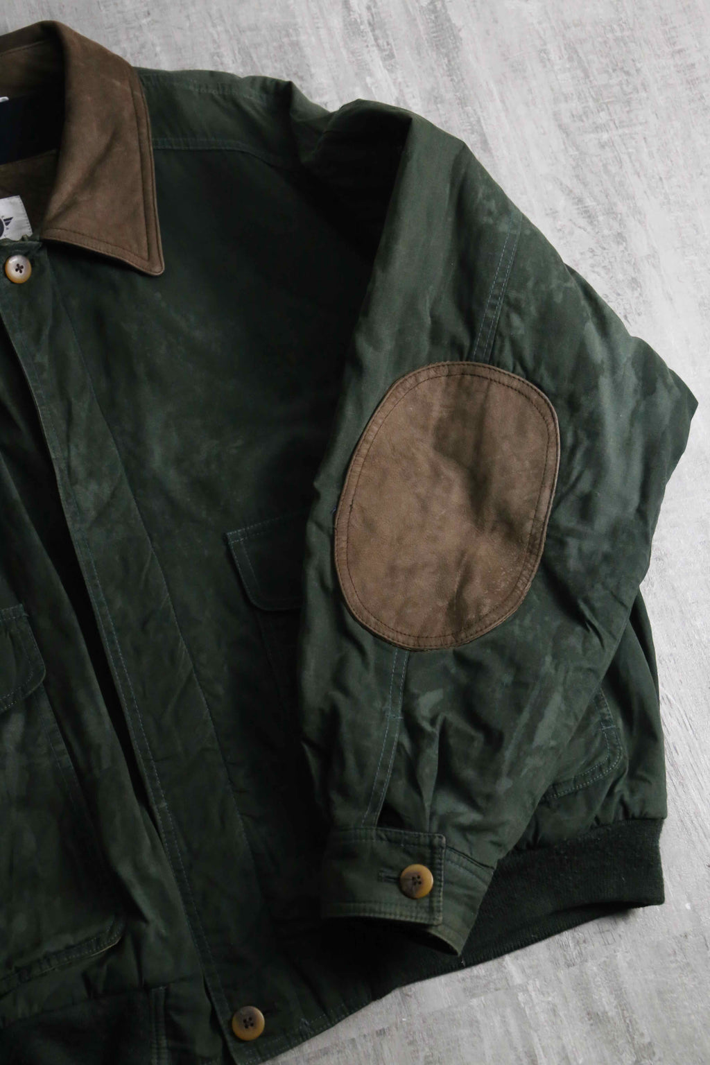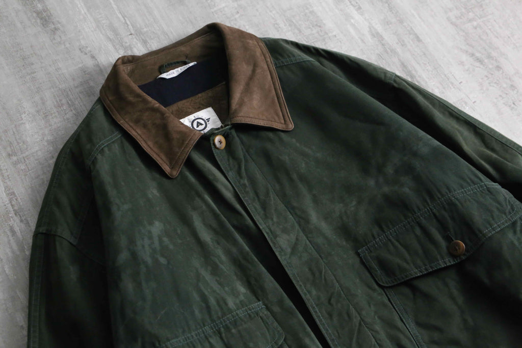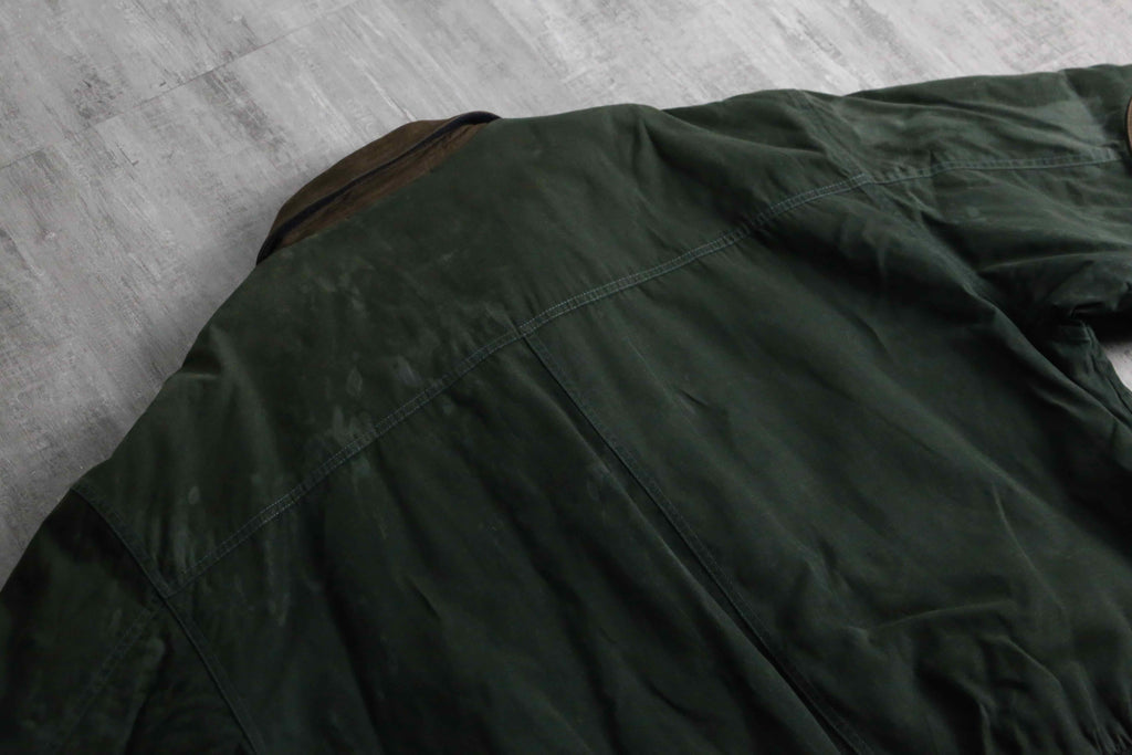 コリア製1980年代頃のものと推測されるアビエイタージャケット。深みのあるダークグリーンのボディをベースに、襟元とエルボーパッチには贅沢なリアルレザーを配し、クラシックなハンティングやミリタリーの要素を巧みにミックスした1着。