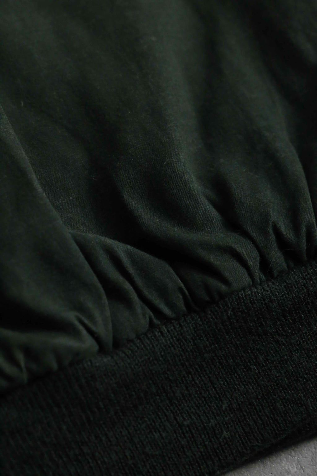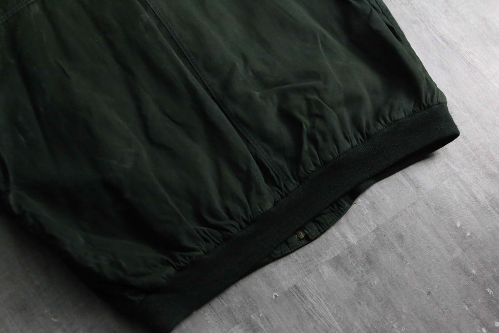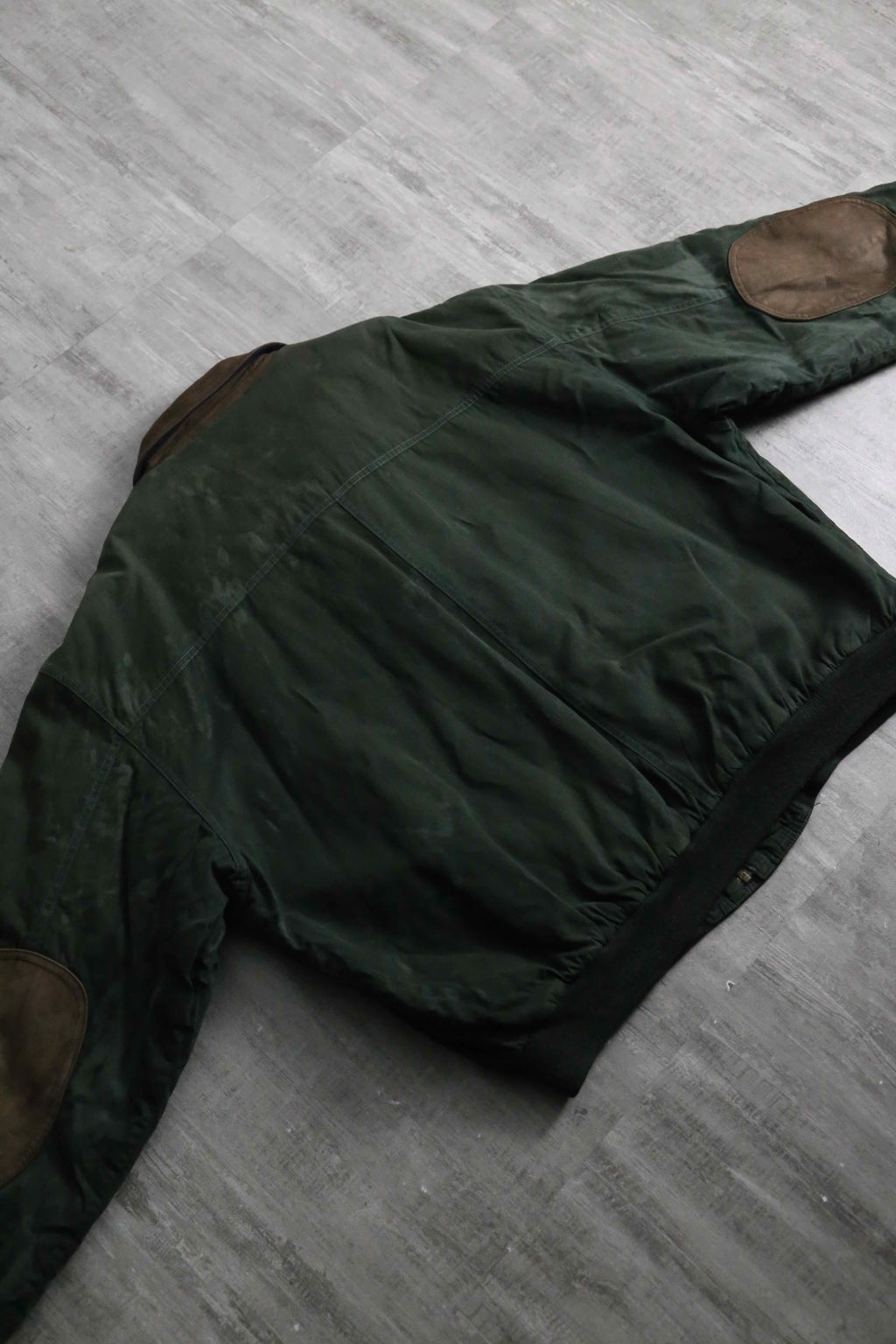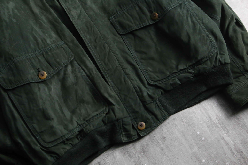 コリア製1980年代頃のものと推測されるアビエイタージャケット。深みのあるダークグリーンのボディをベースに、襟元とエルボーパッチには贅沢なリアルレザーを配し、クラシックなハンティングやミリタリーの要素を巧みにミックスした1着。