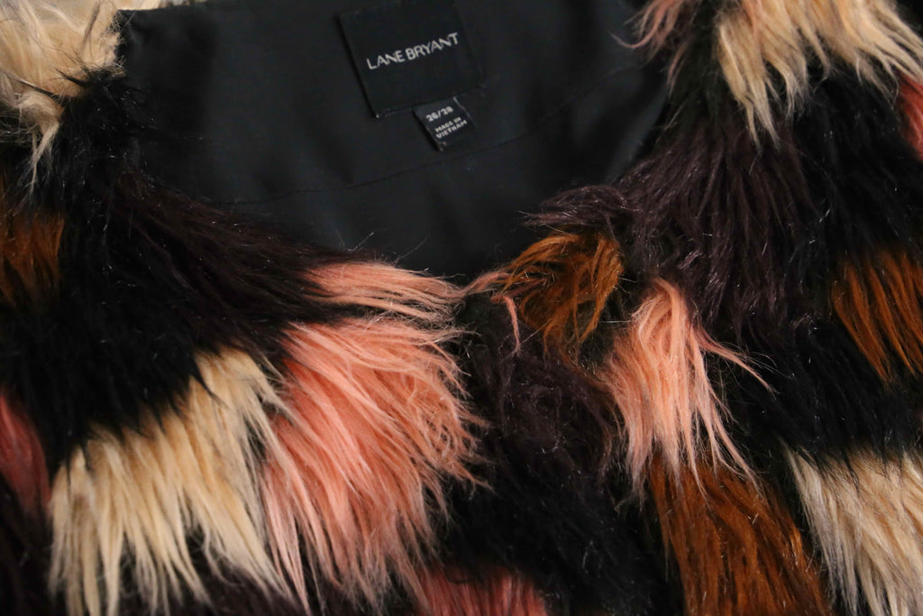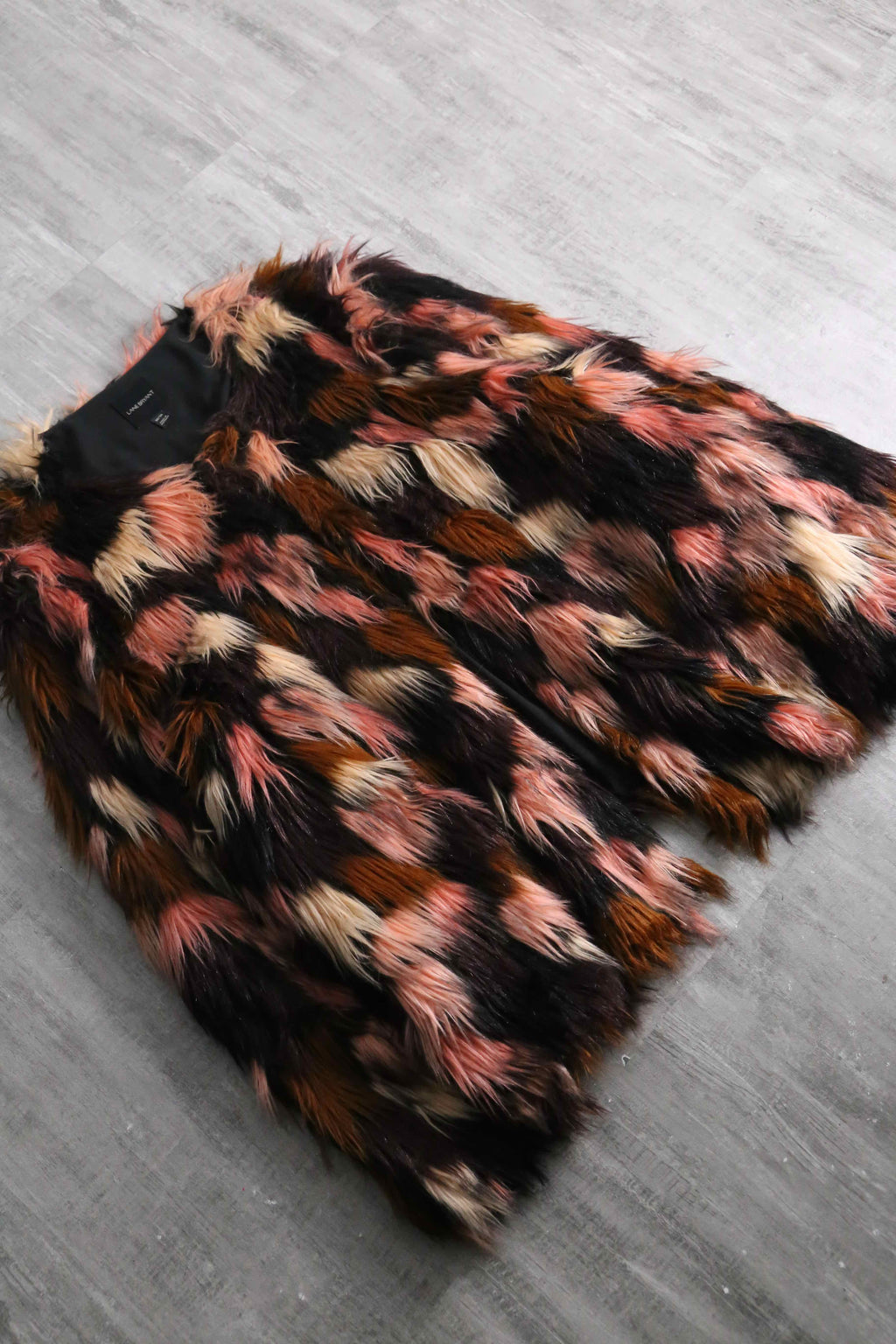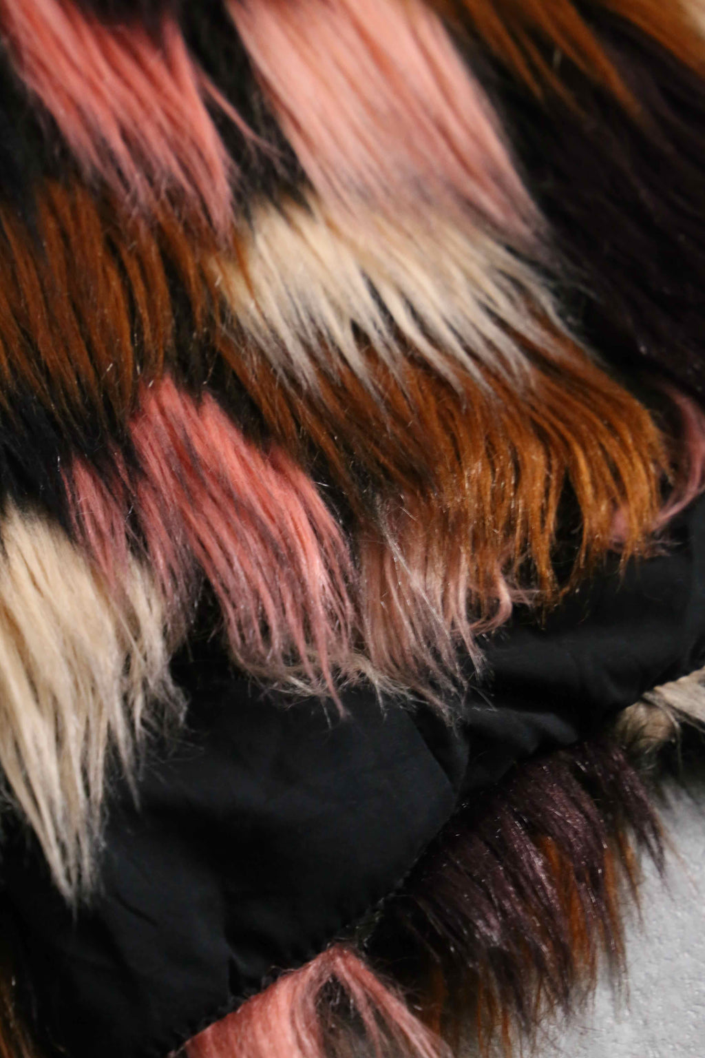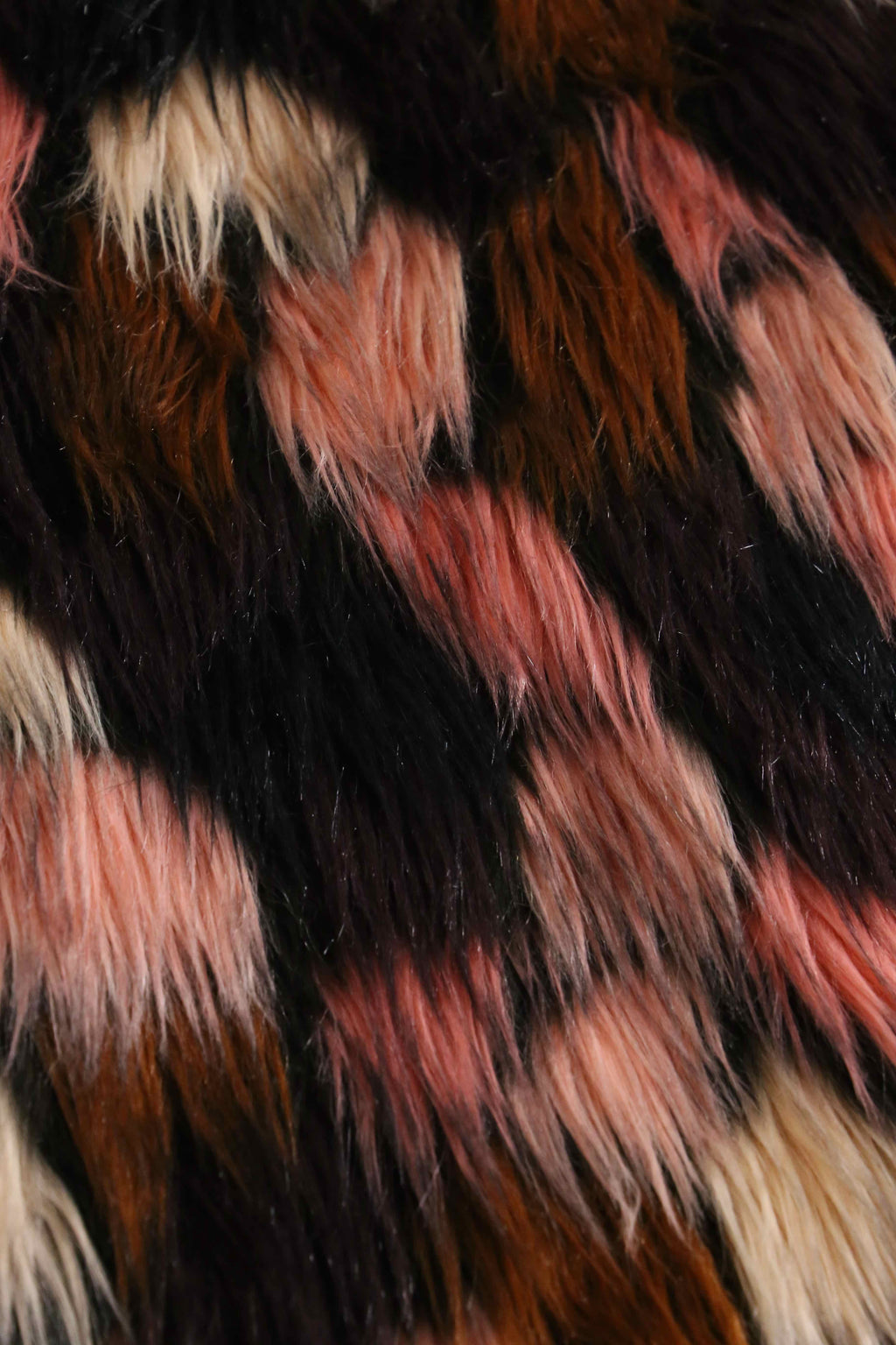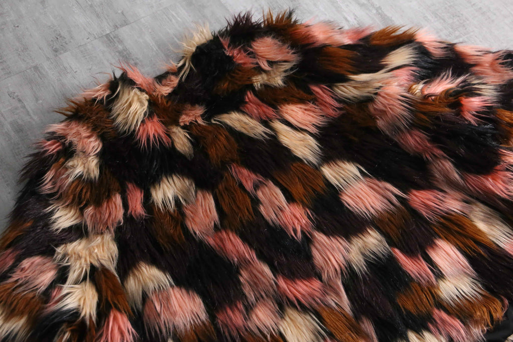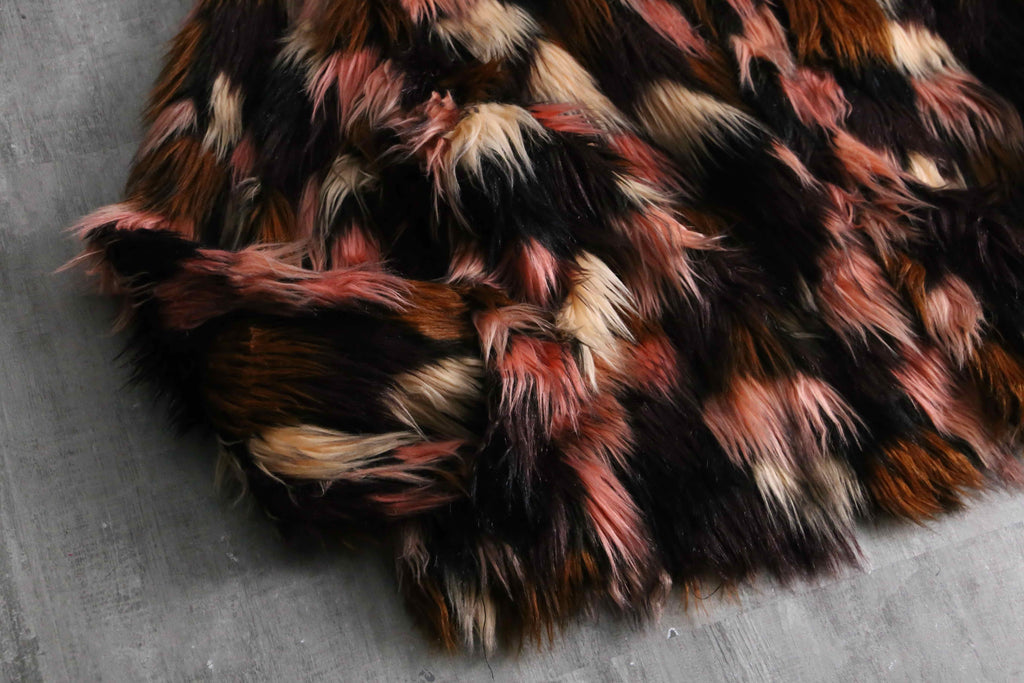 70年代のボヘミアンスタイルを彷彿とさせるピンクやブラウン、クリームを基調とした鮮やかなマルチカラー配色と、毛足の長いボリューミーなシャギー素材が圧倒的な存在感を放つ、ノーカラーで洗練された印象のファッショナブルな1着。ブラックやブラウン系が多い中で鮮やかなカラーリングに惹かれます。