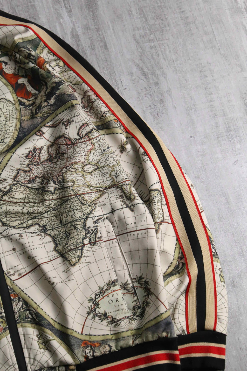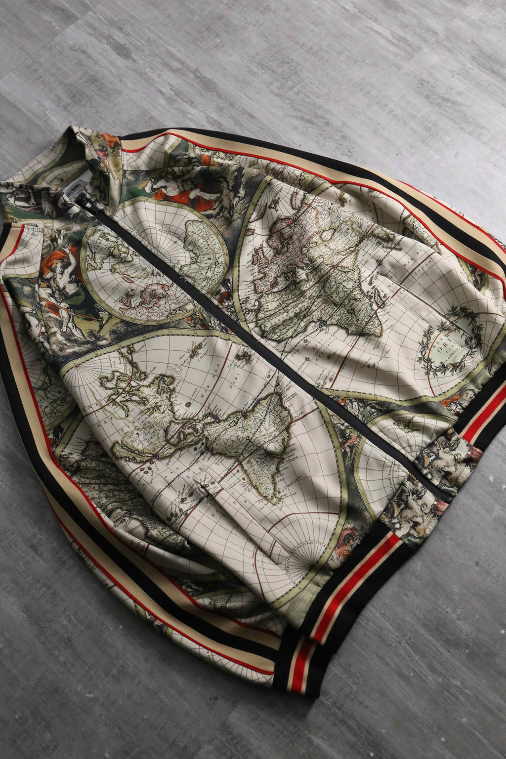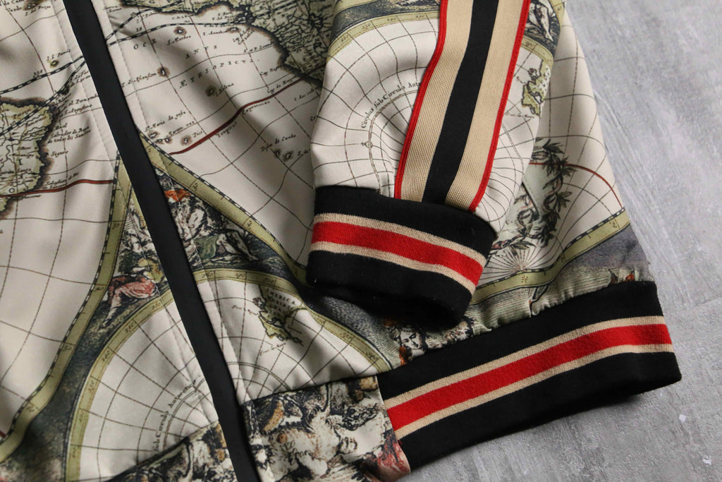 17世紀前後の古地図を彷彿とさせる、円形の半球図(ヘミスフィア)や神話的な画が緻密な総柄で表現されており、スポーツウェアの枠を超えて、1枚の絵画を纏うような圧倒的な芸術性と存在感。首元や袖、裾に施されたマルチカラーラインのリブと、袖のサイドラインが、クラシックなスポーティーさと共に全体のデザインをシャープに引き締める絶妙なアクセント。GUCCIにも似たラグジュアリーな遊び心と、現行品にはない唯一無二の空気感を凝縮した逸品です。