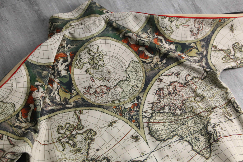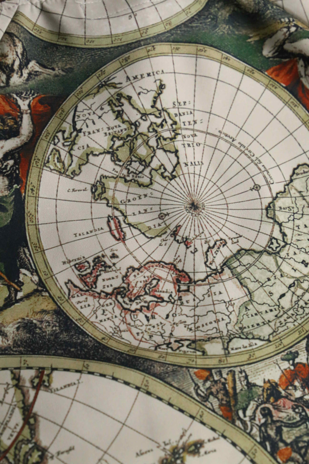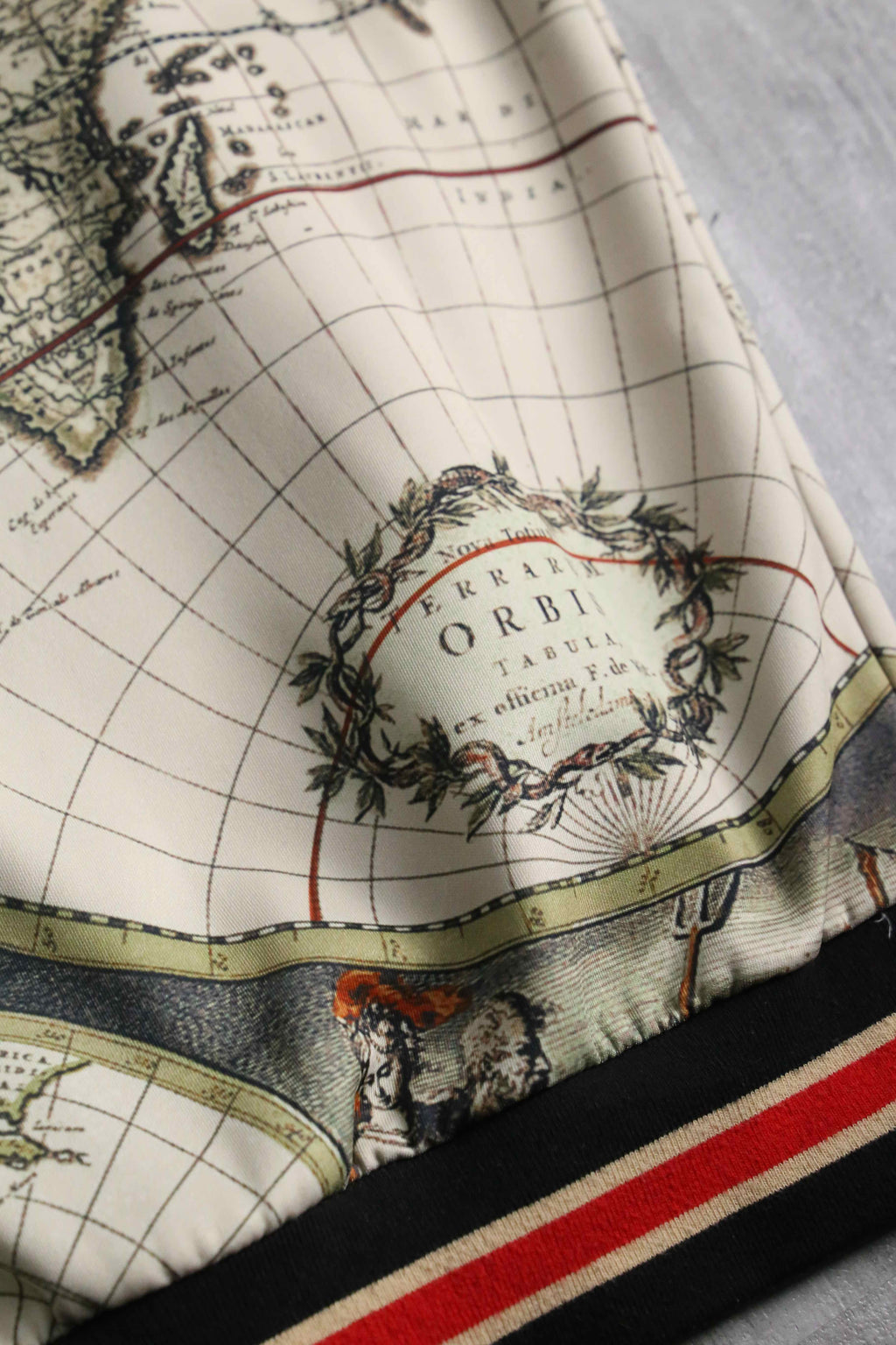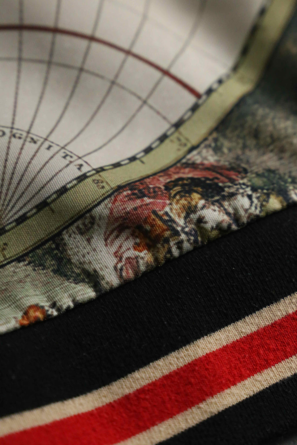 17世紀前後の古地図を彷彿とさせる、円形の半球図(ヘミスフィア)や神話的な画が緻密な総柄で表現されており、スポーツウェアの枠を超えて、1枚の絵画を纏うような圧倒的な芸術性と存在感。首元や袖、裾に施されたマルチカラーラインのリブと、袖のサイドラインが、クラシックなスポーティーさと共に全体のデザインをシャープに引き締める絶妙なアクセント。GUCCIにも似たラグジュアリーな遊び心と、現行品にはない唯一無二の空気感を凝縮した逸品です。