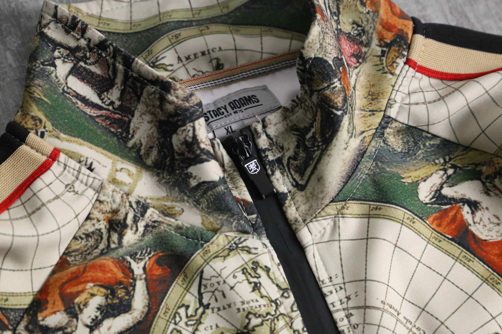 1875年創業の老舗でありジャズ黄金時代のミュージシャンや後のヒップホップ・カルチャーにおいて不動の支持を集めてきたSTACY ADAMS。スペシャルと呼ぶに相応しい、ヴィンテージの世界地図が全面に描かれたトラックジャケットの入荷。