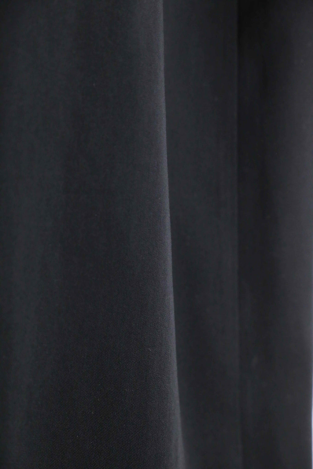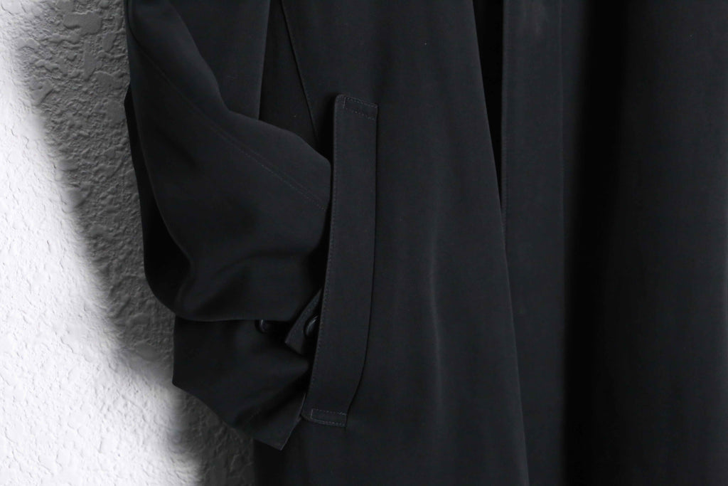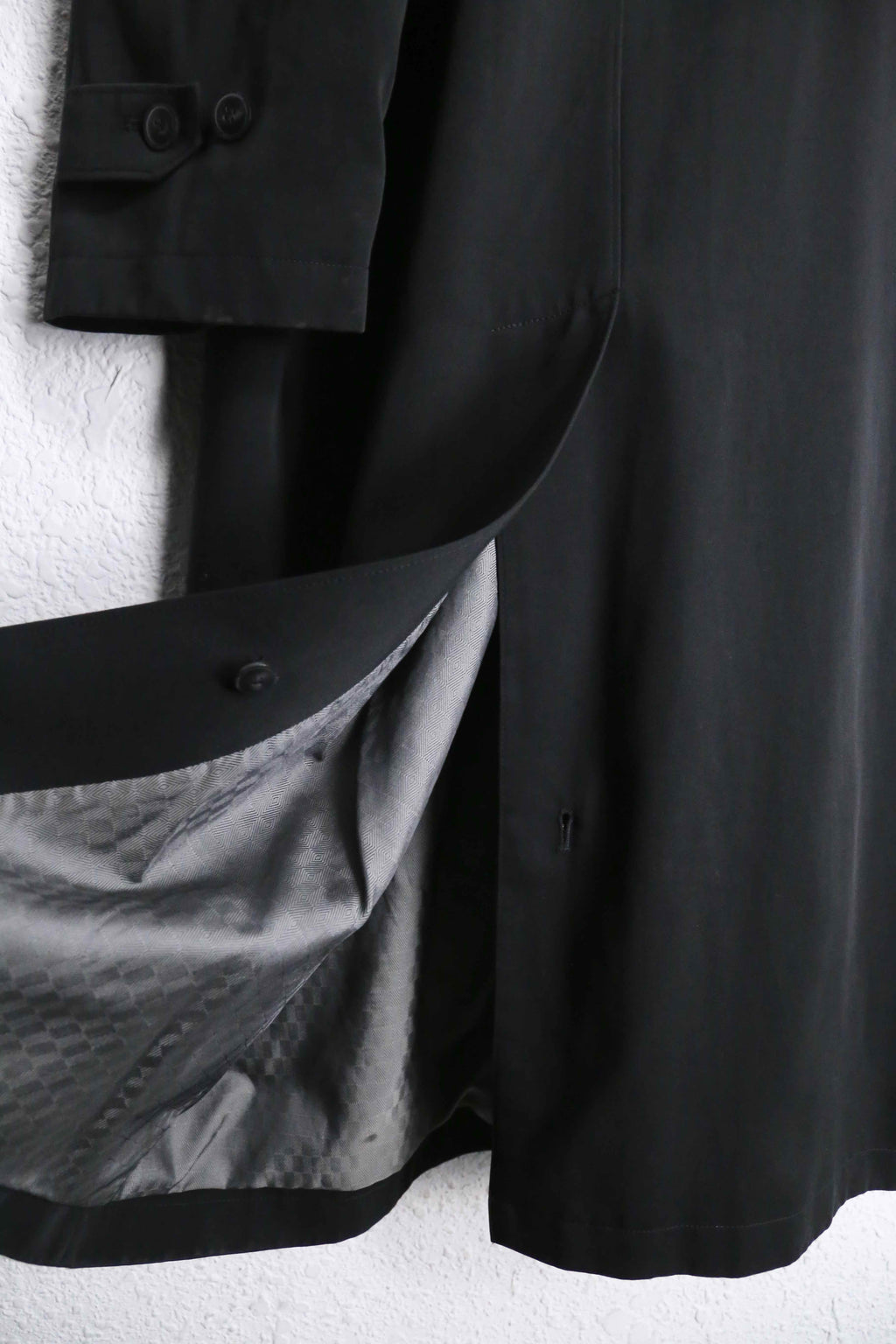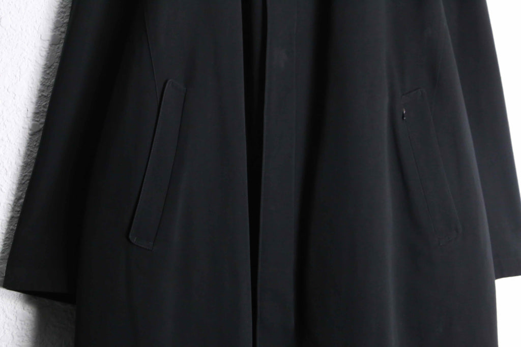 作り込みの良さが際立つ80〜90年代頃の希少なヴィンテージ品と推測され、こちらの個体ライナー欠損ではあるものの、その分軽やかな着心地で、春先や秋口のメインアウターとして品よく羽織れる汎用性の高い1着。比翼仕立て、ラグランスリーブ、ベルト無し、ライナー付きのシンプルかつソリッドなルックス。着丈は122cmとロングコートとして運用するには申し分のない丈感。防寒性こそ薄いものの、黒ロングコートとしてはとてもいい条件が揃っています。