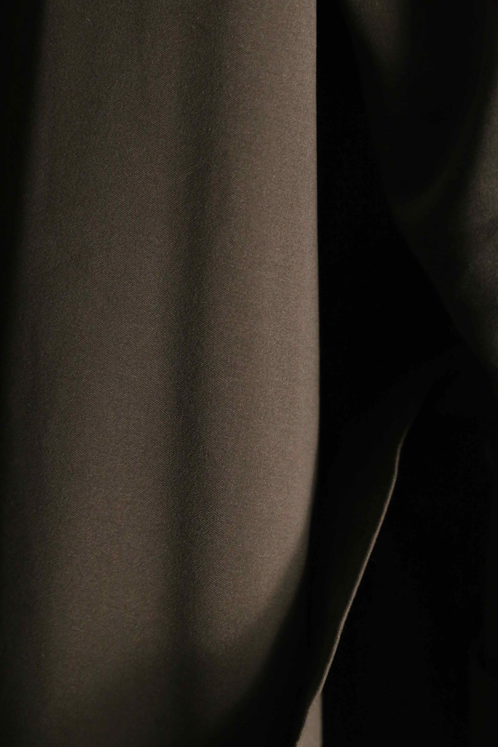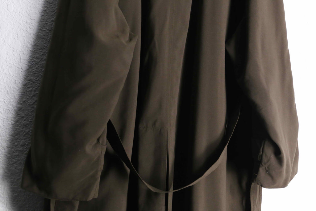 特筆すべきはやはり、30年近い歳月を経ながらも、欠損しがちなウール素材の付け襟、防寒性を高めるフルライナー、そしてシルエットに変化をもたらすウエストベルトがすべて当時のまま現存しているという価値の高さ。さらに50Rという規格外の特大サイズがもたらす重厚な生地の分量感は、現代のオーバーサイジングの概念を凌駕するほどにダイナミックで、歩くたびに空気を孕んで揺れ動く優雅なAラインのドレープは、まさに当時のラルフローレンが描いたアメリカンラグジュアリーを体現します。
