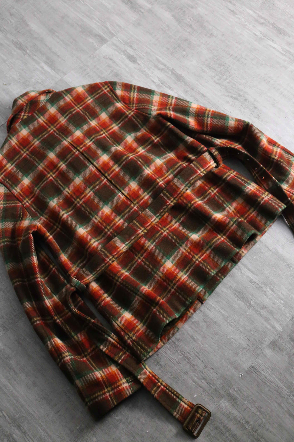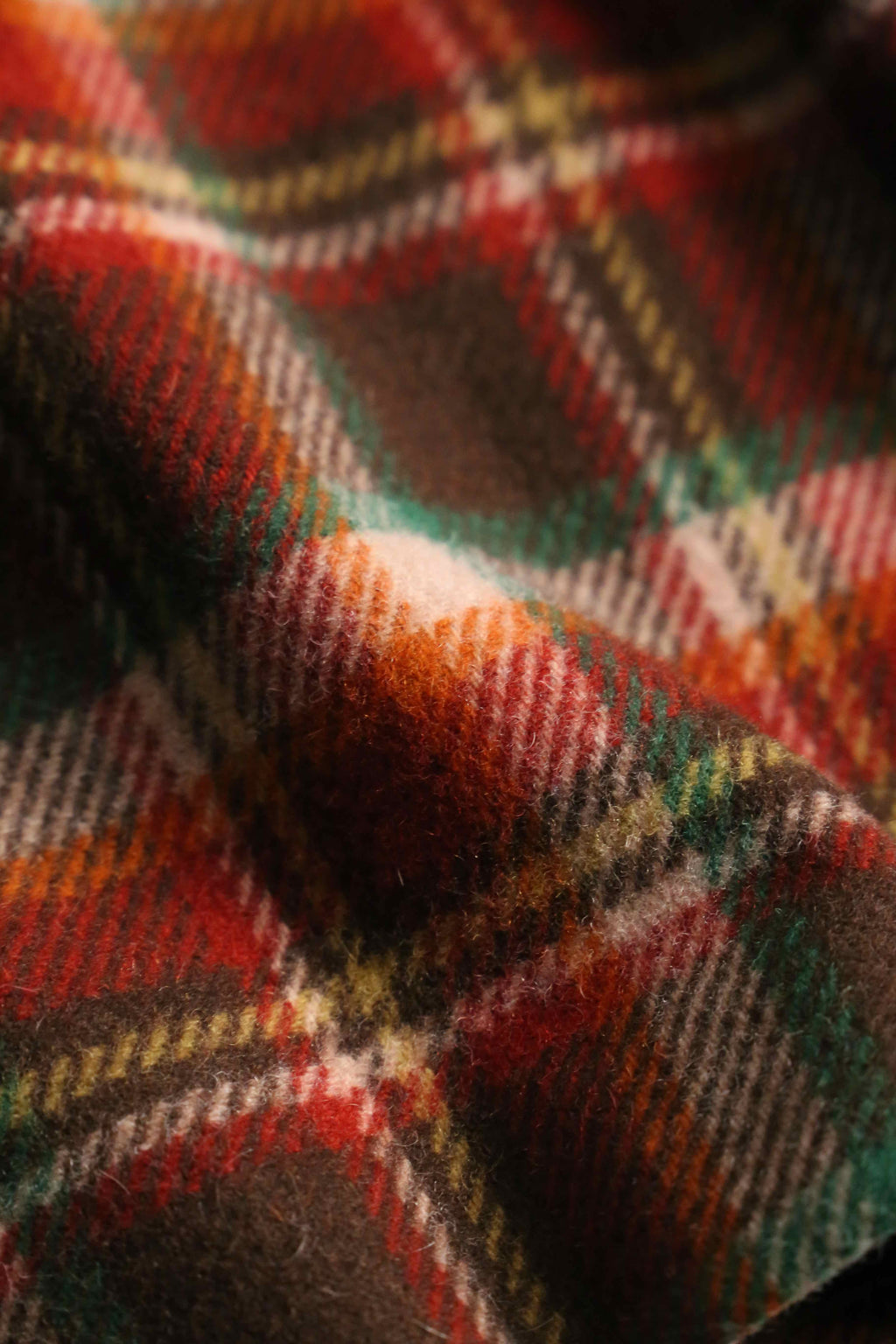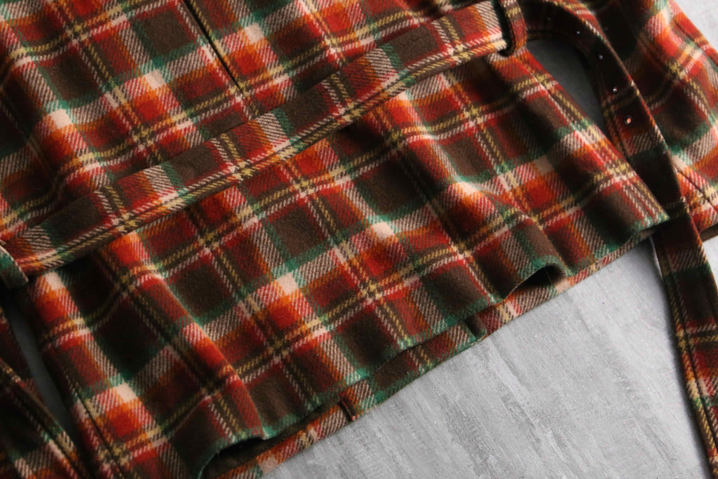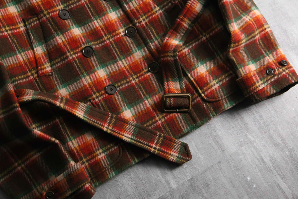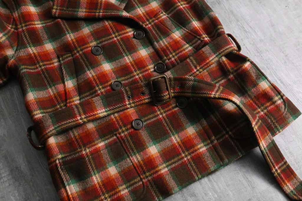 肉厚で重厚感のある上質なメルトンウールが採用されており、ブラウンを基調にレッドやグリーンを交差させた暖かみのあるタータンチェック柄が、カントリーライクでありながらも洗練されたブリティッシュトラッドの雰囲気を醸し出しています。レディース仕様の左前となるダブルブレスト仕立てで、広めのラペルが顔周りにクラシカルな印象を与えつつ、ウエスト部分には同素材のバックル付きベルトが付属しているため、Pコート特有のボックスシルエットをシェイプして、より構築的でうつラインを演出することが可能です。また、背面に施された深めのインバーテッドプリーツは、厚手の生地でありながらも裾に向かって立体的な広がりが生まれ、着用時の可動域を確保すると同時に、バックスタイルに優雅なドレープと動きを加える機能美を兼ね備えた設計。
