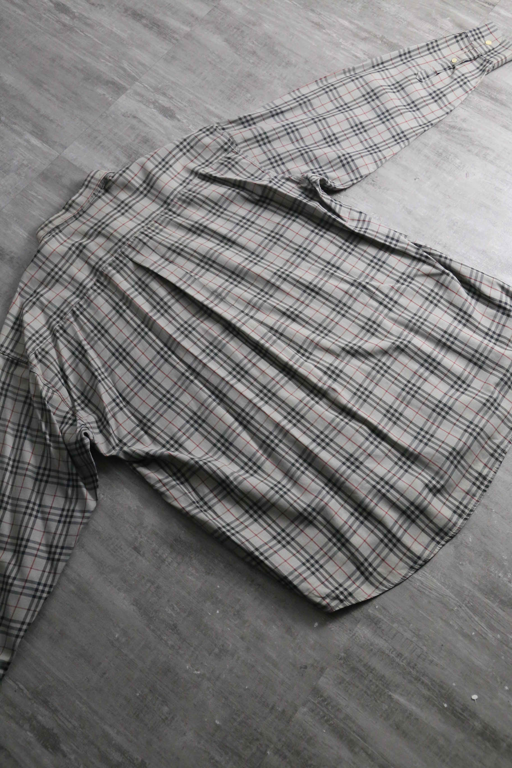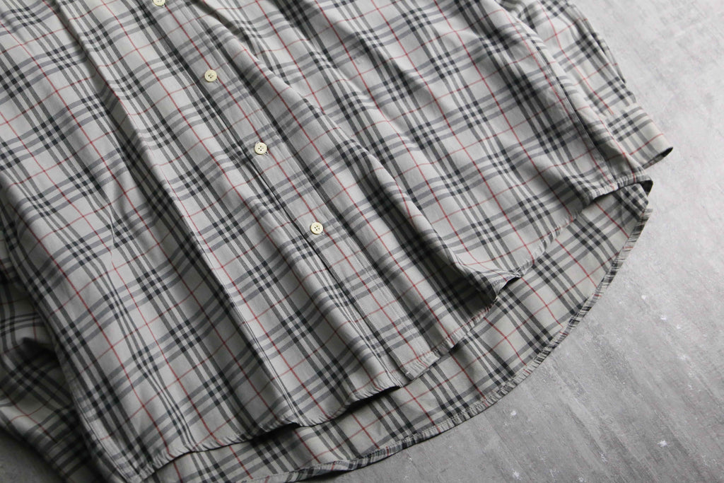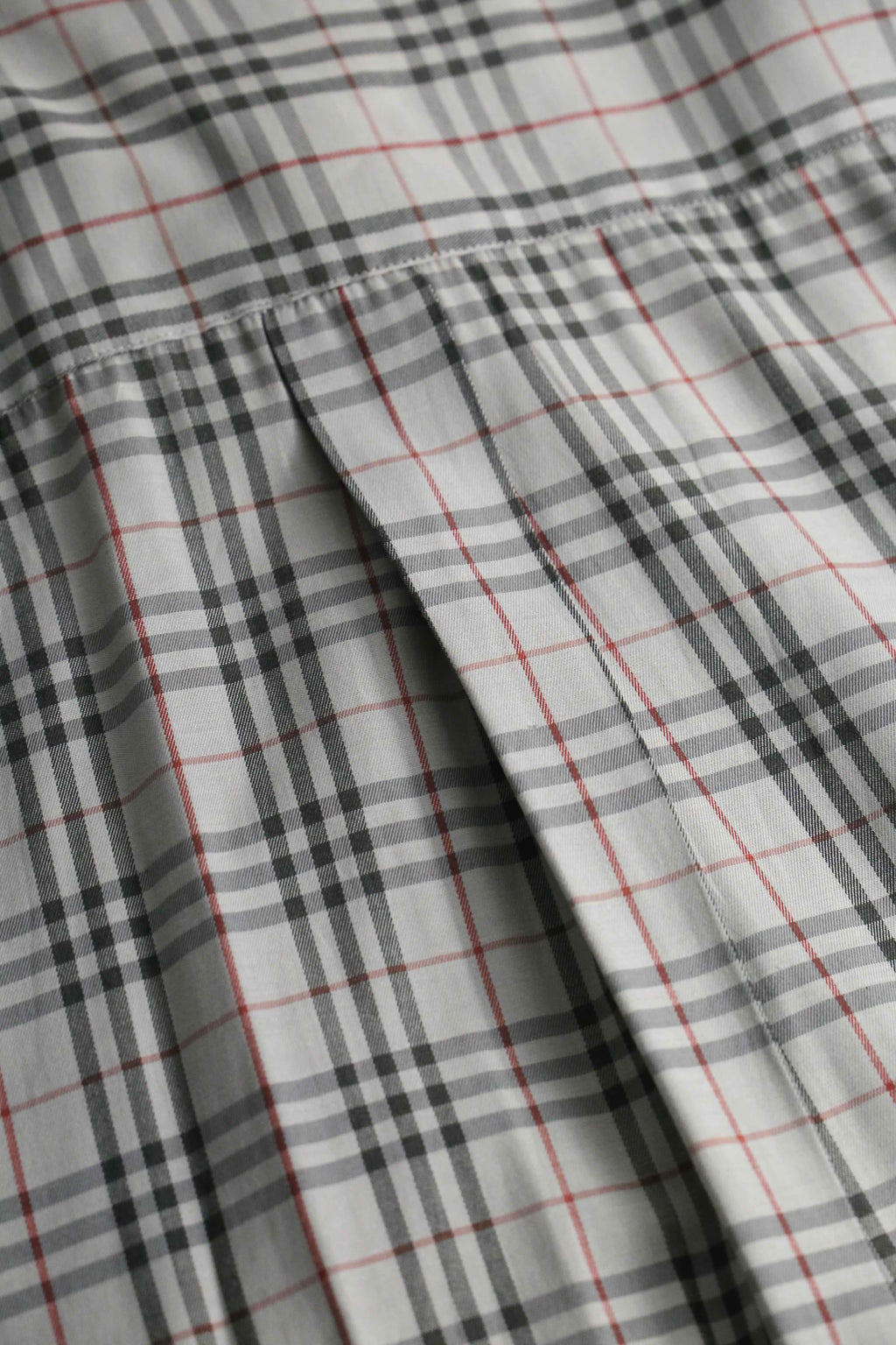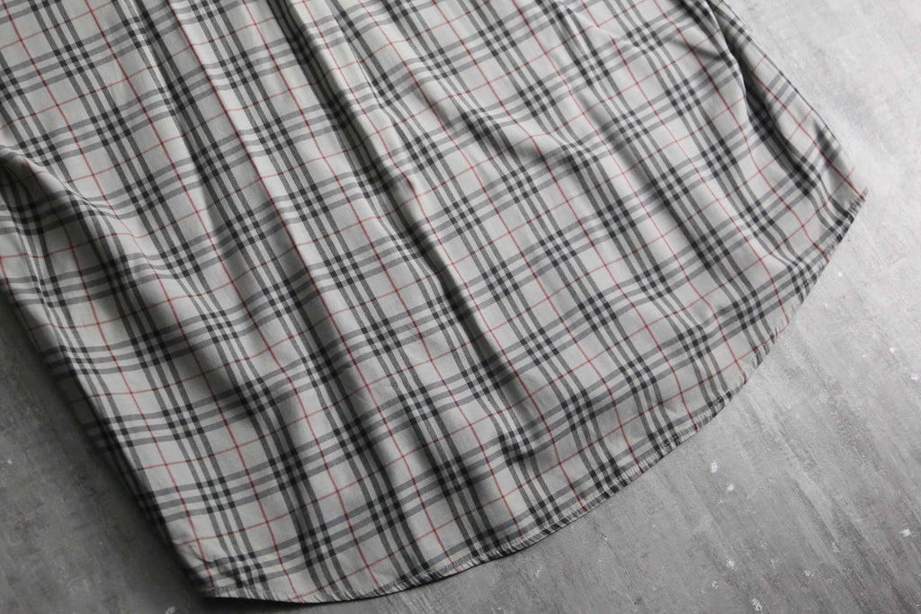 Burberryを象徴するノバチェック柄を、落ち着いたグレー基調の配色で仕上げたコットンツイルシャツ。肌馴染みの良い柔らかな質感と程よいハリ感を兼ね備え、胸ポケットにさりげなく施されたナイトロゴ刺繍と洗練されたボタンダウンカラーのディテールが、英国ブランドらしい気品と都会的なムードを演出するタイムレスな逸品。